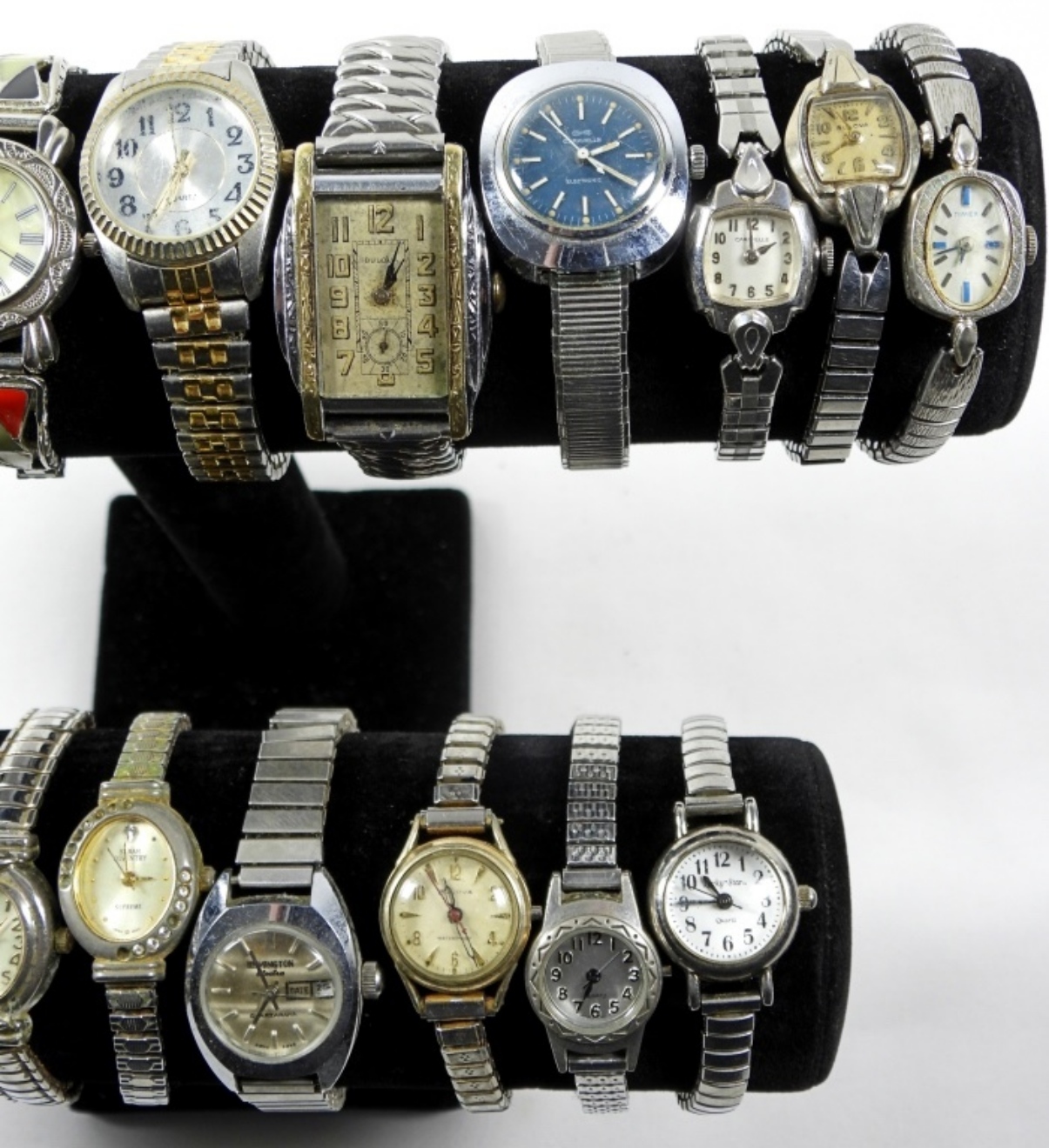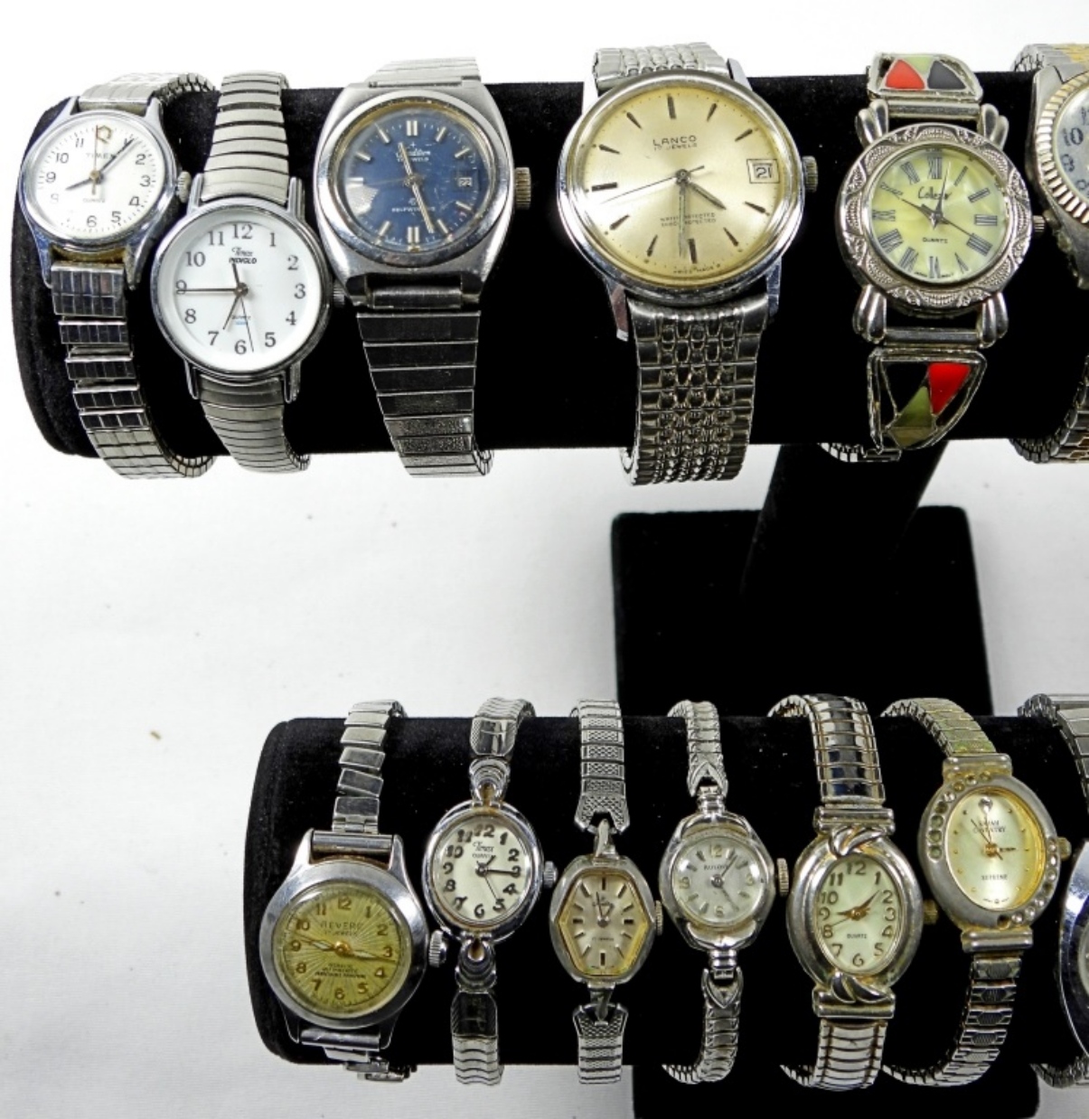 20 ASSORTED LADIES VINTAGE STRETCH WATCHES IN SILVER TONES. WATCHES UNTESTED/BRANDS UNVERIFIED.