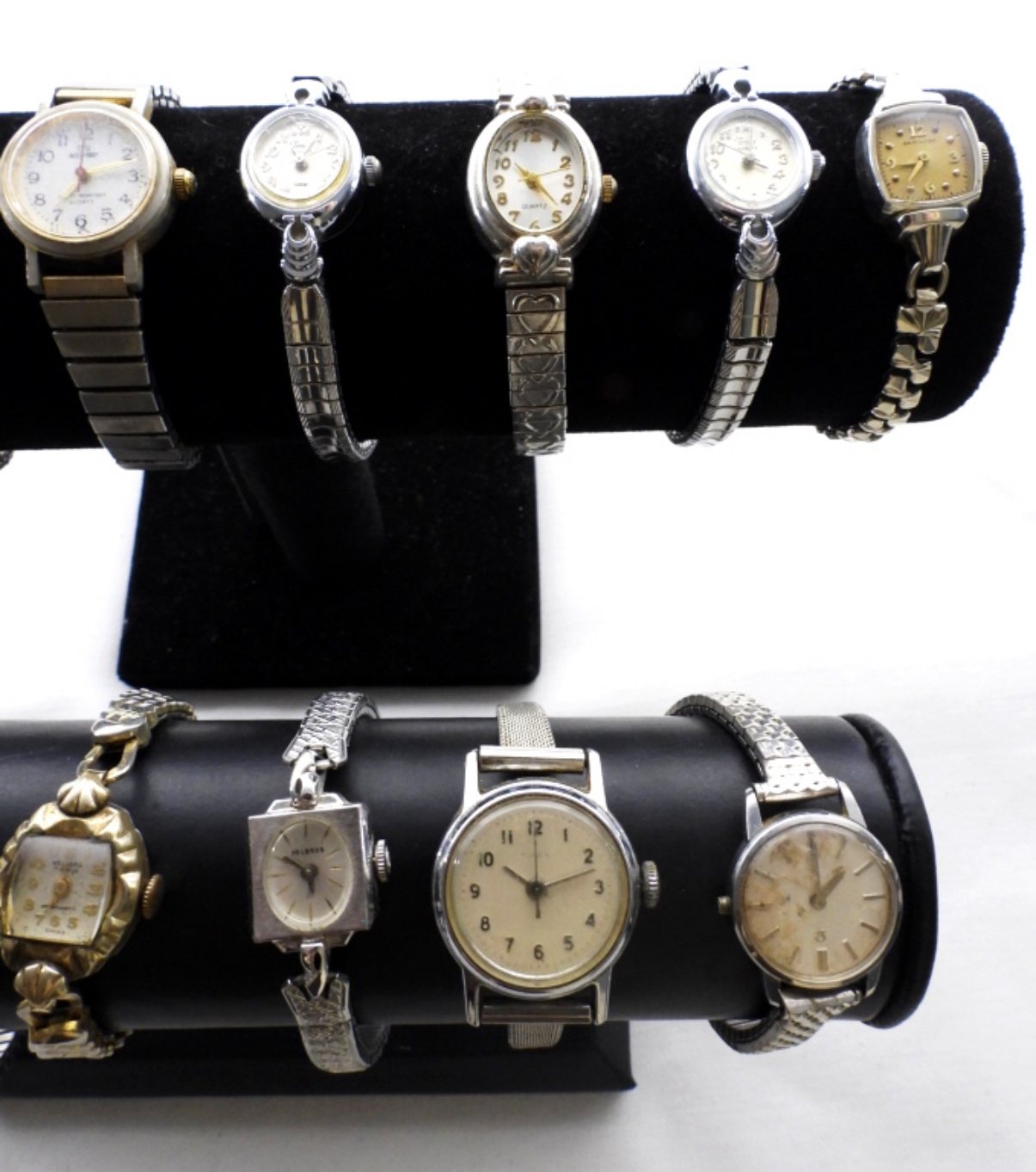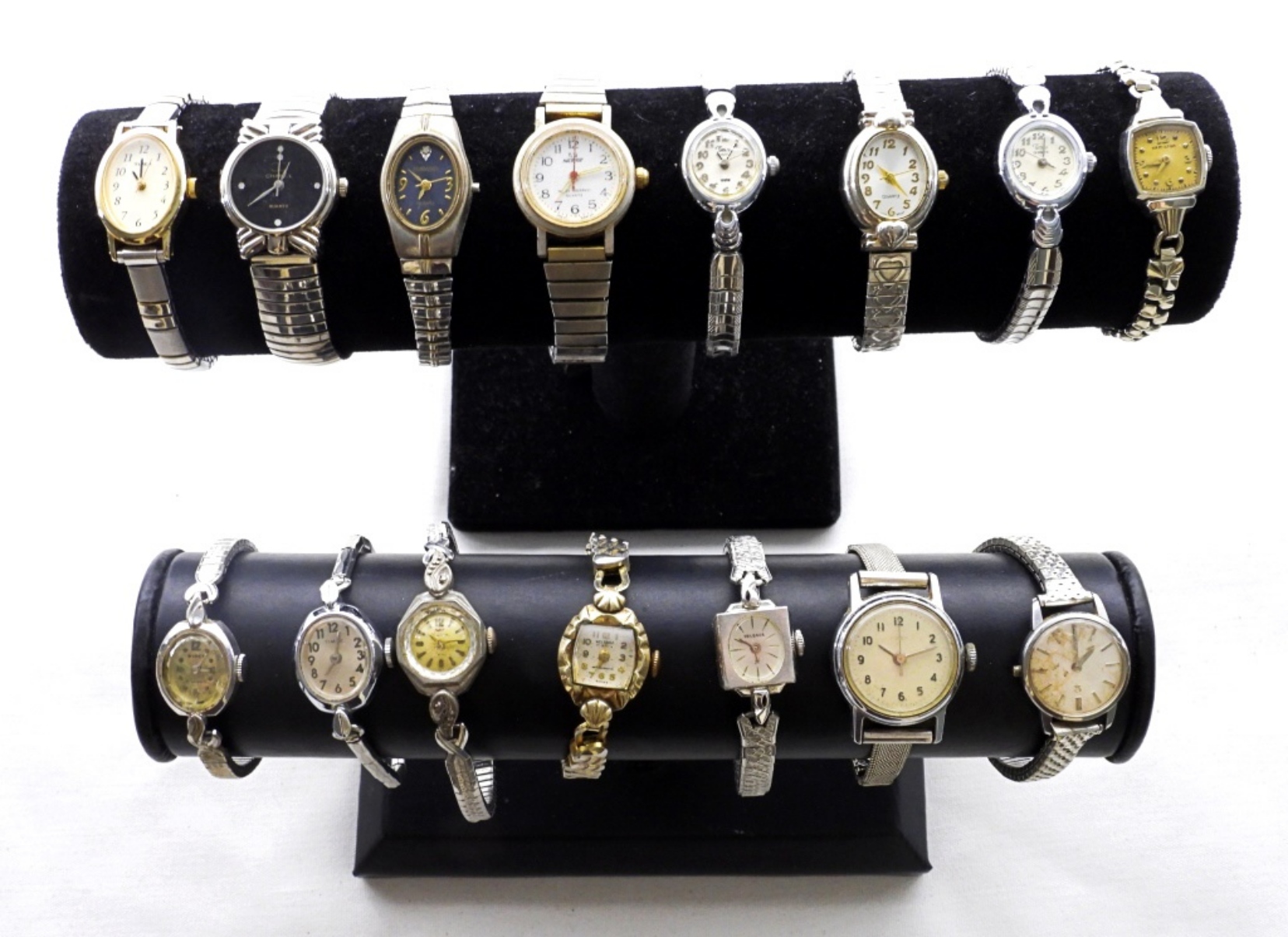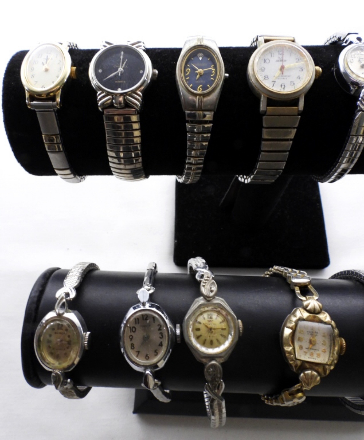 15 ASSORTED LADIES SILVER TONE STRETCH WATCHES. WATCHES UNTESTED/BRANDS UNVERIFIED.