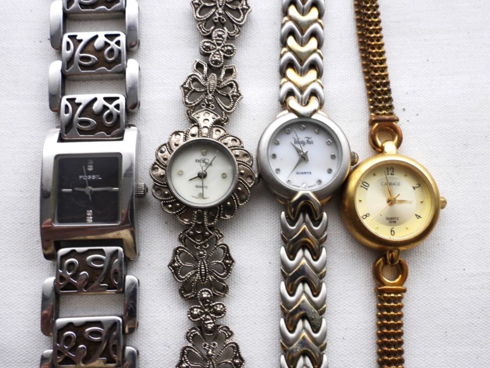 7 ASSORTED UNIQUE LADIES FASHION WATCHES. WATCHES UNTESTED/BRANDS UNVERIFIED. SOME BRANDS INCLUDE: FOSSIL, CARRIAGE, VANITY FAIR AND MORE!