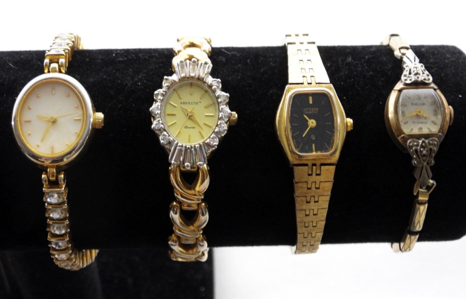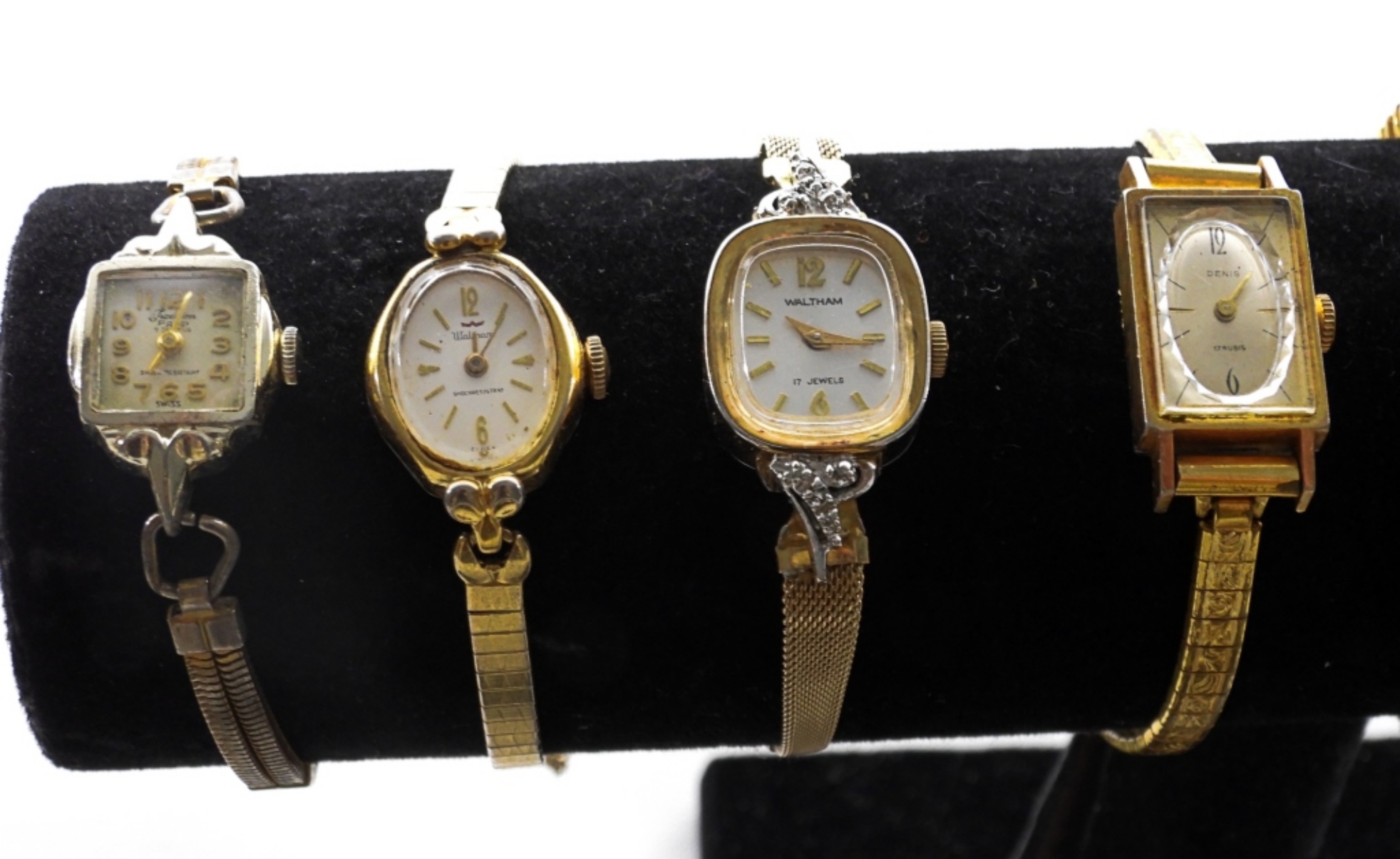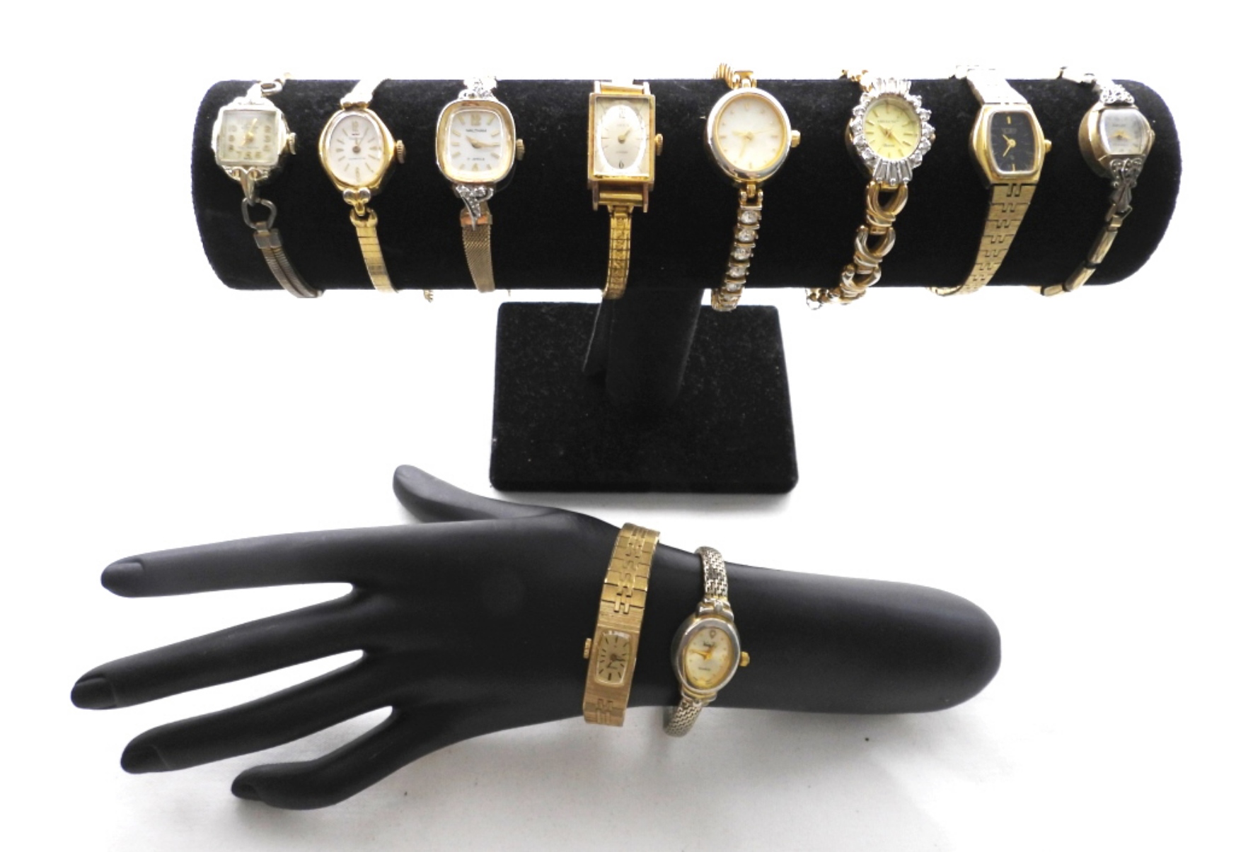 10 ASSORTED LADIES GOLD TONE DAINTY WATCHES WITH SMALL WATCH FACES. WATCHES UNTESTED/BRANDS UNVERIFIED.