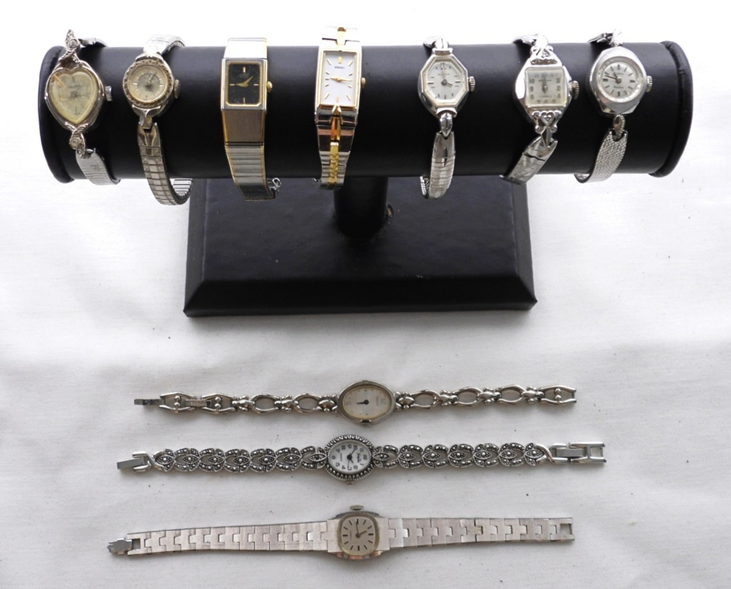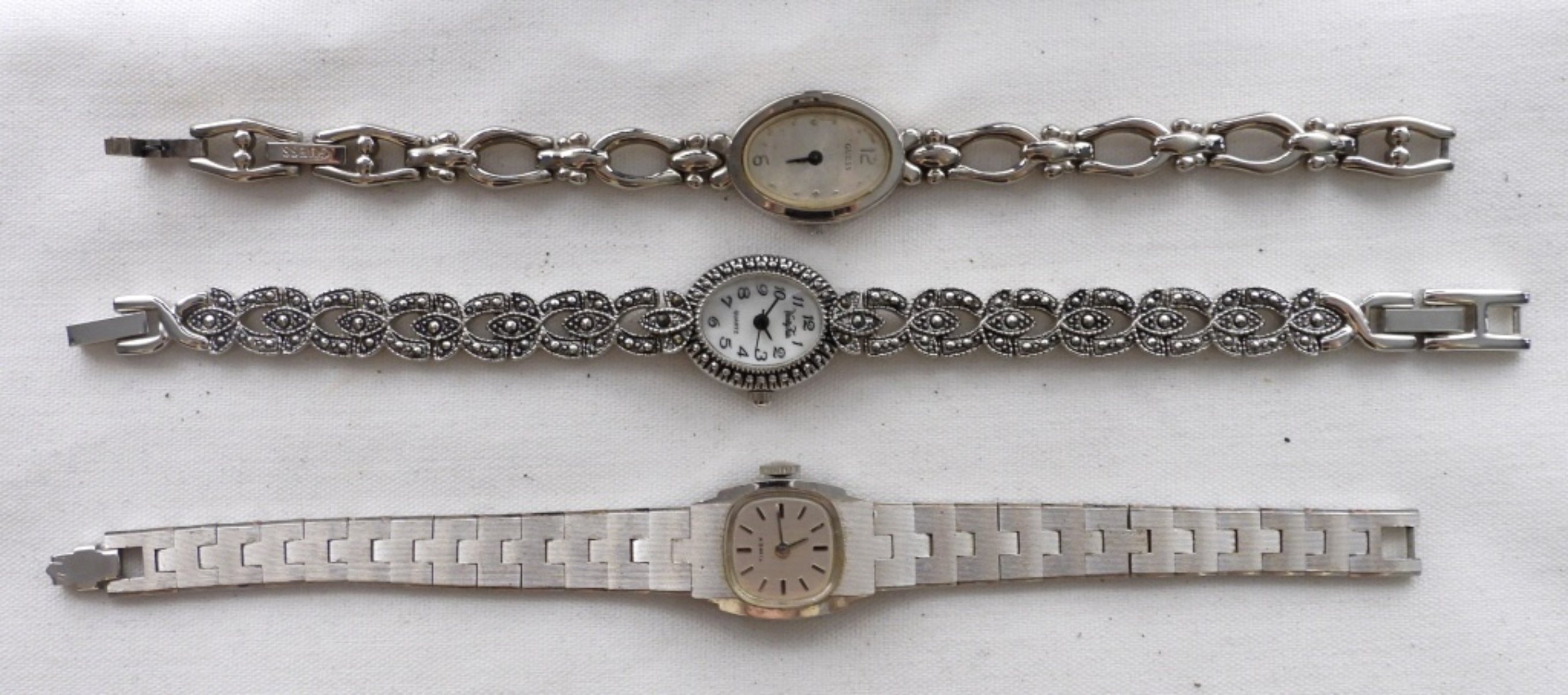 10 ASSORTED LADIES SILVER TONE DAINTY WATCHES WITH SMALL WATCH FACES. WATCHES UNTESTED/BRANDS UNVERIFIED.