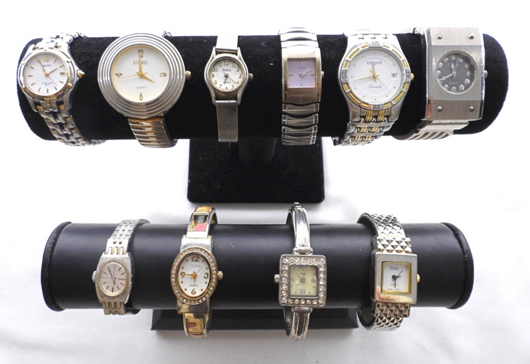 10 ASSORTED LADIES FASHION SILVER TONE WATCHES. WATCHES UNTESTED/BRANDS UNVERIFIED. SOME BRANDS IN LOT INCLUDE: SEIKO, STUDIO, WITTNAUER, AND MORE!