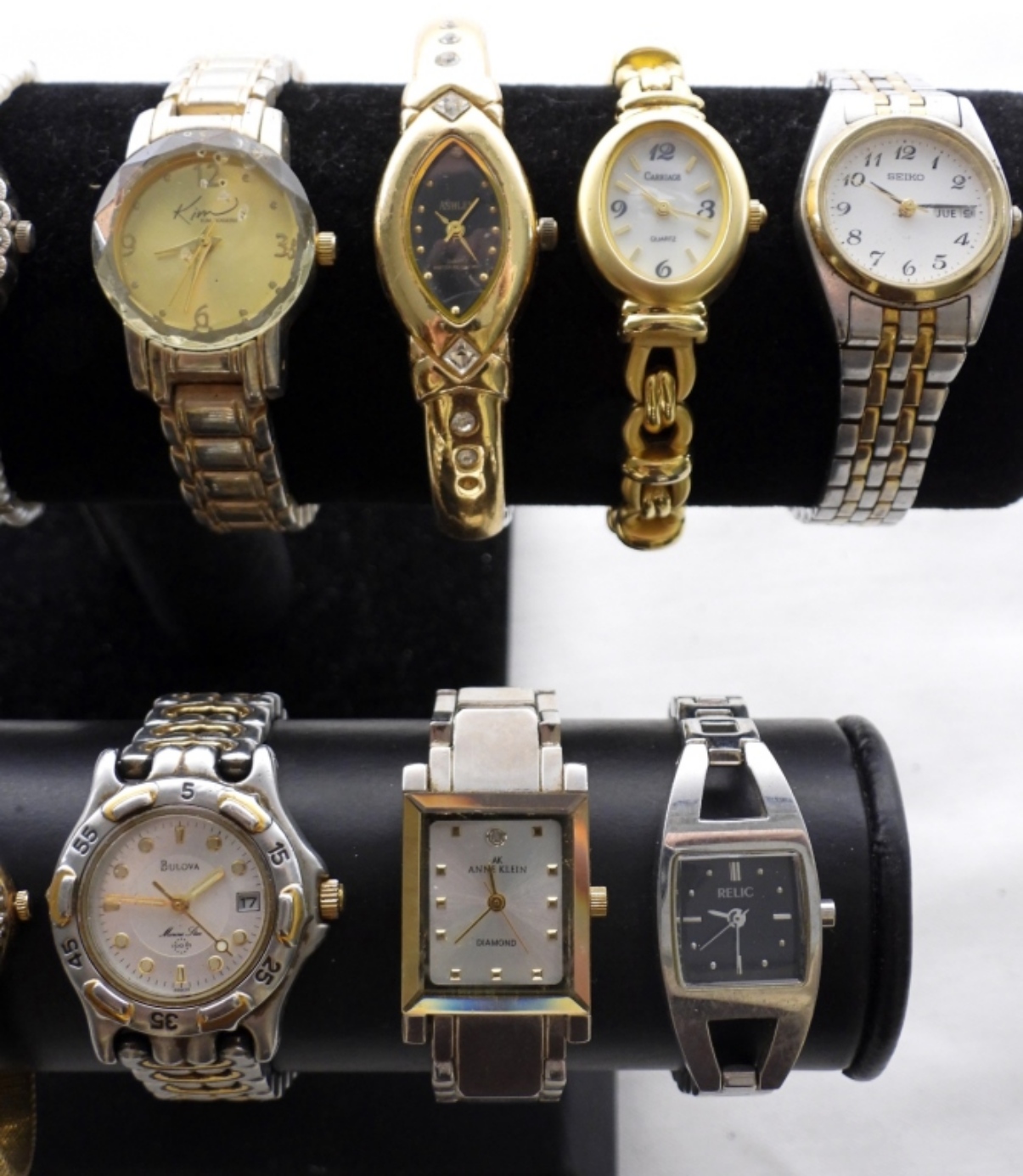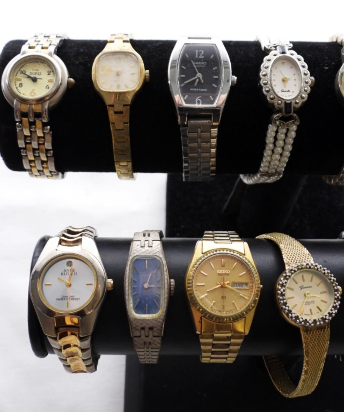 15 ASSORTED GOLD/SILVER LADIES FASHION WATCHES. WATCHES UNTESTED/BRANDS UNVERIFIED. SOME BRANDS IN LOT INCLUDE: GUESS, ANNE KLEIN, SEIKO AND MORE!