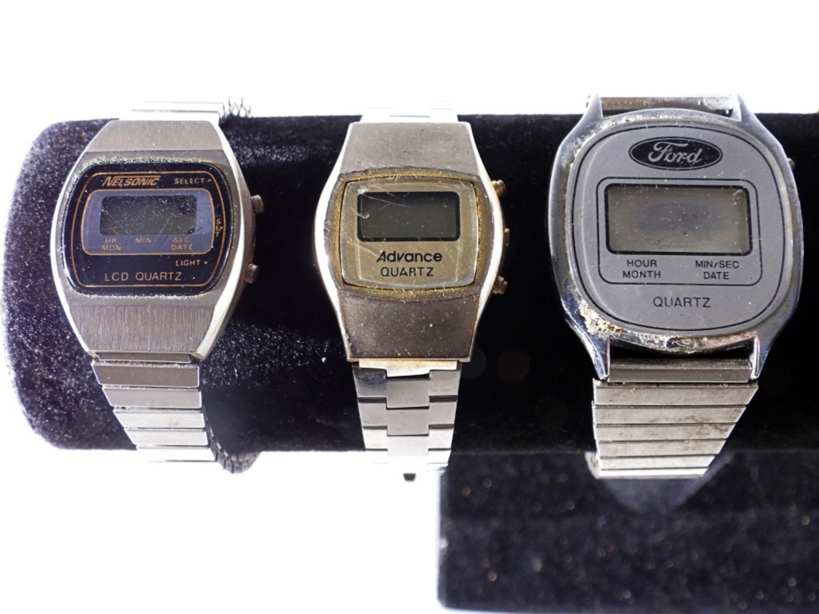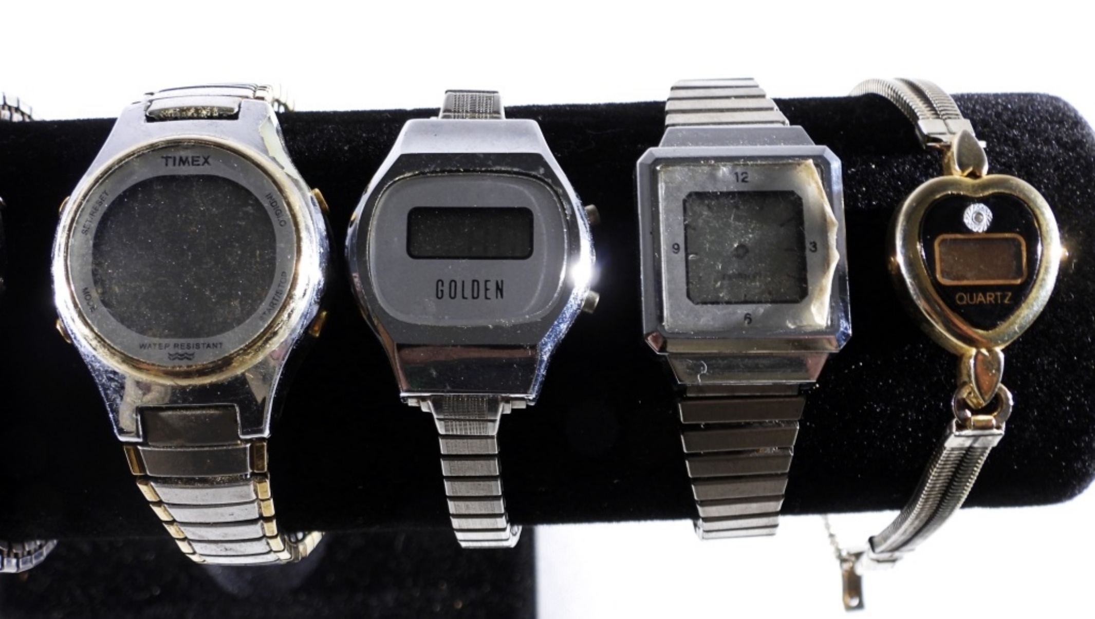 7 SILVER TONE DIGITAL/LED WATCH LOT. ASSORTED DESIGNS/CONDITIONS. WATCHES UNTESTED, MAY NEED PARTS OR REPAIR TO WORK.