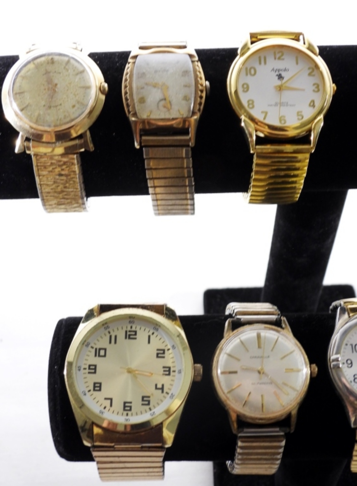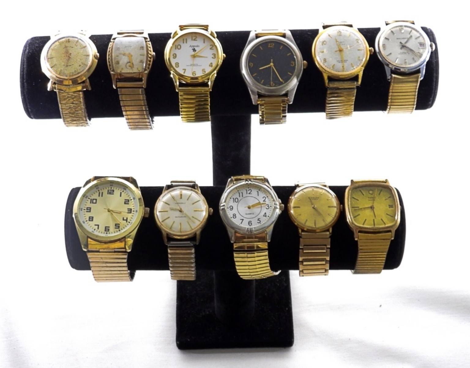 ASSORTED 11 GOLD TONE MENS WATCHES. ALL WATCHES ARE UNTESTED/BRANDS UNVERIFIED. WATCHES MAY NEED PARTS OR REPAIR TO WORK.