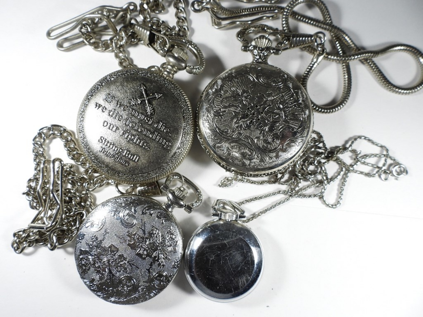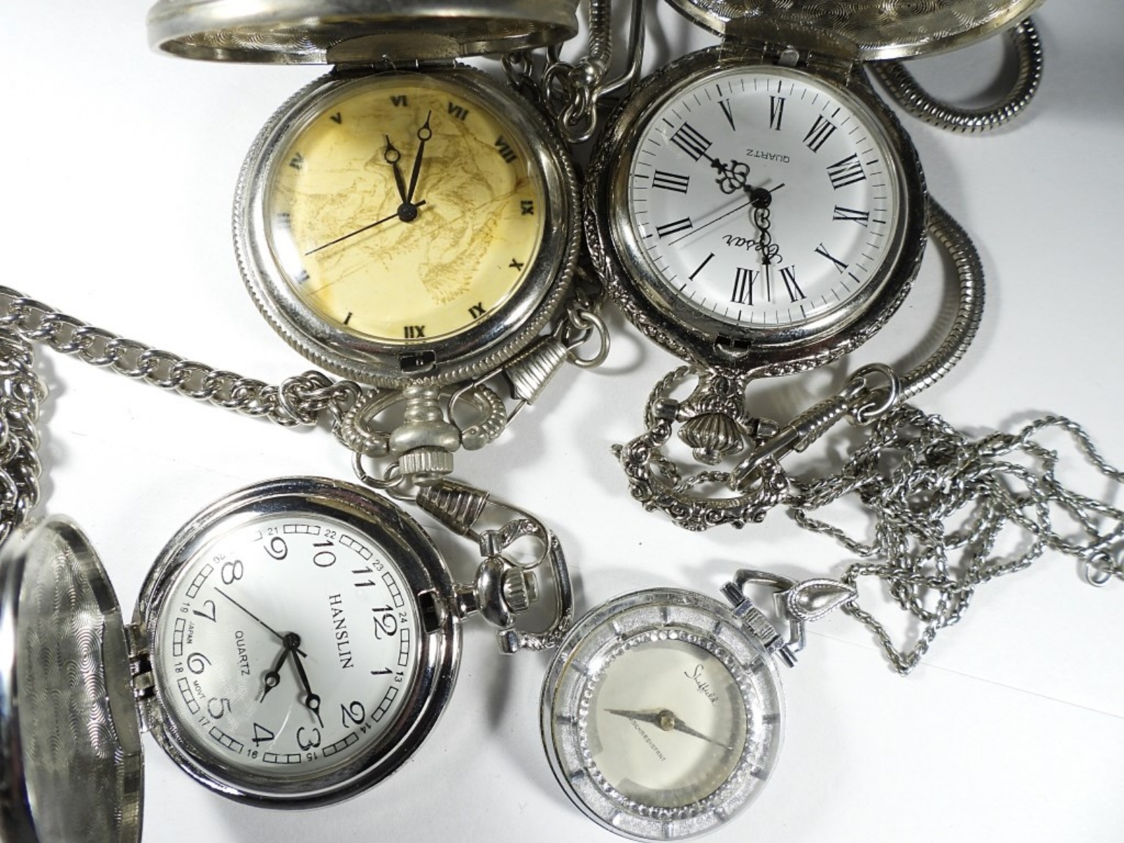 4 SILVER TONED POCKET WATCHES. SOME OF THE BRANDS ARE CESAR, HANSLIN, SHEFFIELD- THESE BRANDS ARE UNSEARCHED & UNVERIFIED. NOT TESTED AS TO WORKING OR NOT. THE SHEFFIELD POCKET WATCH IS A PENDANT THAT IS ON A 24″.