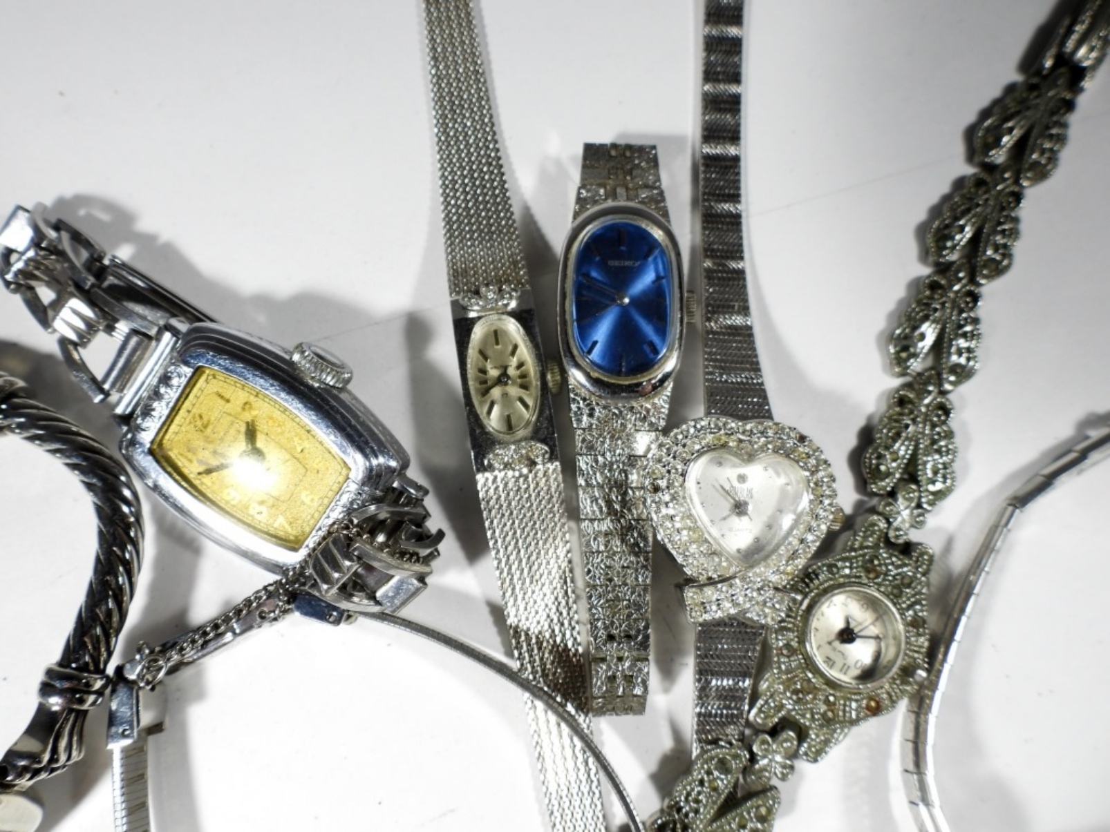 10 LADIES FASHION WATCHES- THESE WATHCES DO SHOW WEAR PREOWNED. SOME OF THE BRANDS ARE SEIKO, RUMORS- THESE BRANDS ARE UNSEARCHED AND UNVERIFIED. NOT TESTED AS TO WORKING OR NOT.