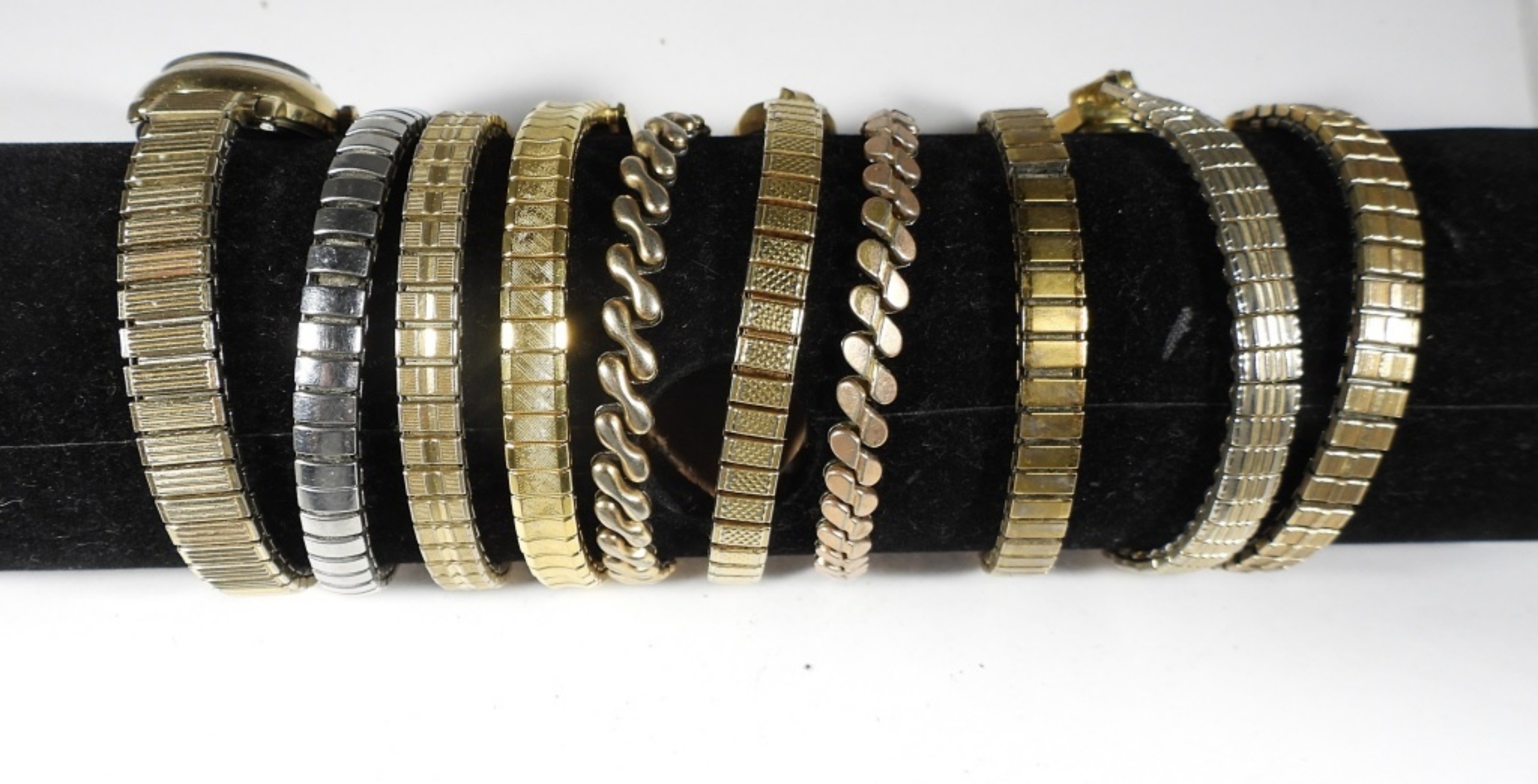 10 WOMEN’S STRECH BAND WATCHES- IN SILVER AND GOLD TONES- SOME WITH RHINESTONE ACCENTS- SOME OF THE BRANDS ARE TIMEX, BULOVA, GRUEN, PULSAR- THESE BRANDS ARE UNSEARCHED AND UNVERIFIED. THESE WATCHES DO SHOW WEAR