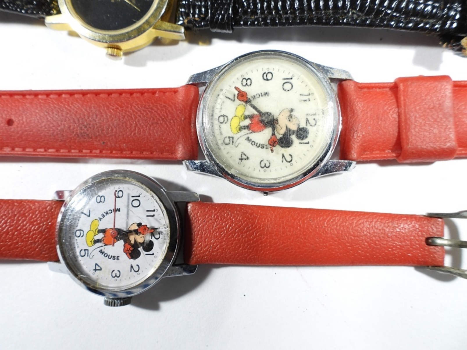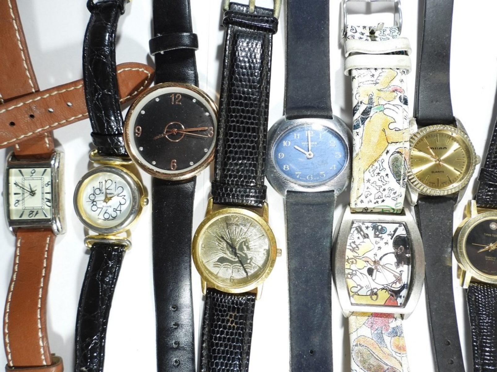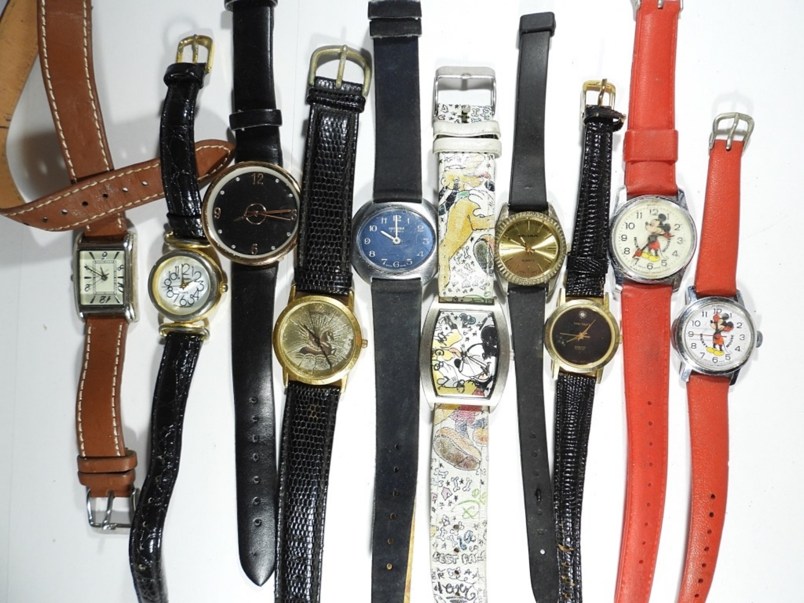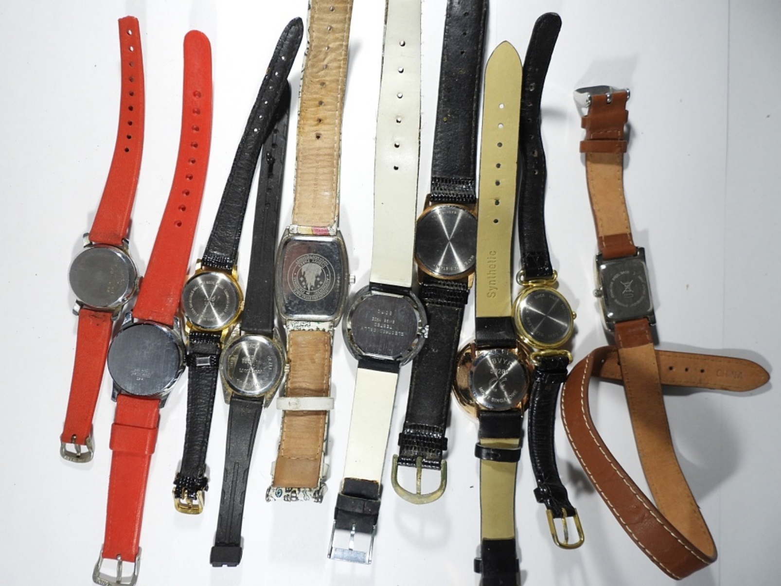 10 LADIES LEATHER BAND WATCHES- THERE ARE DIFFERENT COLOR BANDS- THE BRANDS ARE UNSEARCHED AND UNVERIFIED- NOT TESTED AS TO WORKING OR NOT. THESE WATCHES SHOW WEAR PREOWNED.