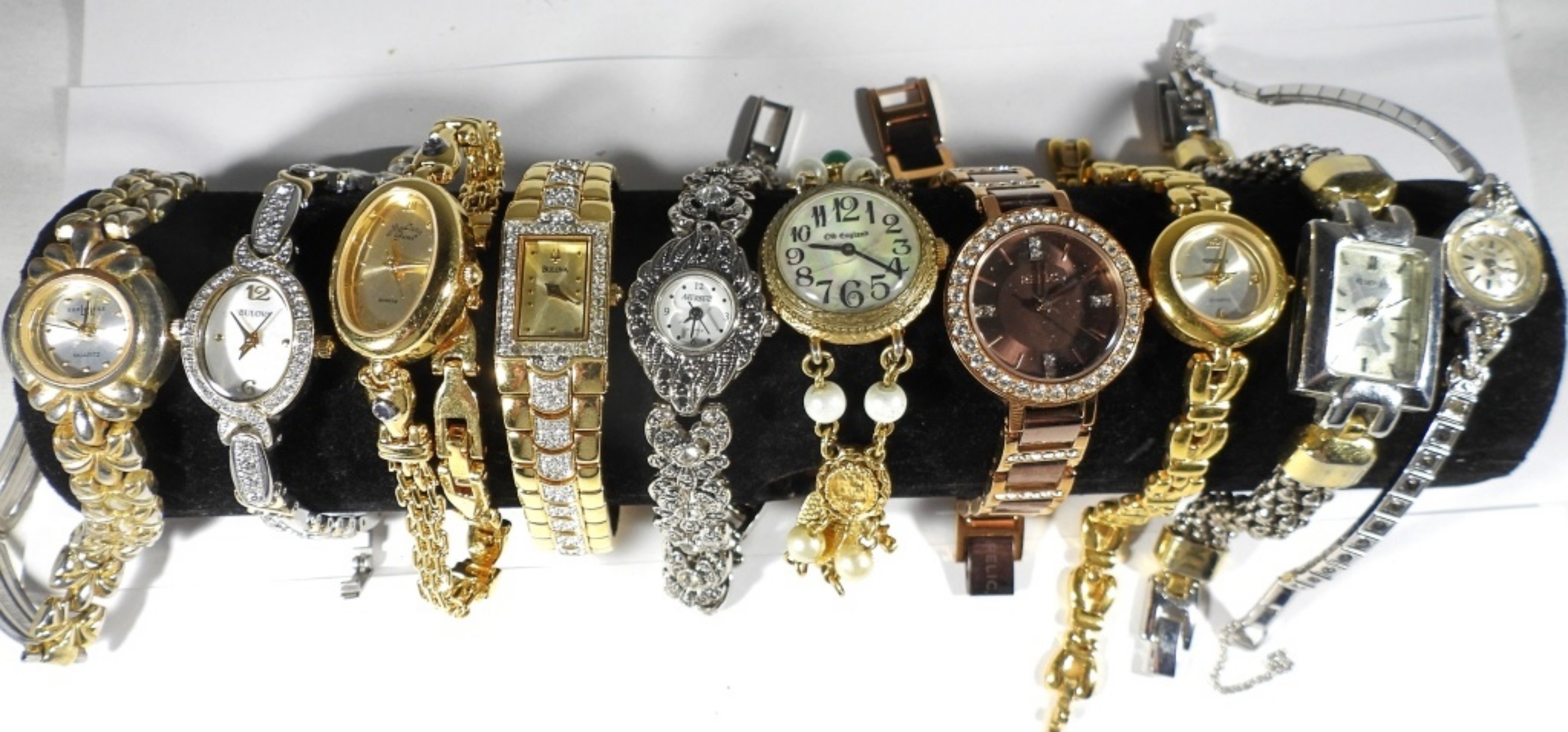10 WOMEN’S FASHION WATCHES- SOME HAVE RHINESTONES, & COLOR ACCENTS- MOSTLY GOLD & SILVER TONES. ONE OF THE WATCHES IS MISSING A GREEN BEAD ON THE BAND MAYBE ABLE TO BE REPLACED OR REPAIRED. BRANDS ARE MADISON