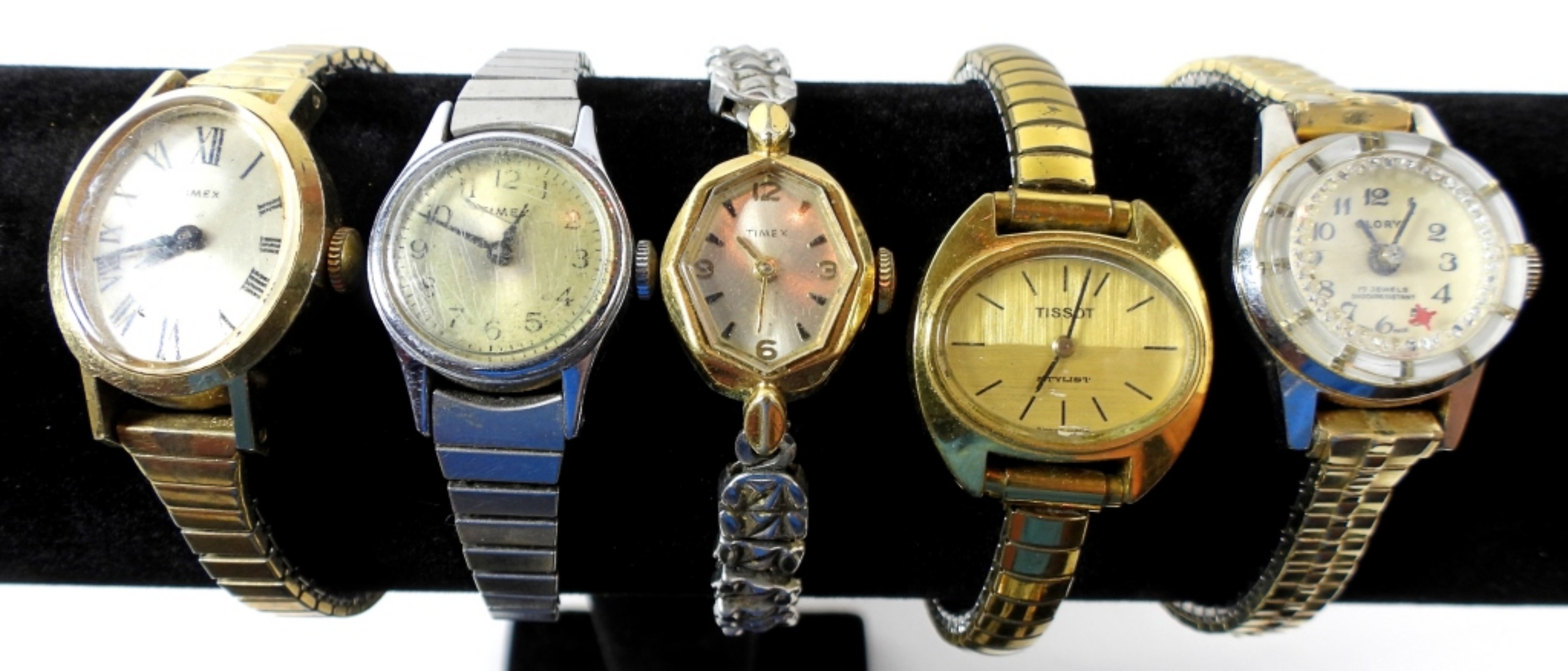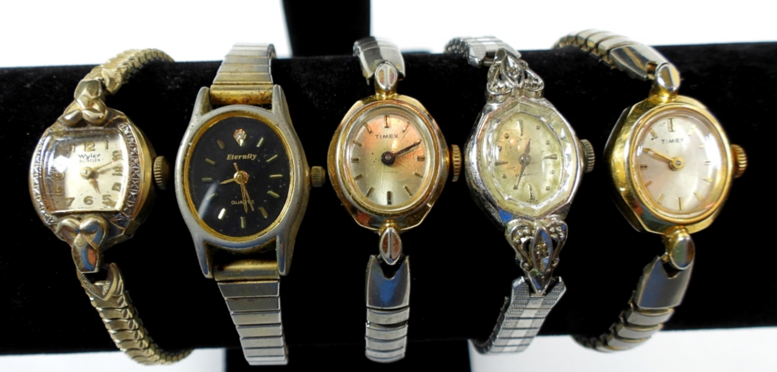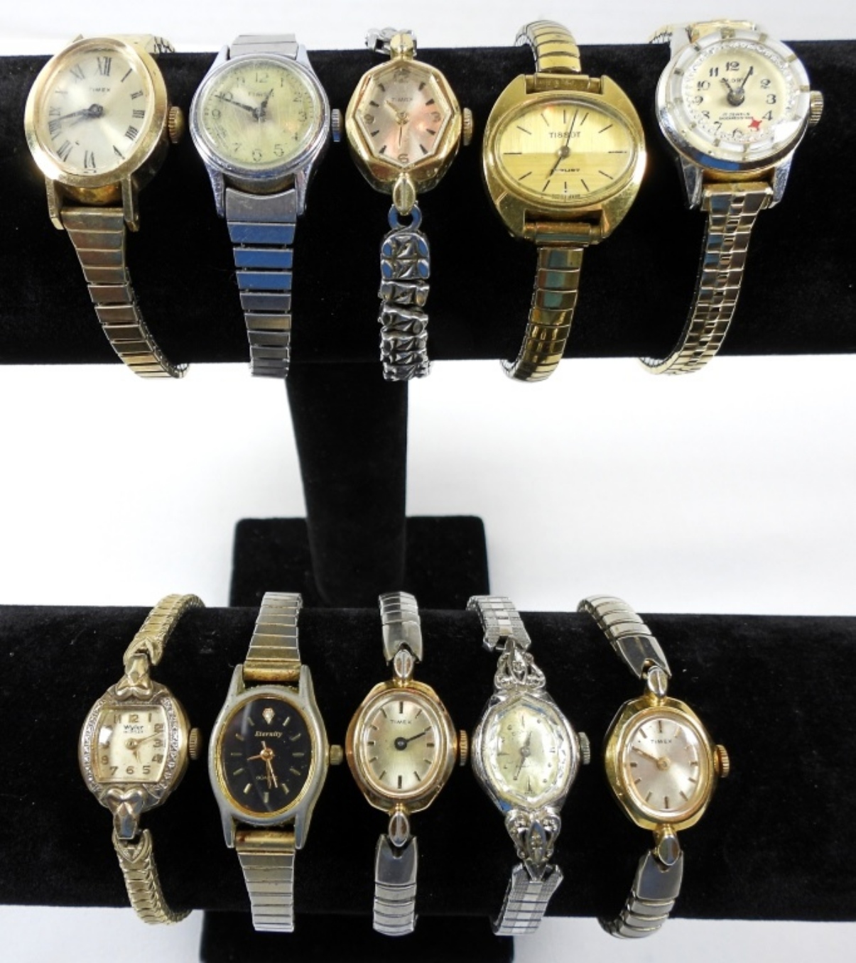 10 SILVER & GOLD TONED STRETCH BAND WATCHES- THESE WATCHES DO SHOW WEAR PREOWNED. BRANDS ARE TIMEX, ETERNITY, BULOVA, GLORY- THESE BRANDS ARE UNSEARCHED AND UNVERIFIED. NOT TESTED AS TO WORKING OR NOT.