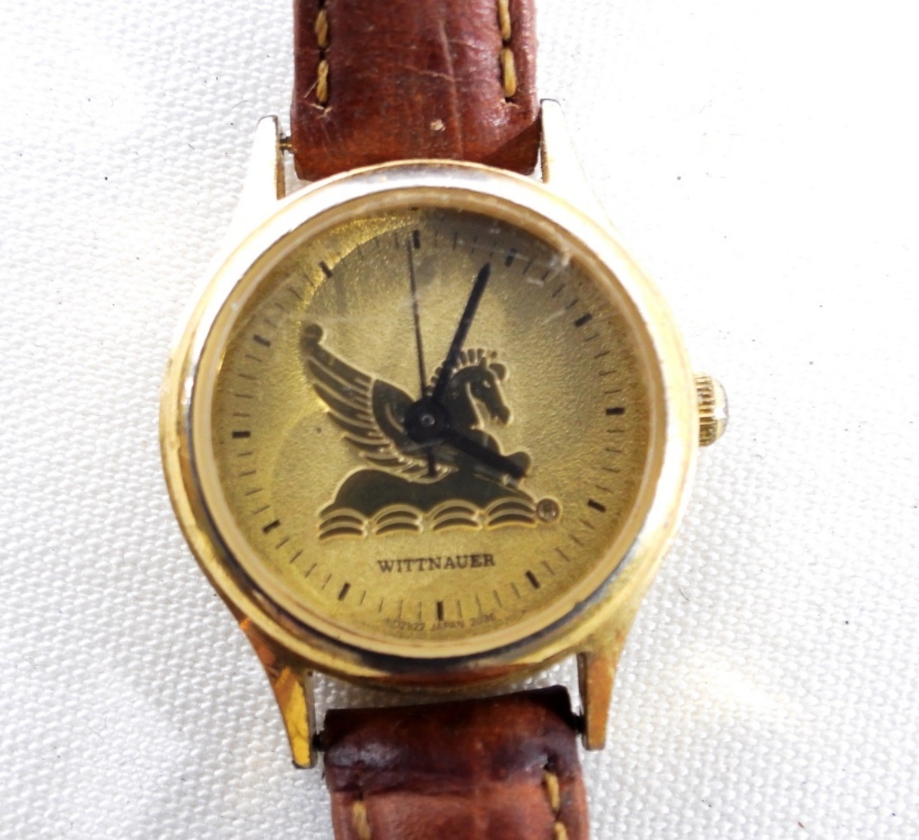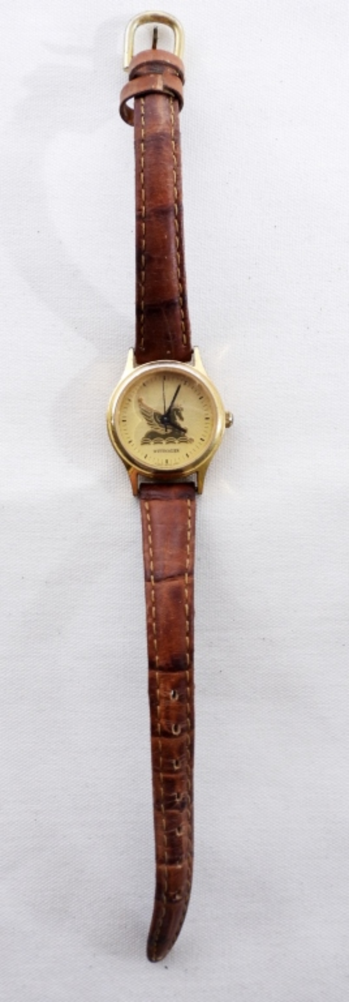 VINTAGE LADIES WITTNAUER PEGASUS WATCH. WATCH UNTESTED, MAY NEED PARTS OR REPAIR TO WORK. BROWN WRISTBAND 11R.