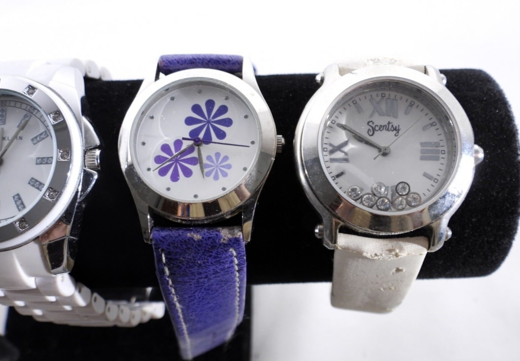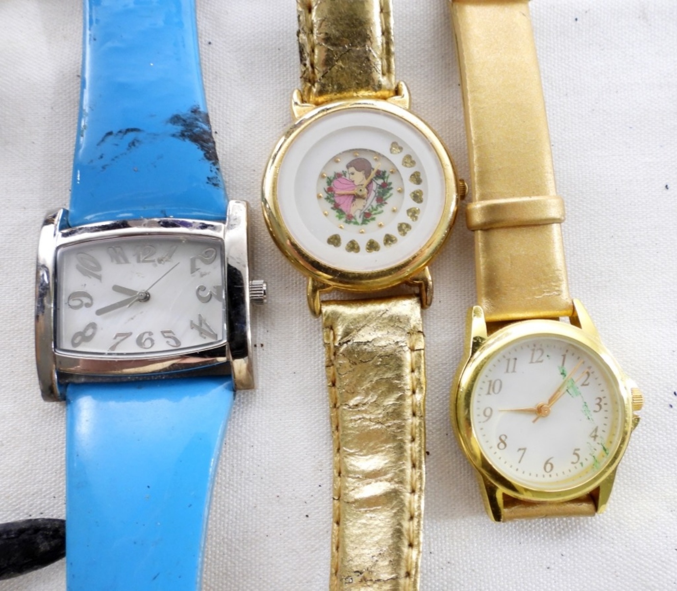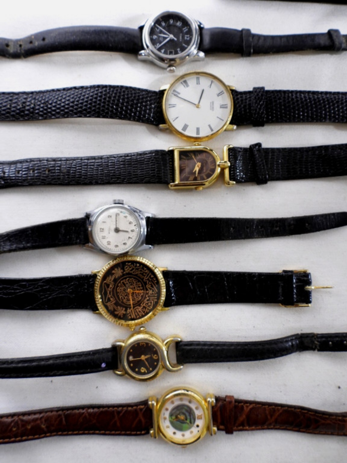 15 ASSORTED LADIES WATCHES, DIFFERENT STYLES AND COLORS OF WRISTBANDS, IN VARIOUS CONDTIONS. WATCHES UNTESTED/BRANDS UNVERIFIED. MAY NEED PARTS OR REPAIR TO WORK.