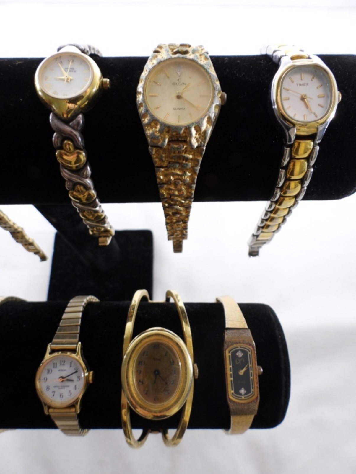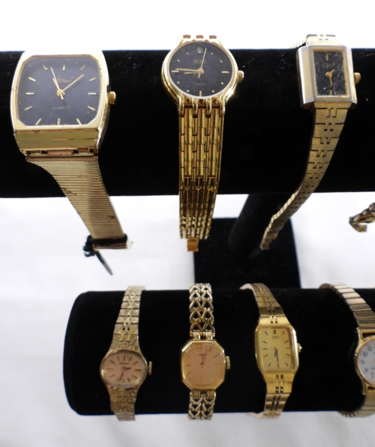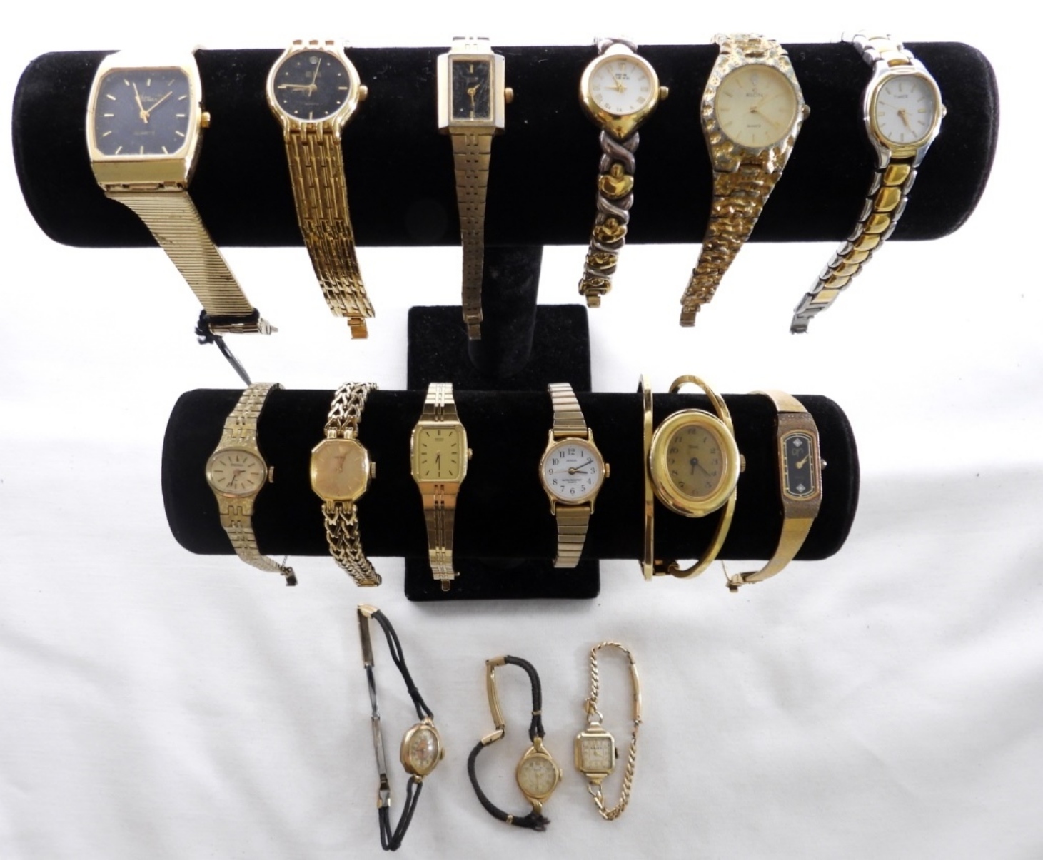 15 ASSORTED LADIES GOLD TONE FASHION WATCHES. VARIETY OF CONDTIONS/BRANDS/STYLES. WATCHES UNTESTED (MAY NEED REPAIR OR PARTS TO WORK) AND BRANDS UNVERIFIED.