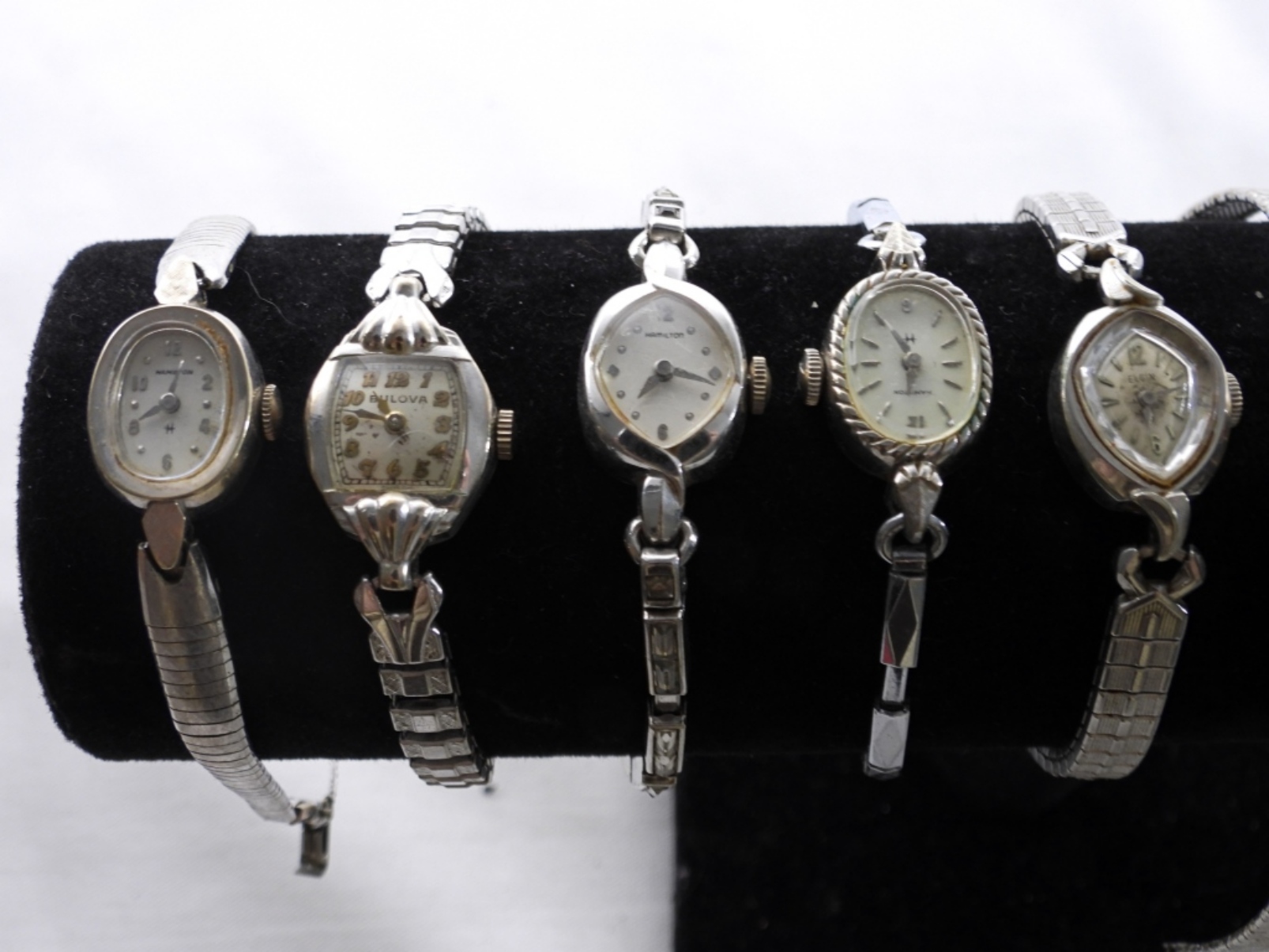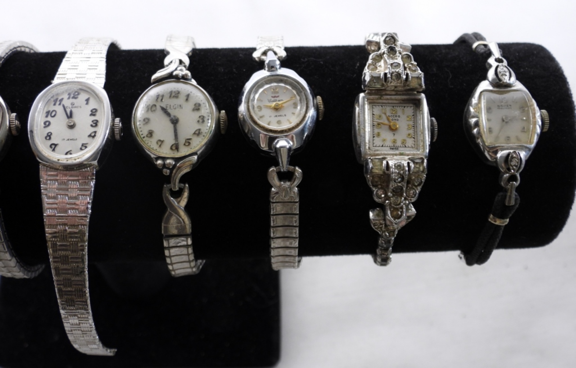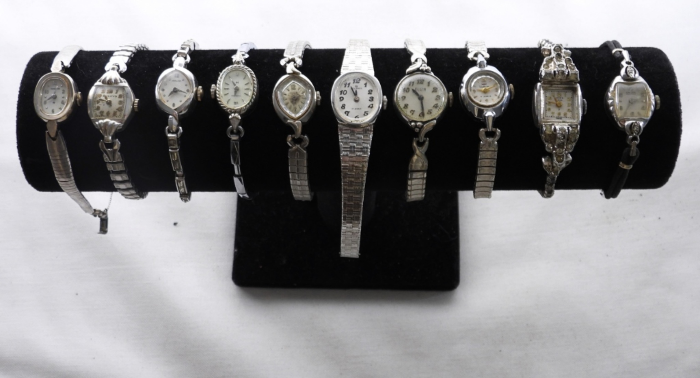 10 ASSORTED SILVER TONE LADIES WATCH LOT. WATCHES UNTESTED/BRANDS UNVERIFIED.