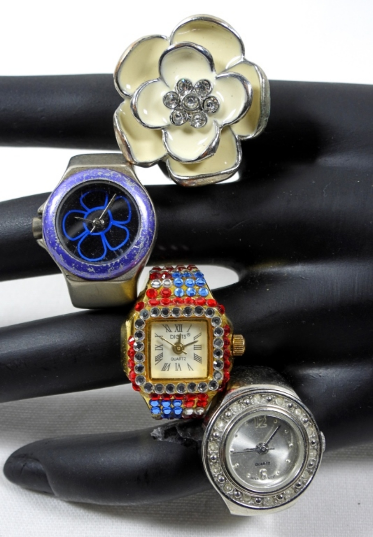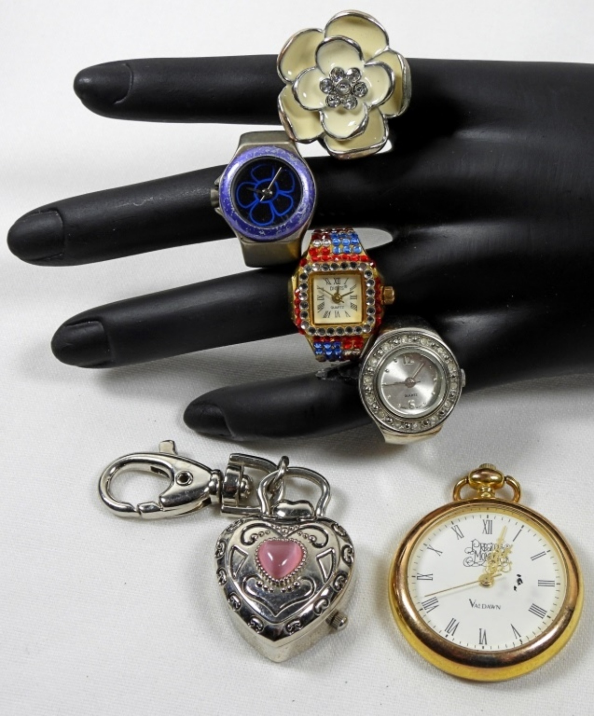 6 ASSORTED WATCH RINGS, KEYCHAIN AND PENDANT. WATCHES UNTESTED/BRANDS UNVERIFIED. MAY NEED PARTS OR REPAIR TO WORK.