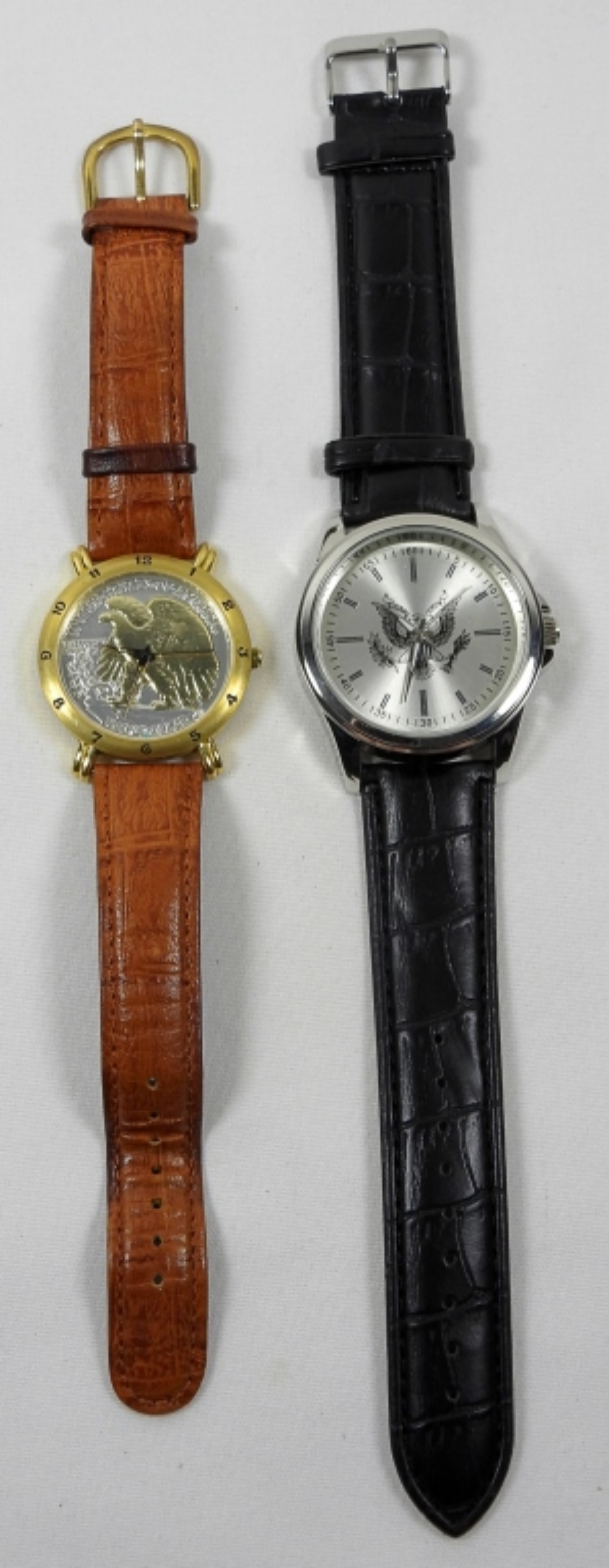 BRITTANIA HALF DOLLAR WATCH WITH BROWN WRISTBAND, AND ADDITIONAL WATCH WITH BLACK WRISTBAND. WATCHES UNTESTED/BRANDS UNVERIFIED. MAY NEED PARTS OR REPAIR TO WORK.