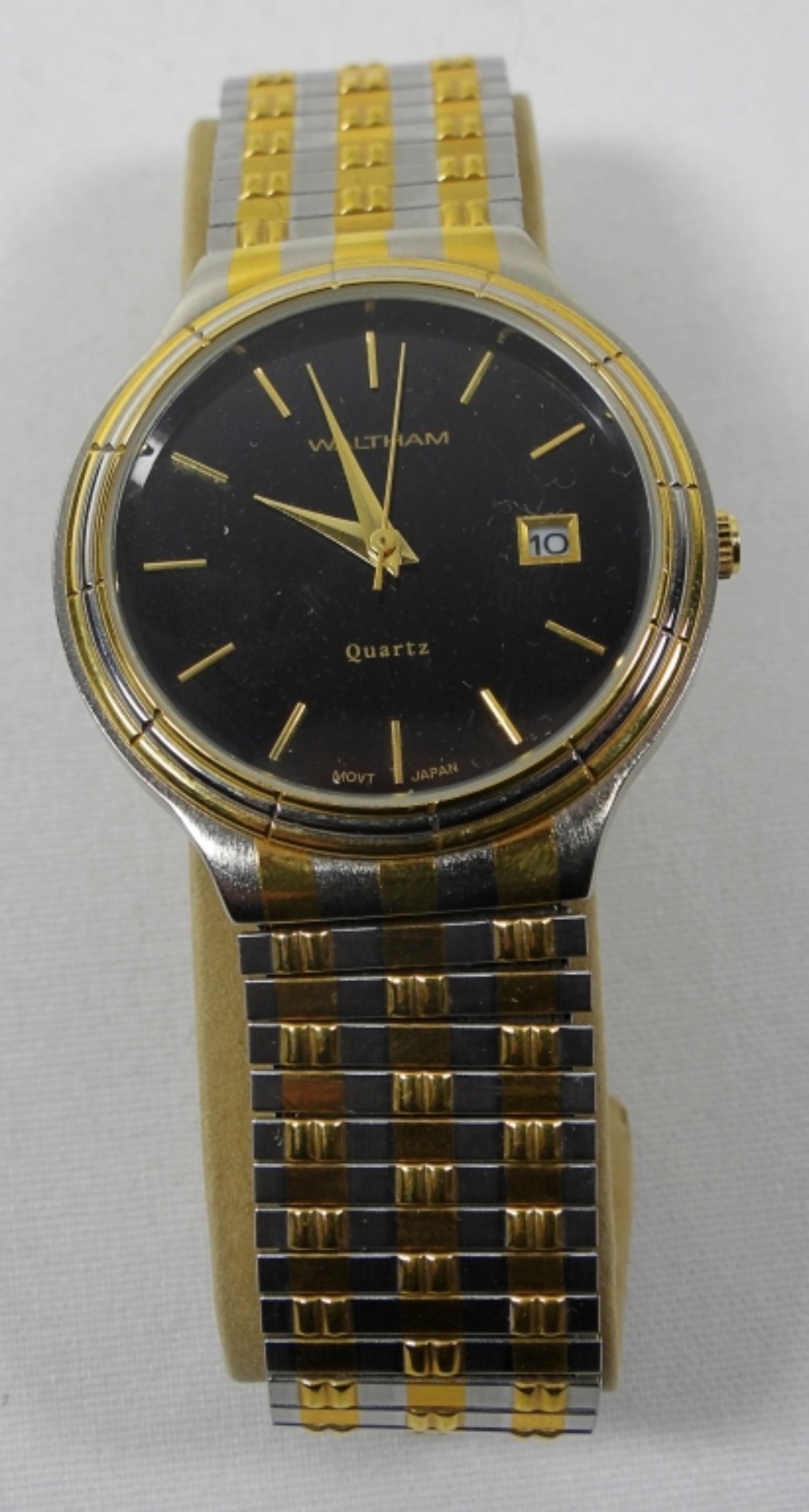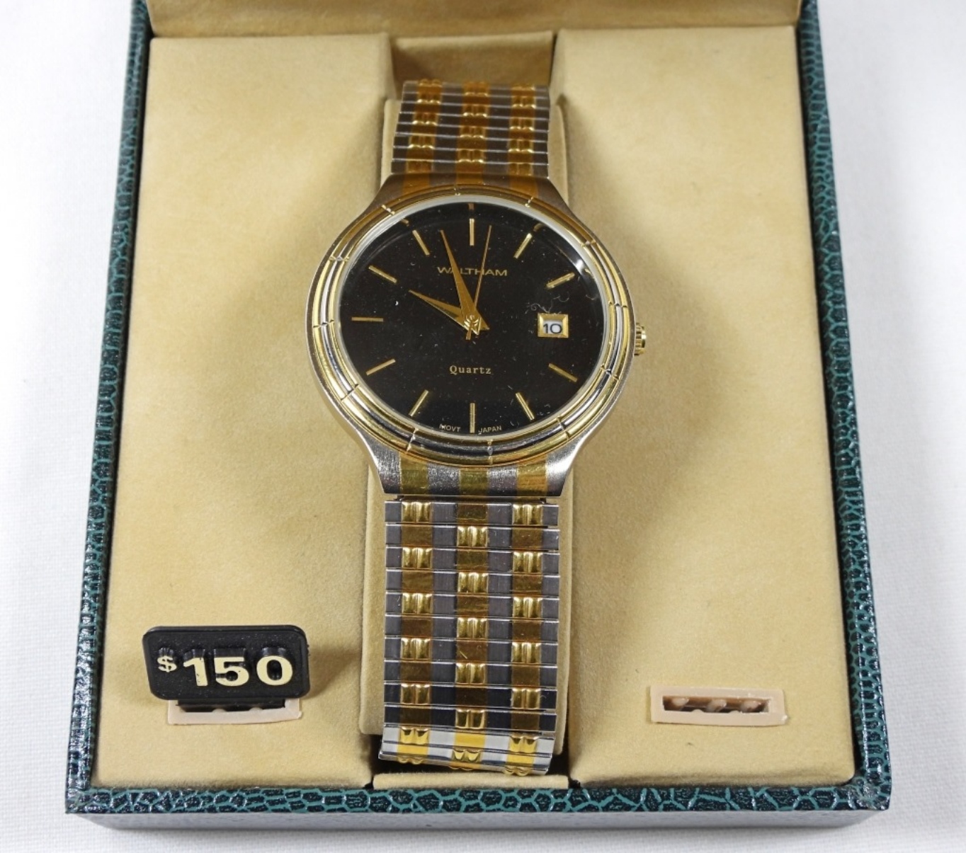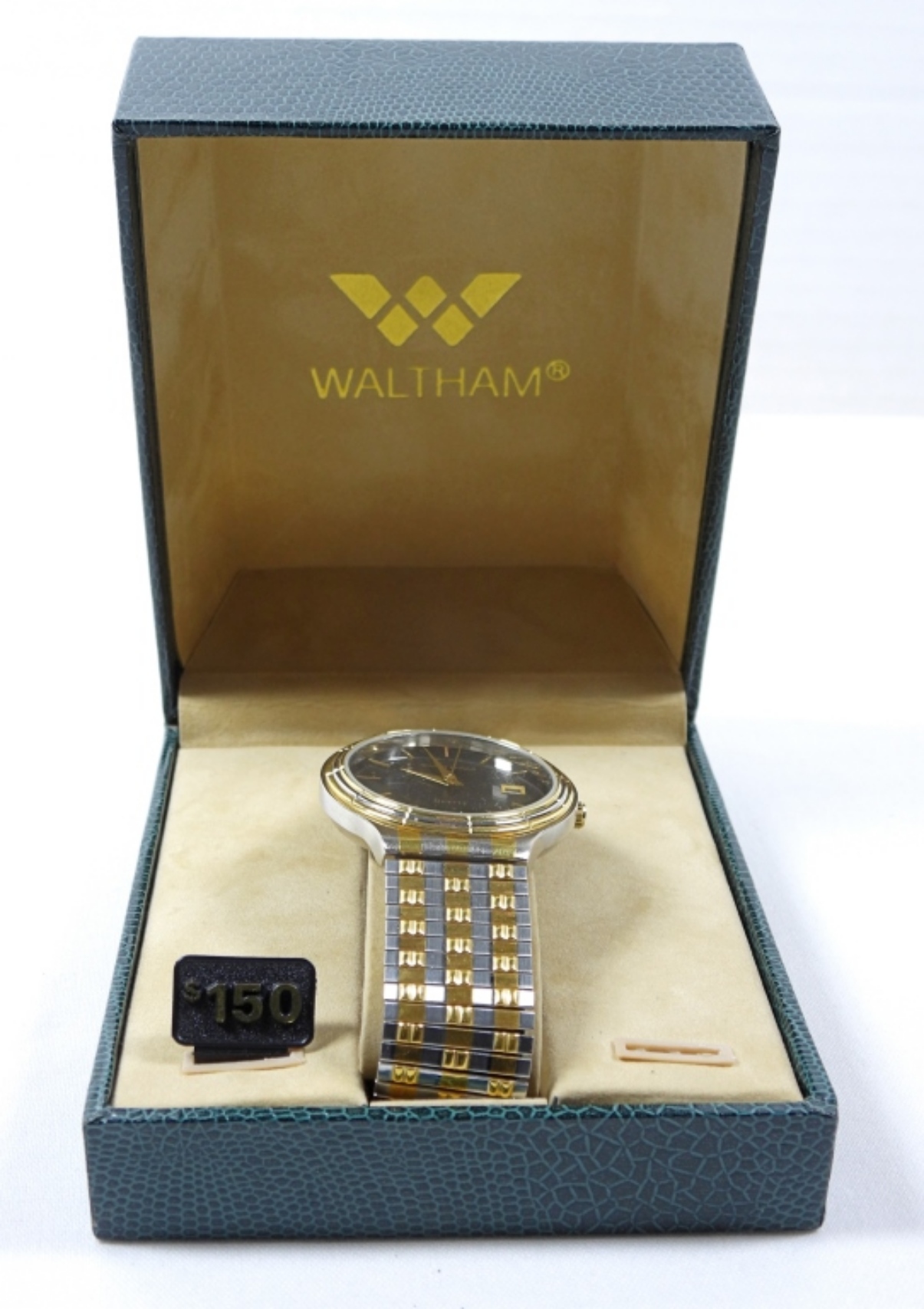 GOOD CONDITION MENS WALTHAM WRISTWATCH IN GOLD AND SILVER TONES. IN CASE. WATCH IS UNTESTED/UNVERIFIED: MAY NEED PARTS OR REPAIR TO WORK.