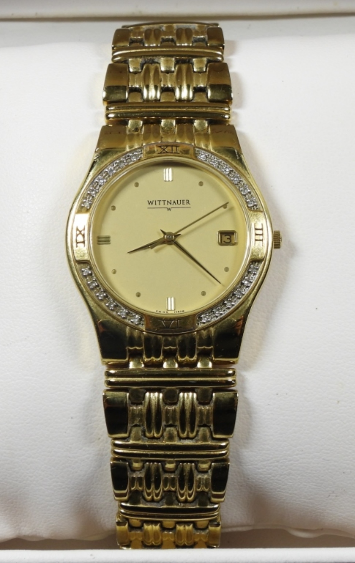 GOLD TONE WITTNAUER MENS WATCH IN CASE: ENGRAVING ON BACK OF WATCH. WATCH UNTESTED: MAY NEED PARTS OR REPAIR TO WORK.
