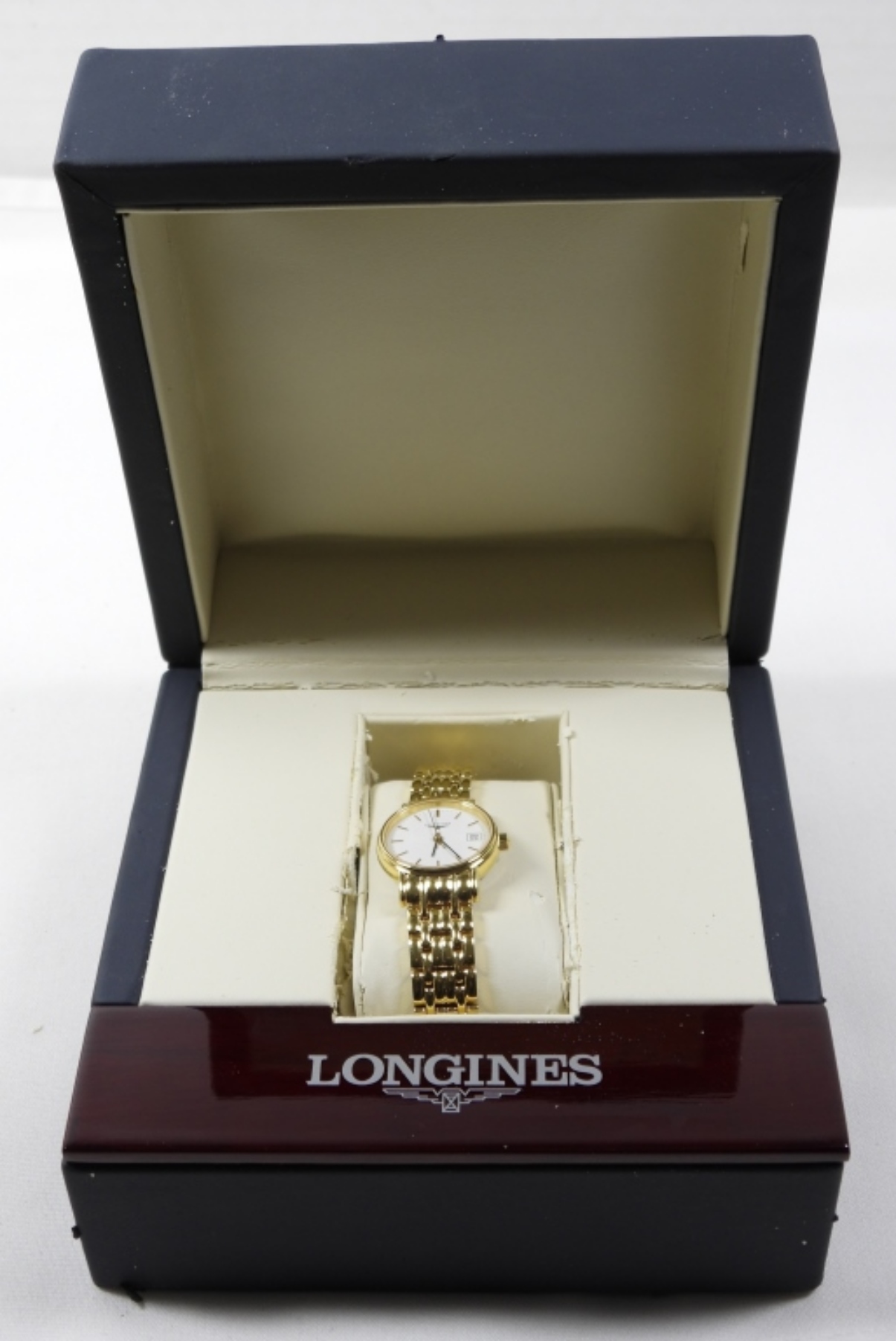 LADIES GOLD TONE LONGINES WATCH IN ORIGINAL BOX. WATCH UNTESTED/UNVERIFED: MAY NEED PARTS OR REPAIR TO WORK