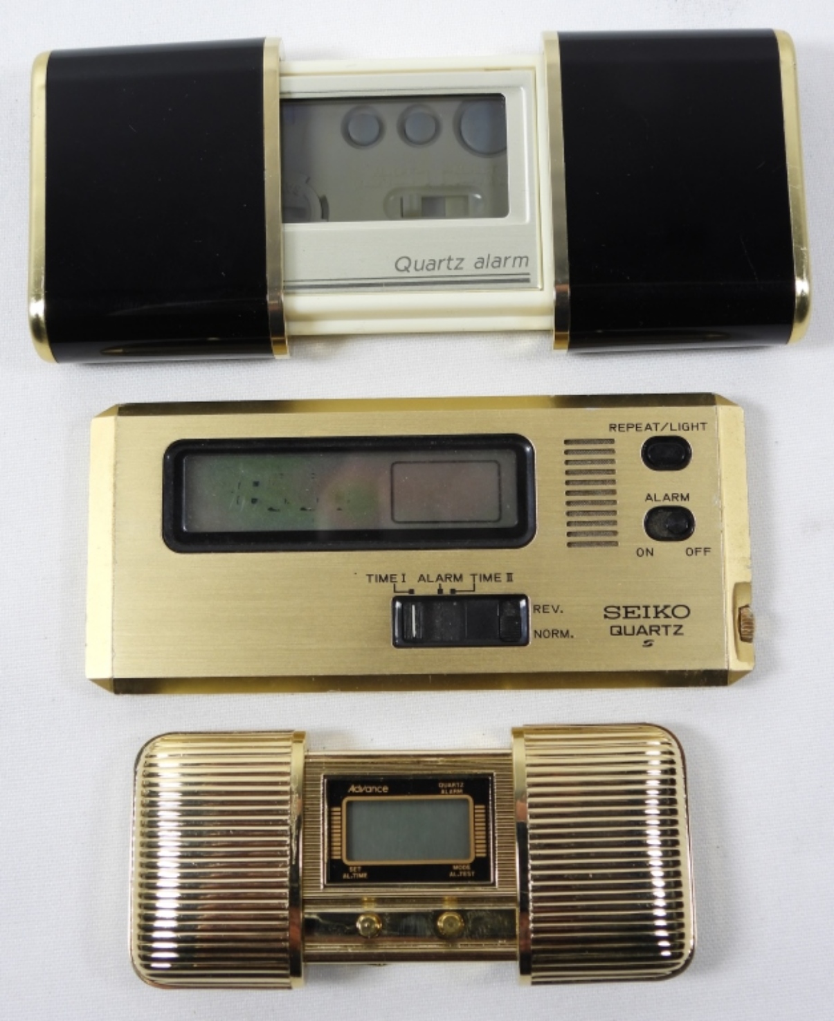 3 ASSORTED TRAVEL ALARM CLOCKS: UNTESTED/UNVERFIED, MAY NEED PARTS OR REPAIR TO WORK.