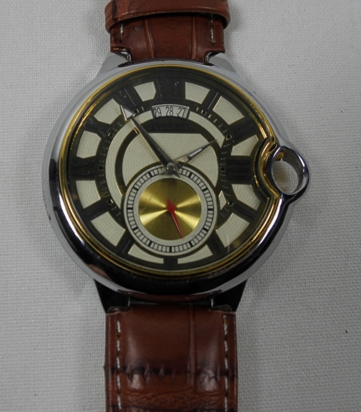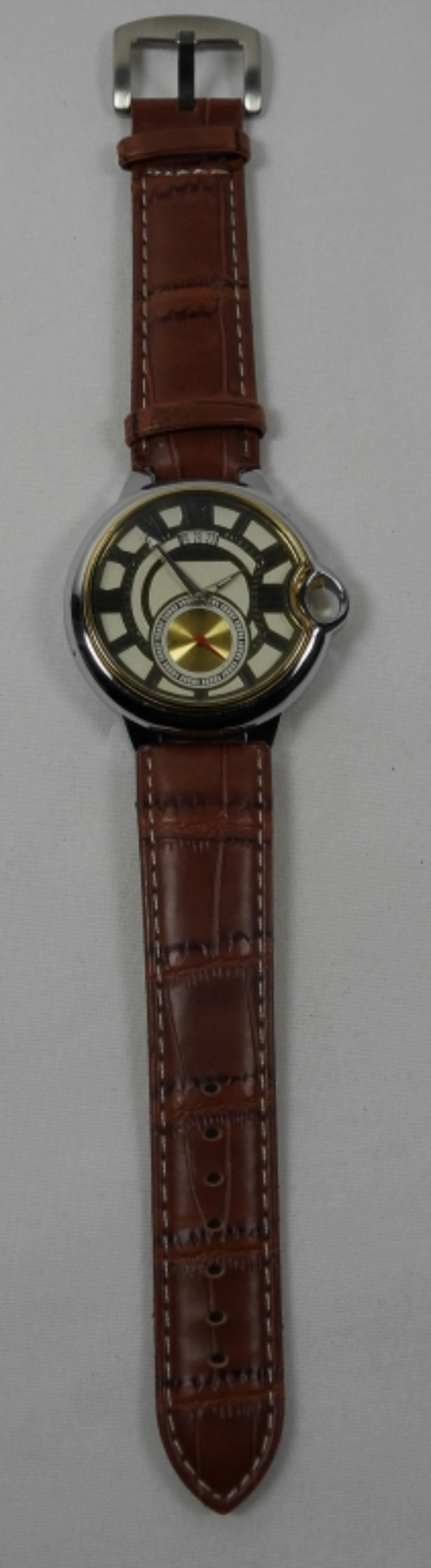 GOER MENS WATCH WITH BROWN WRISTBAND. WATCH IS UNTESTED/UNVERIFIED. MAY NEED PARTS OR REPAIR TO WORK. IN STYLE OF CARTIER WATCH (BUT IS GOER BRAND, NOT CARTIER)
