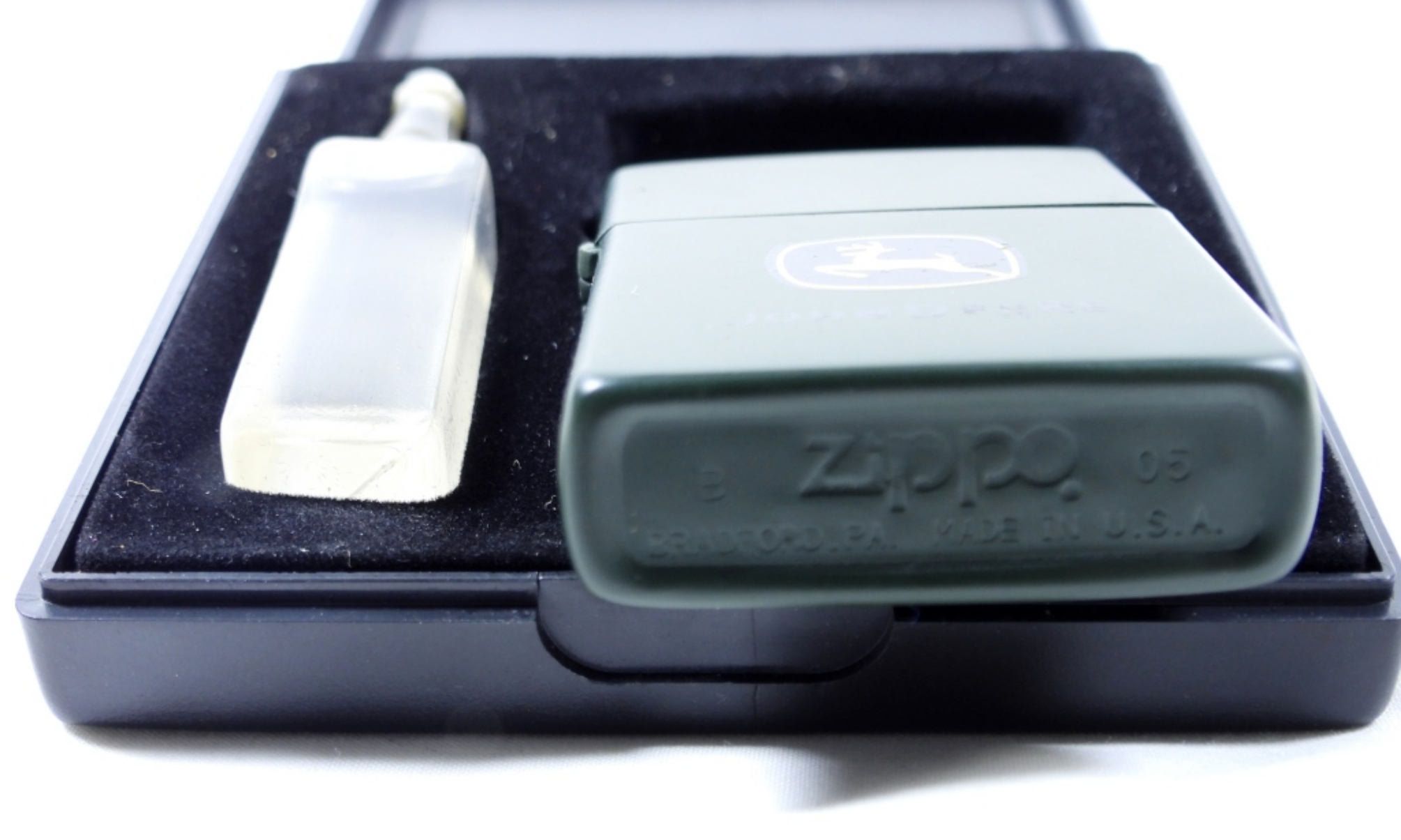 VINTAGE 2005 JOHN DEERE ZIPPO- UNFIRED- IN ORIGINAL JOHN DEERE BOX- COMES WITH A LITTLE BOTTLE OF THE FLUID. IN GOOD CONDITION DOES SHOW SOME WEAR PREOWNED.