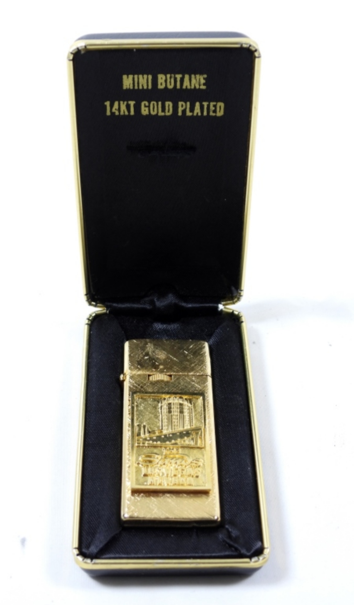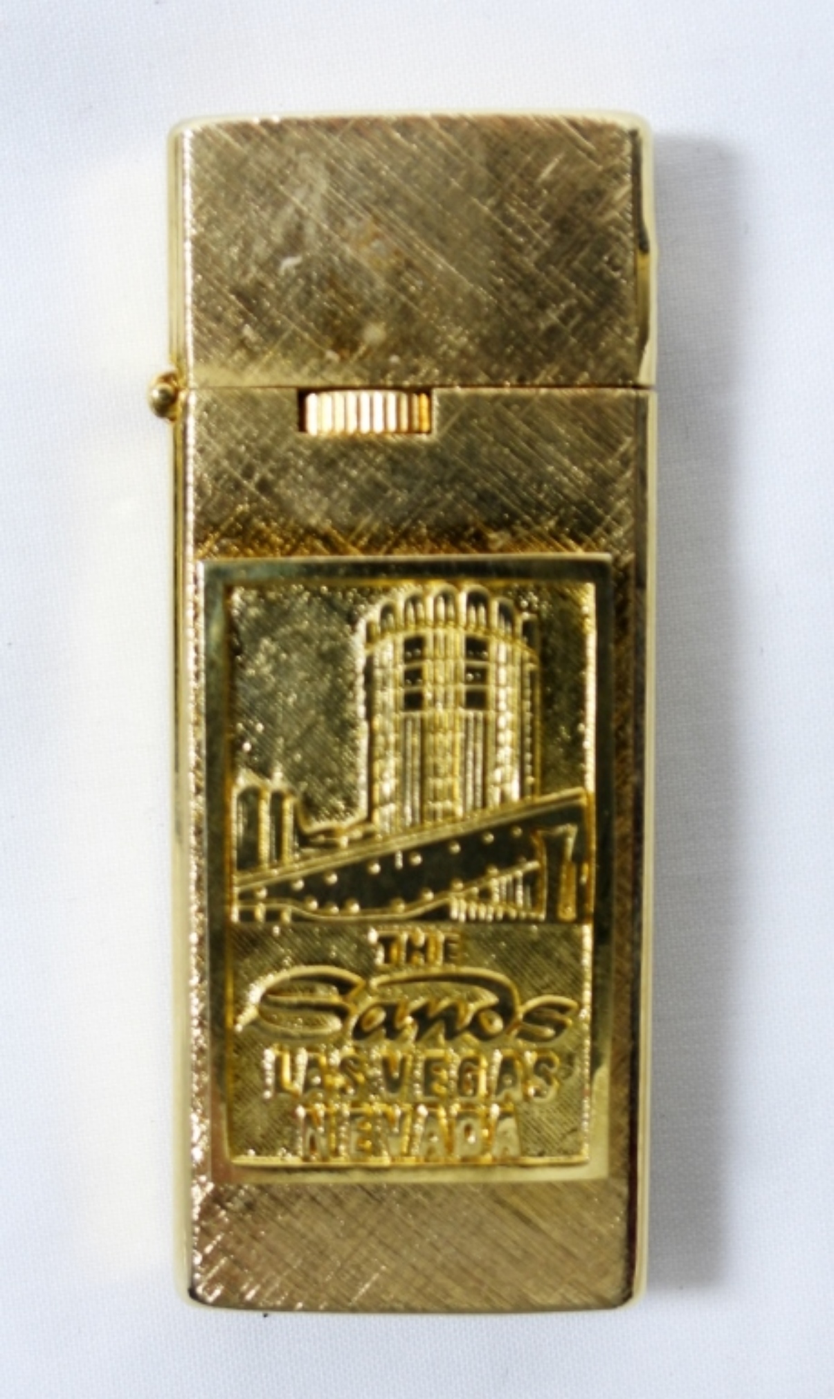 THE SANDS LAS VEGAS NEVEADA SLIM LIGHTER- GOLD TONE ( THE BOX STATES THAT THE LIGHTER IS 14KT GOLD PLATED- UNSEARCHED AND UNVERIFIED)-BUTANE. IN GOOD CONDITION DOES SHOW SOME WEAR, PREOWNED.FIRED.
