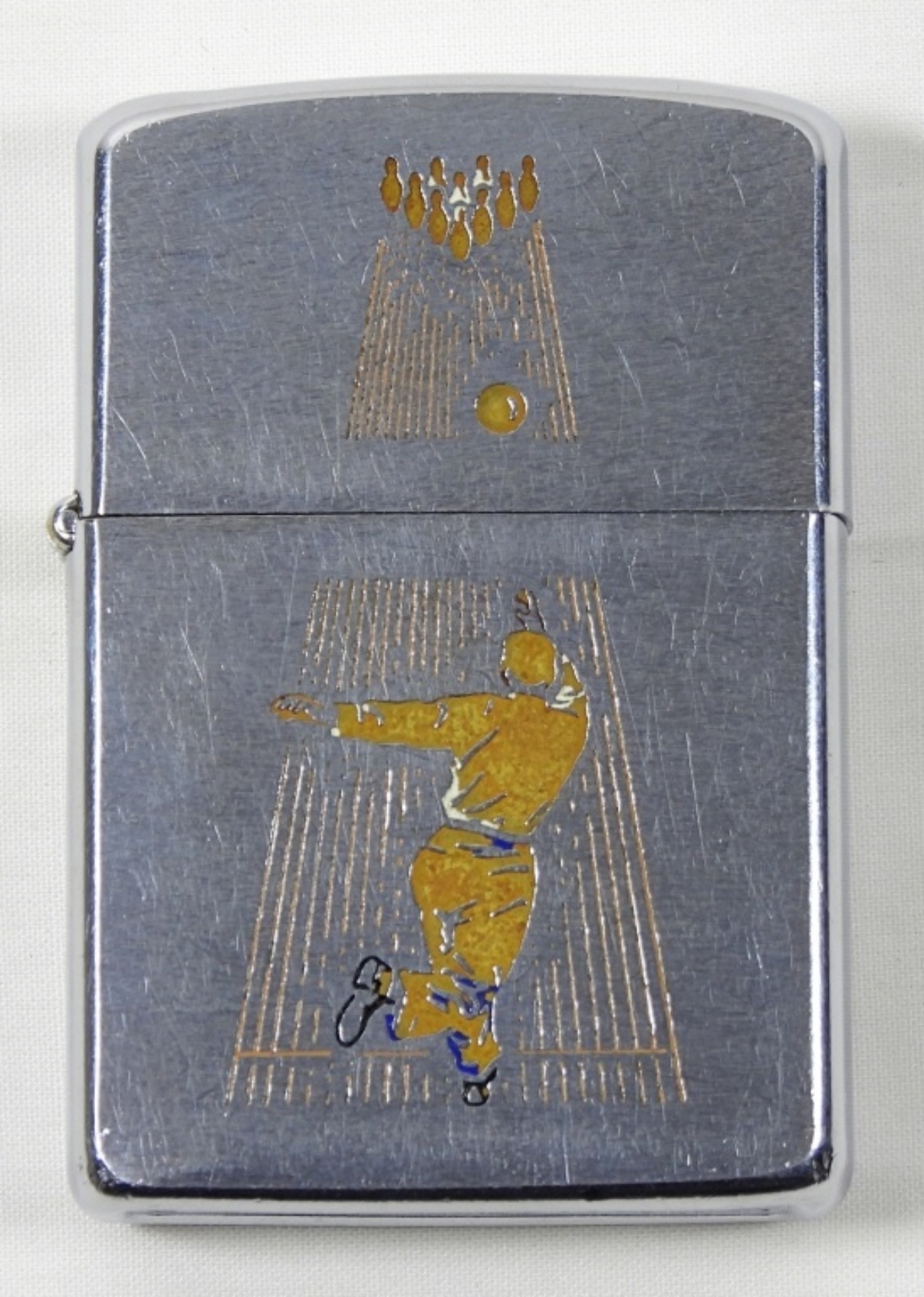 1969 VINTAGE ZIPPO LIGHTER: FIRED. BOWLER IN BOWLING LANE IN BOX.