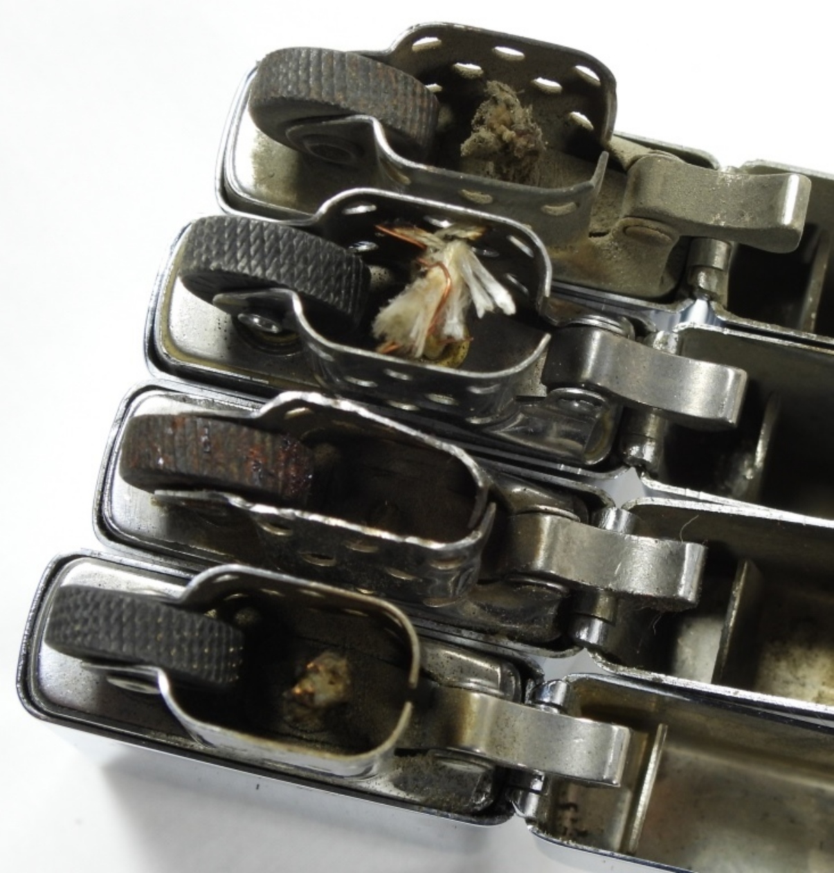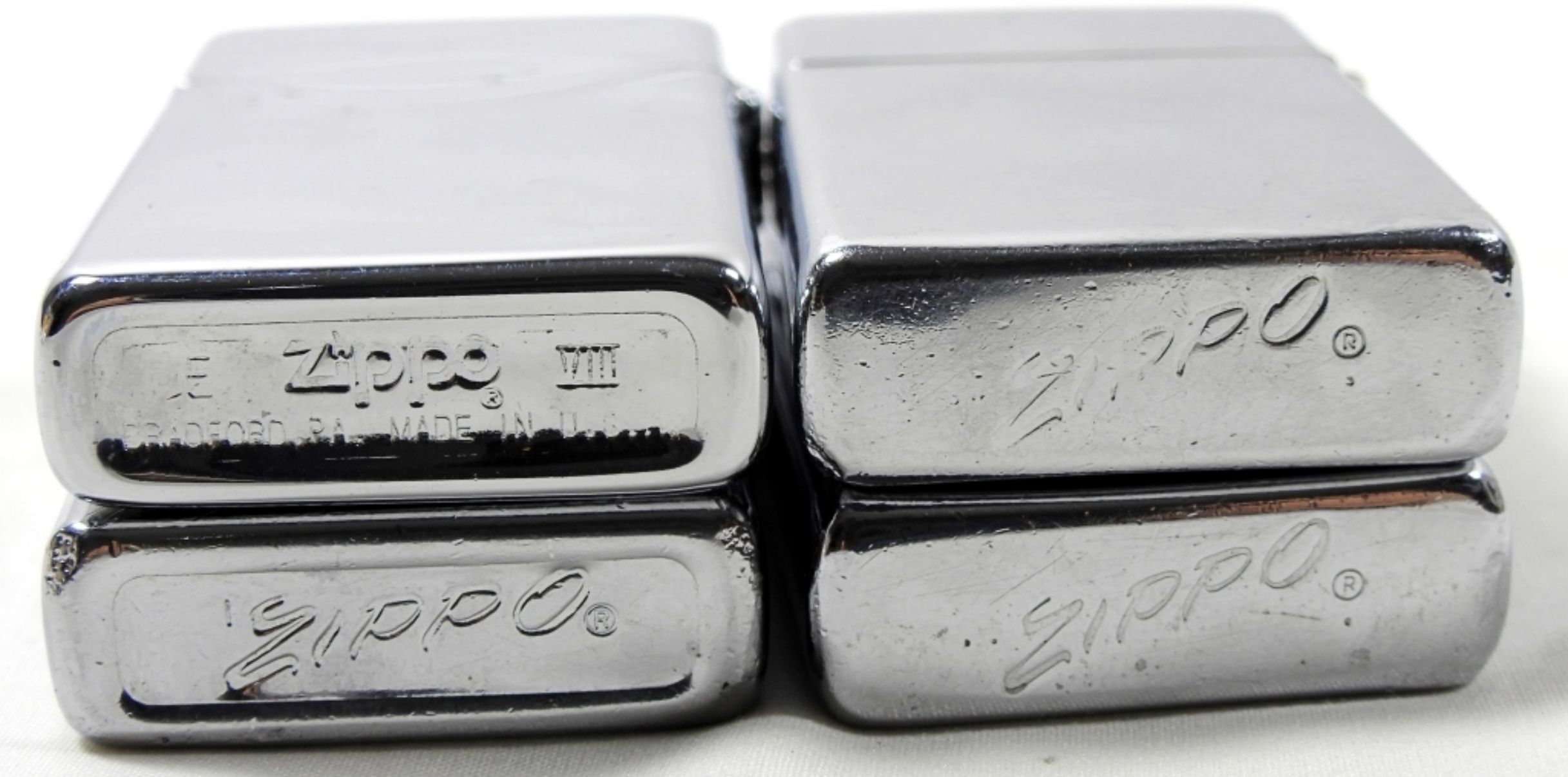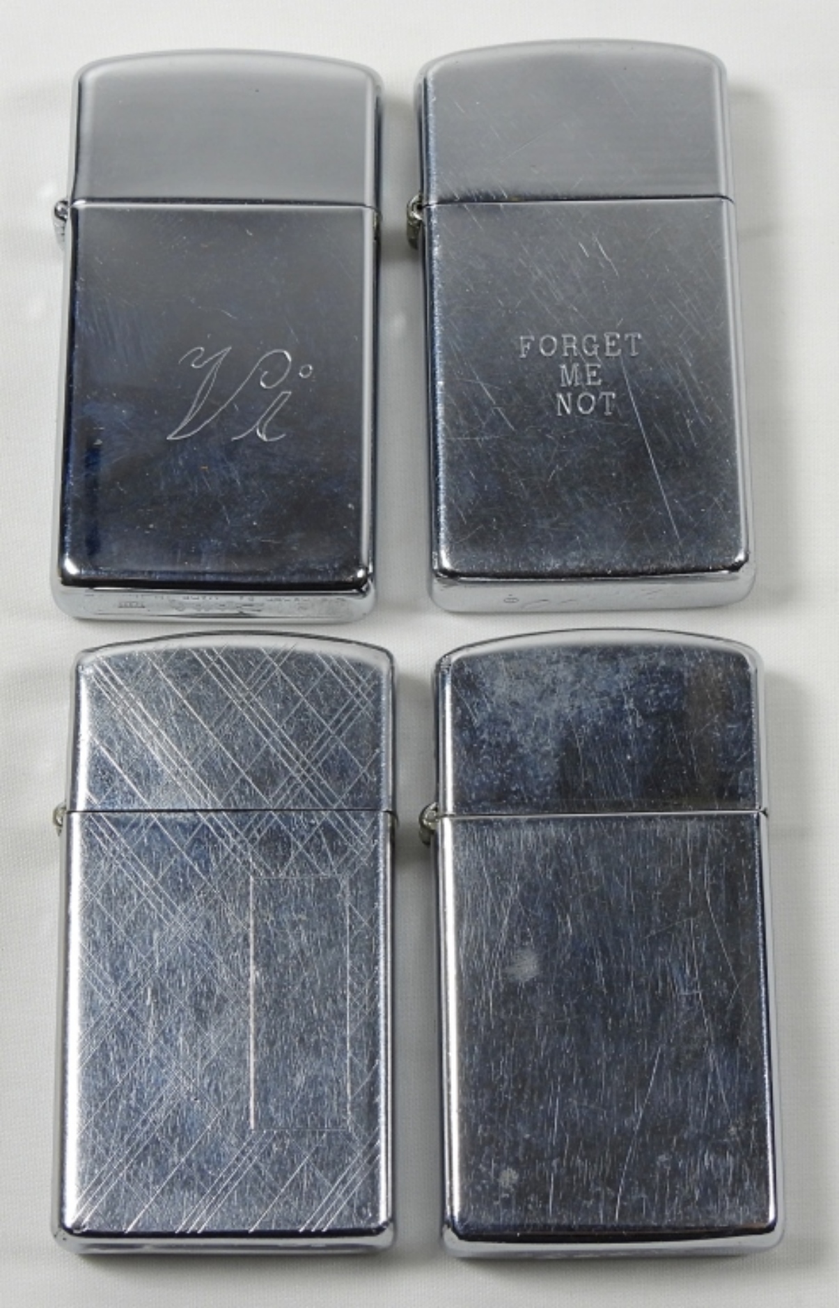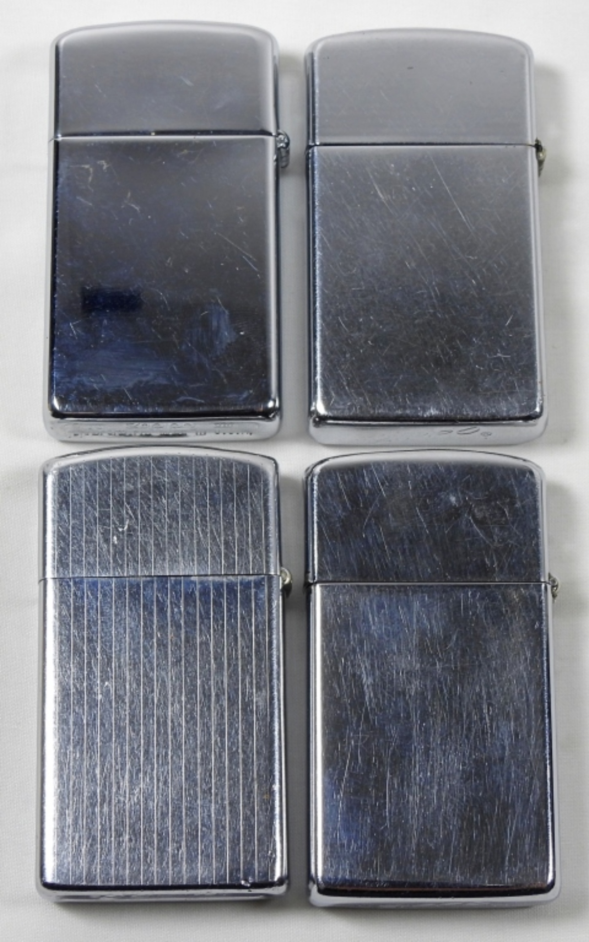 4 SILVER CHROME SLIM ZIPPOS. ALL HAVE BEEN FIRED