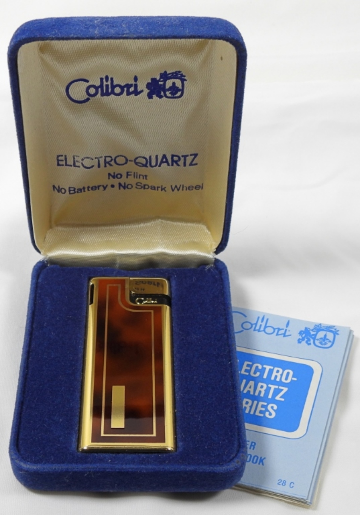 VINTAGE IN ORIGINAL CASE, COLIBRI ELECTRO QUARTZ NO FLINT, NO BATTERY, NO SPARK WHEEL LIGHTER IN GOOD CONDITION