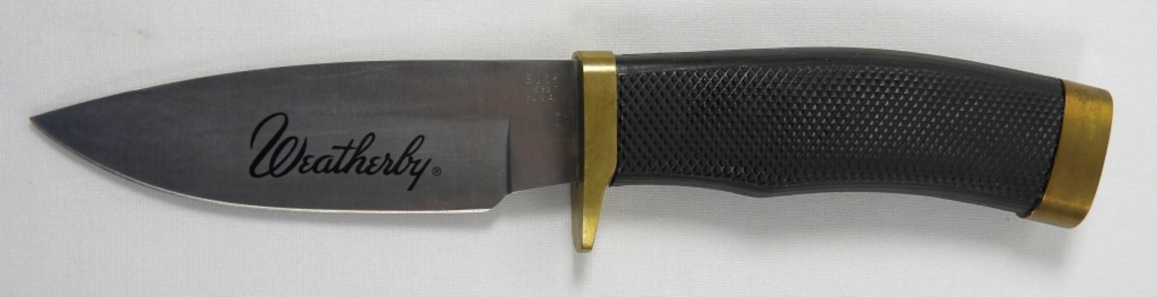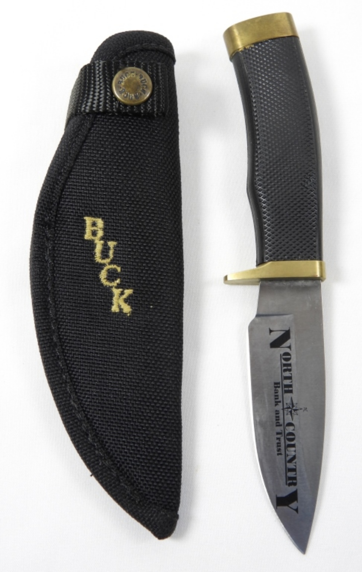 BUCK KNIFE 692 VANGUARD TEXTURIZED RUBBER FIXED BLADE KNIFE IN BLACK SHEATH. BLADE HAS COMPANY LOGO (NORTH COUNTRY BANK AND TRUST) IN BUCK KNIFE BOX