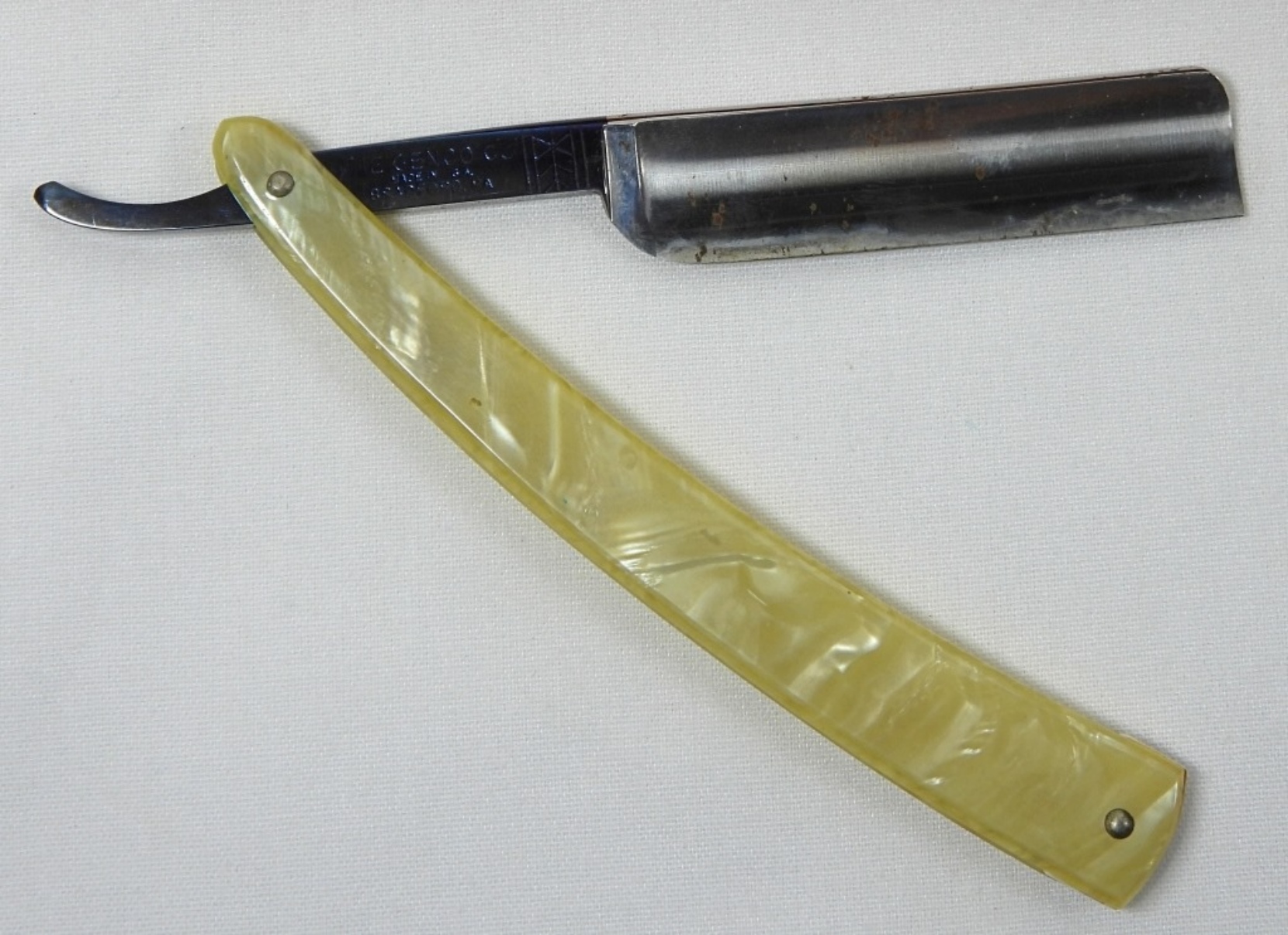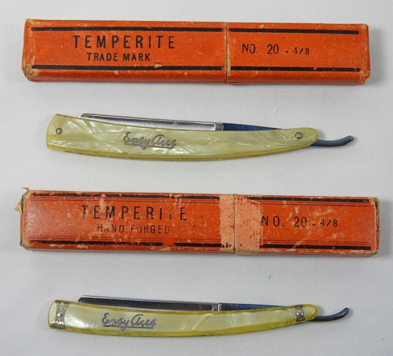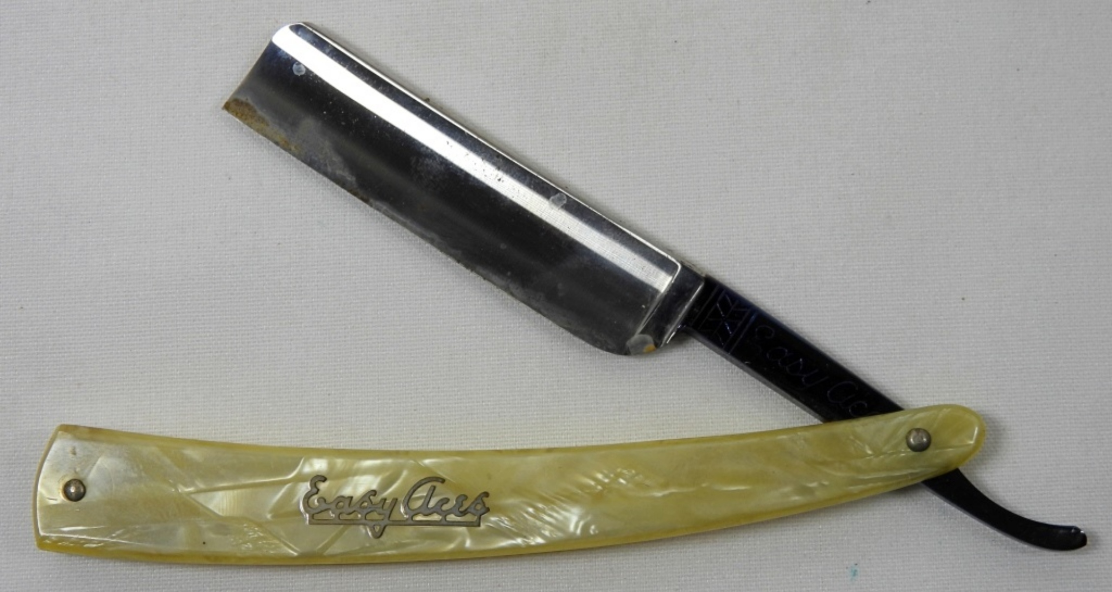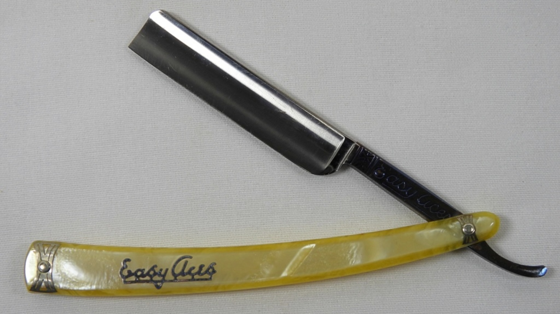 X2 VINTAGE EASY ACES, MARBLED STYLE HANDLE, STRAIGHT RAZOR IN RAZOR BOX. IN GOOD CONDITION-MINIMAL RUST ON BLADE
