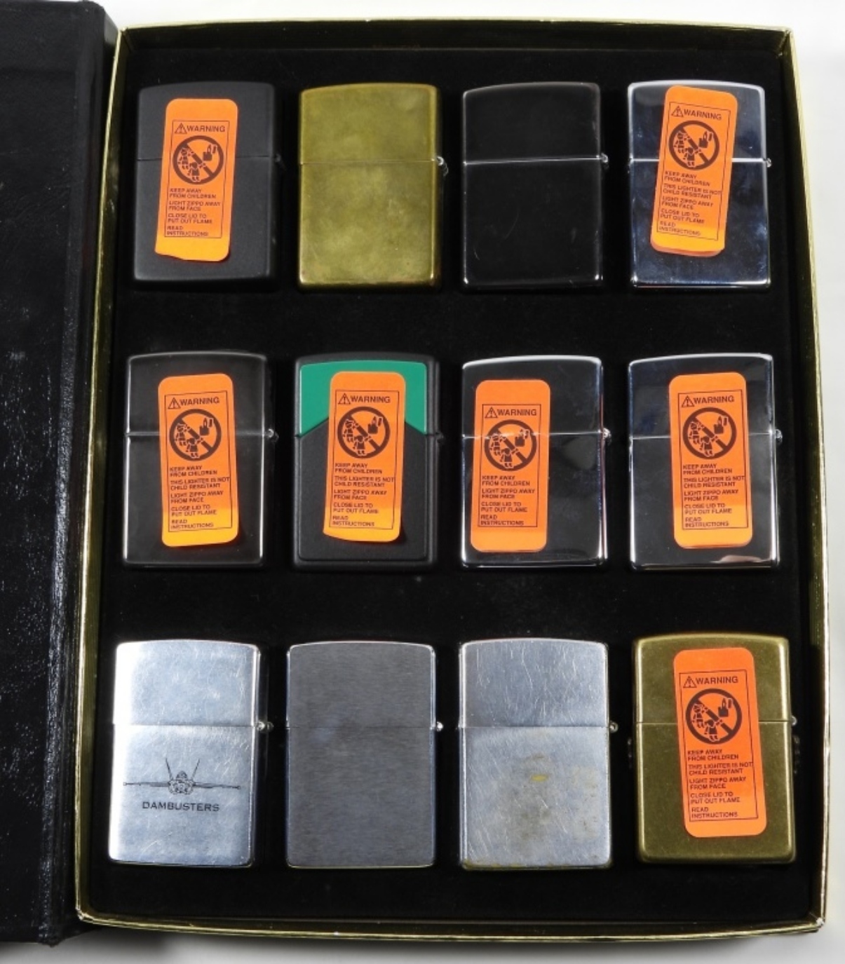 ZIPPO BLACK COLLECTORS CASE WITH 12 ASSORTED ZIPPOS. MIX OF SEALED, UNFIRED, AND 1 FIRED. SOME HARLEY DAVIDSON, MARLBORO, CAMEL AND MORE. SEE IMAGES.
