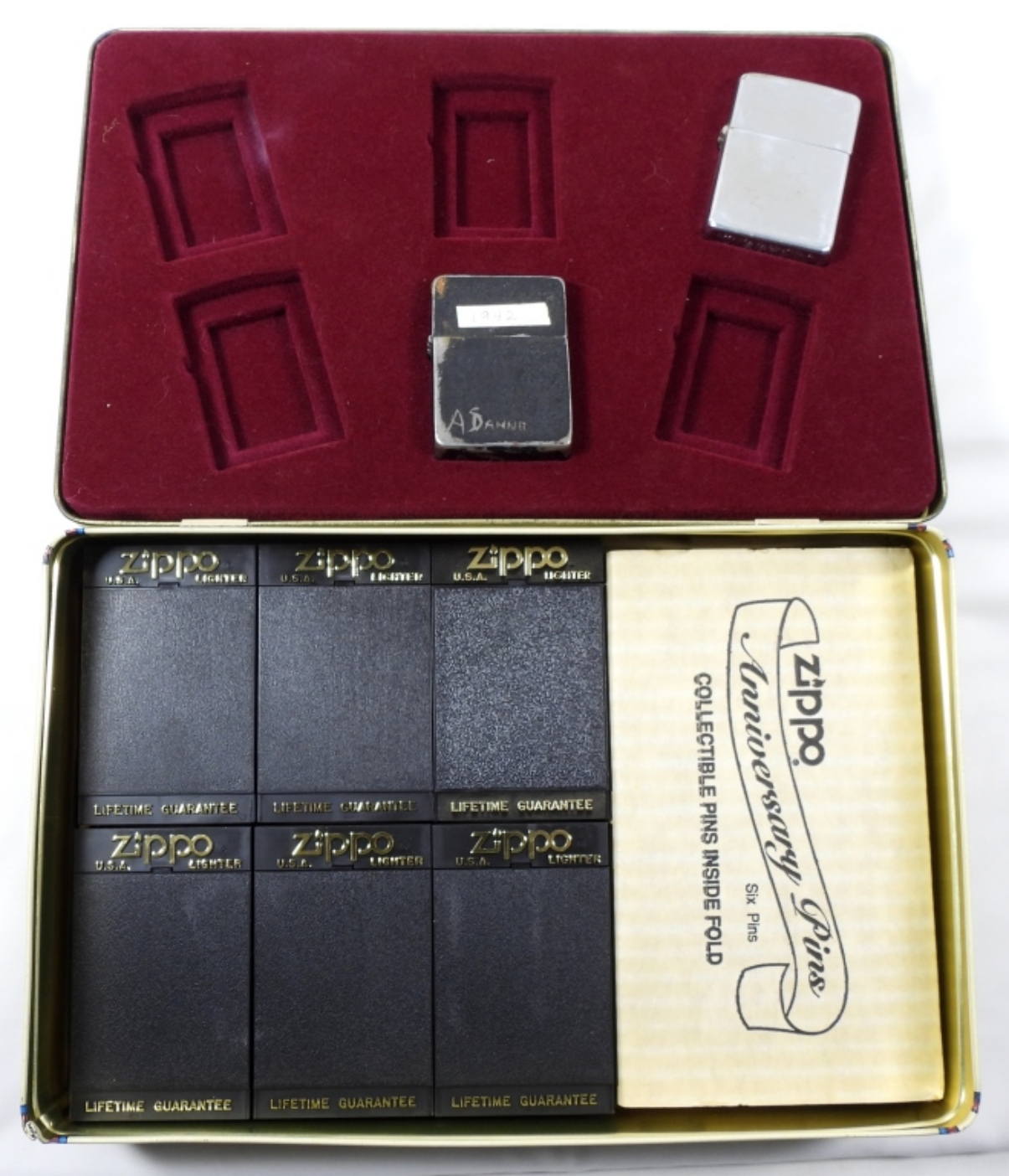 ZIPPO 60TH ANNIVERSARY TIN 1932-1992 WITH 2 FIRED ZIPPOS INSIDE & (6) EMPTY ZIPPO PLASTIC CASES – NO ANNIVERSARY PINS (SEE IMAGE)