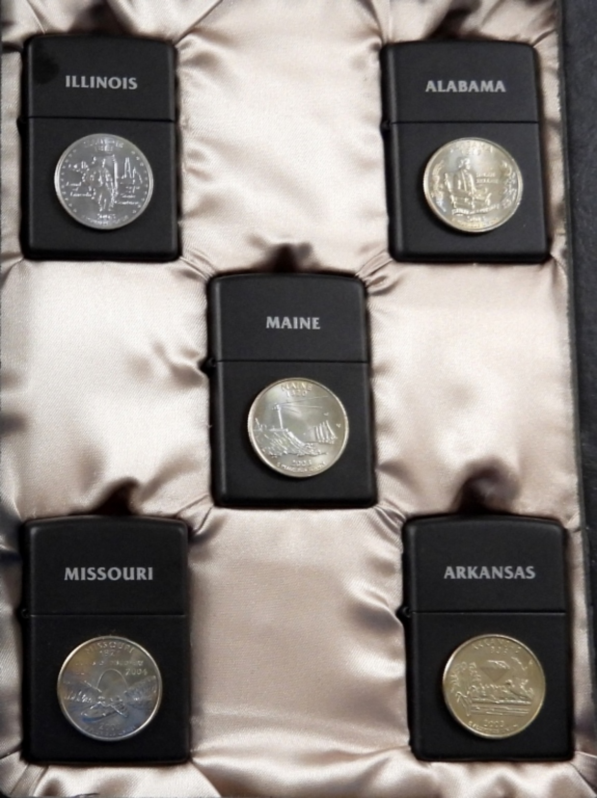 ALL ZIPPOS ARE SEALED IN ORIGINAL BLACK AND SATIN CASE, ALABAMA, ILLINOIS, MAINE, MISSOURI, ARKANSAS