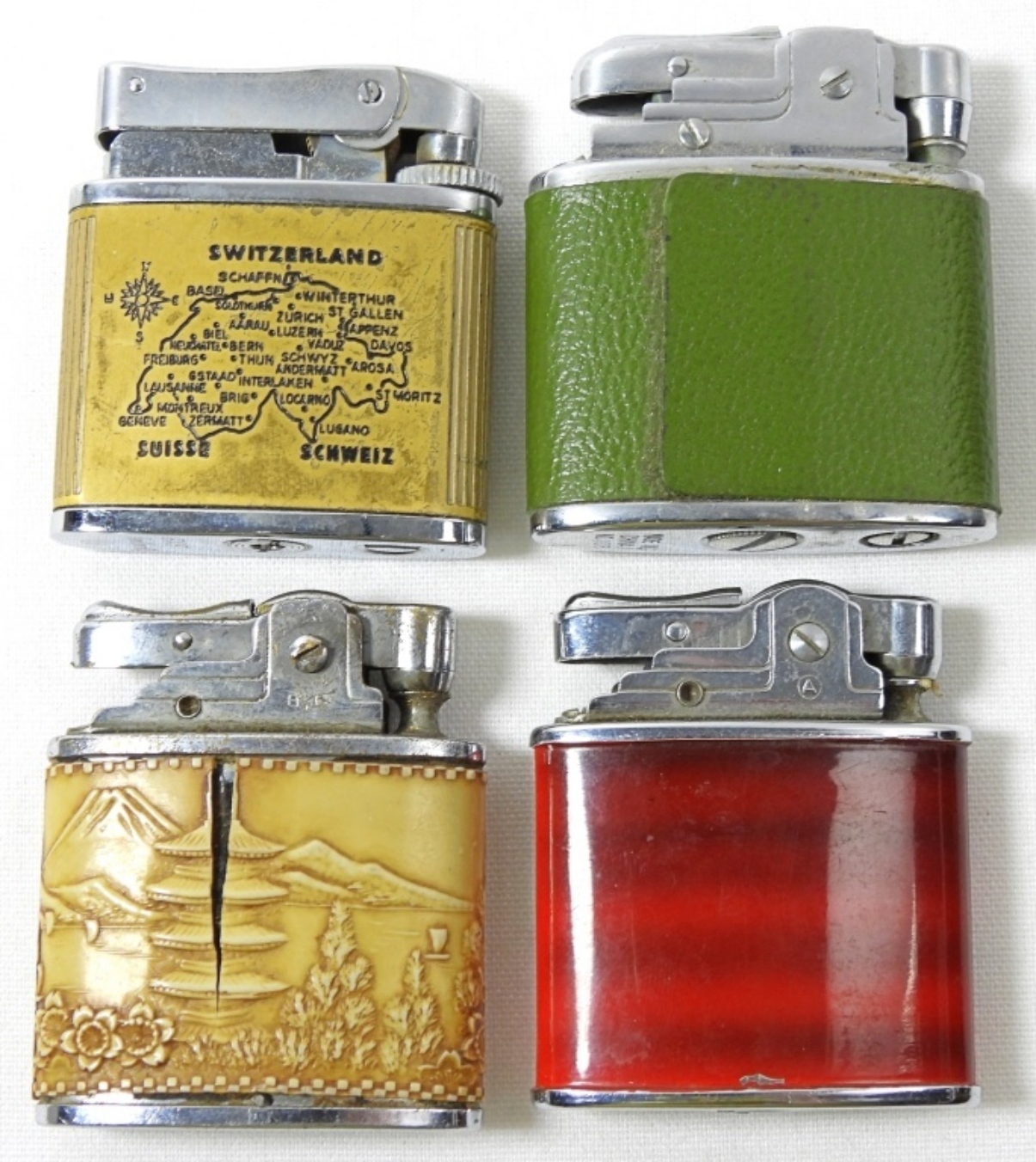 4 ASSORTED TRAVEL INSPIRED LIGHTERS: NIAGARA FALLS, JAPAN, SWITZERLAND. MIXED CONDITIONS