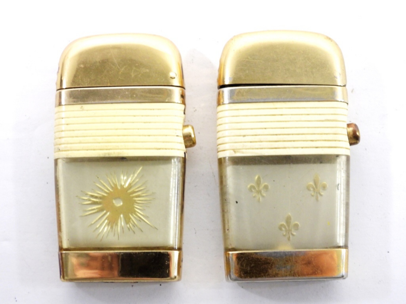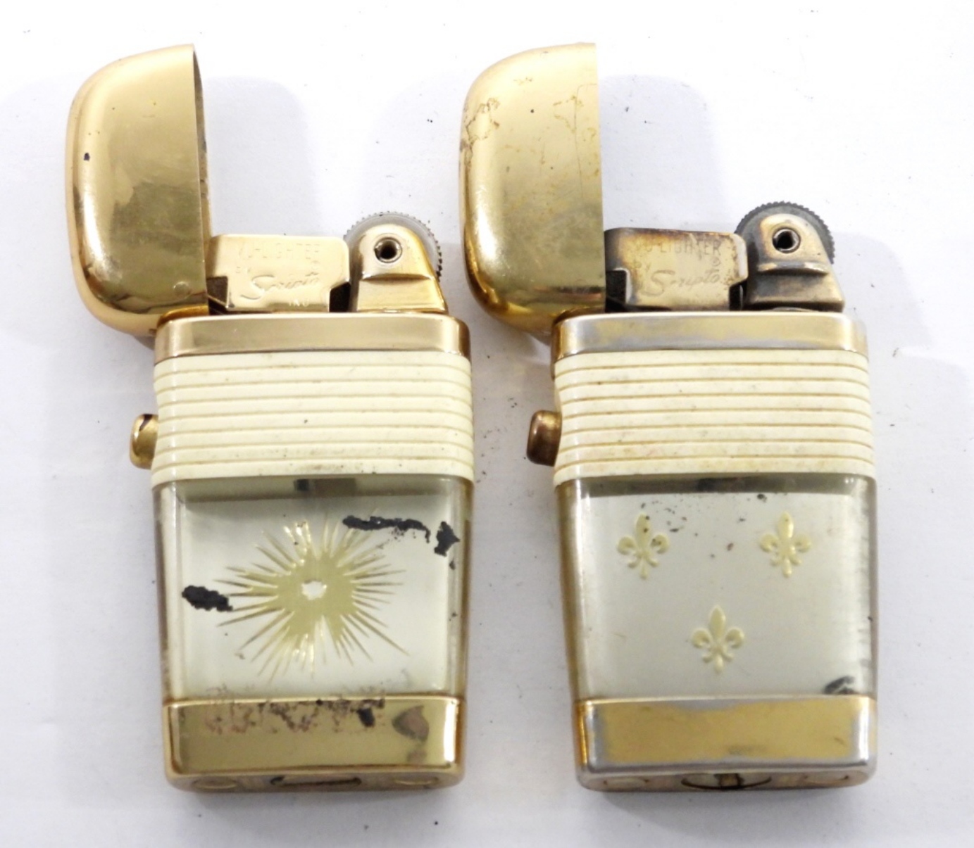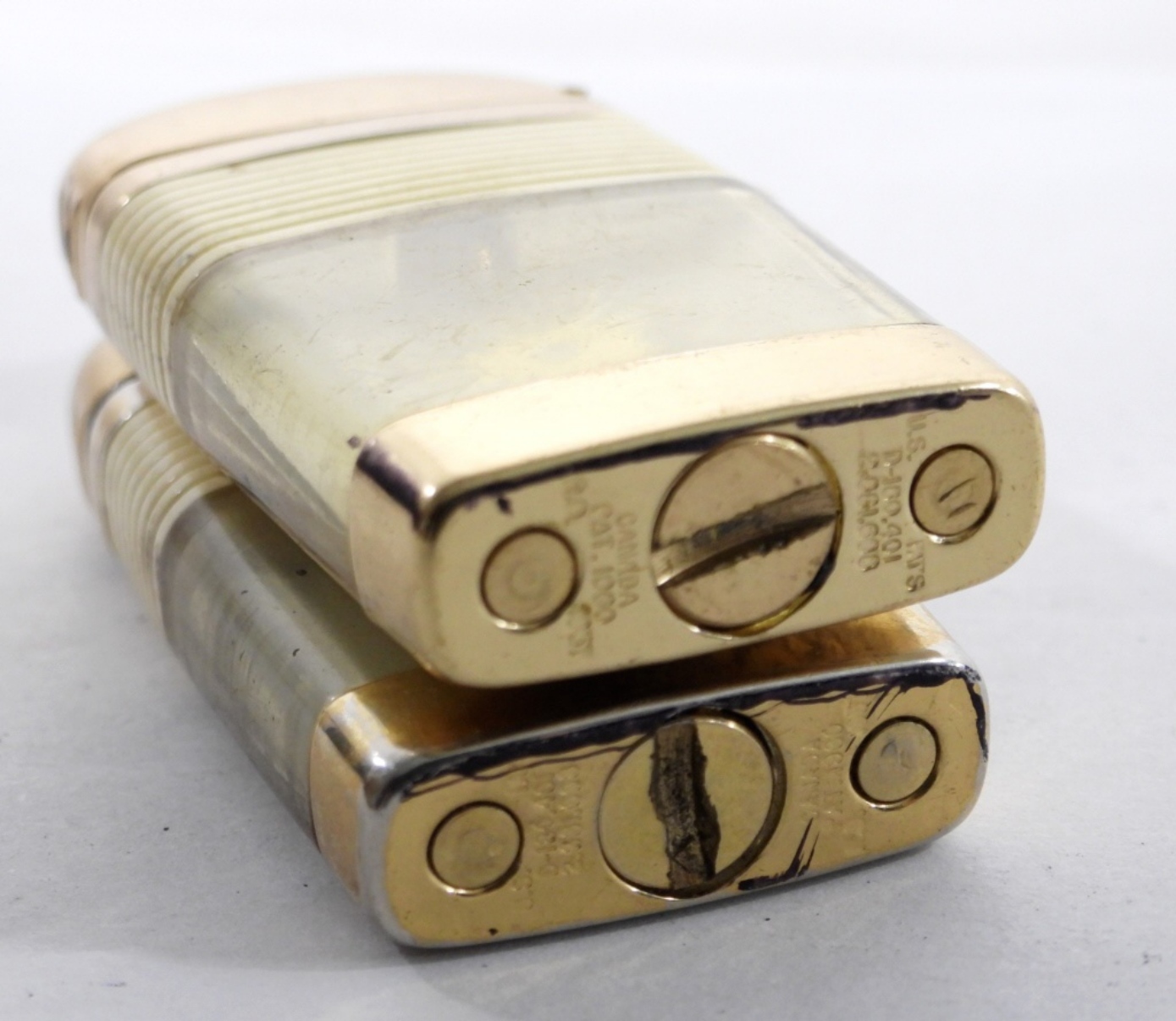 2- UV LIGHTERS BY SCRIPT IN GOLD TONES- BOTH HAVE BEEN FIRED. THEY BOTH SHOW WEAR, PREOWNED. IN GOOD CONDITION.