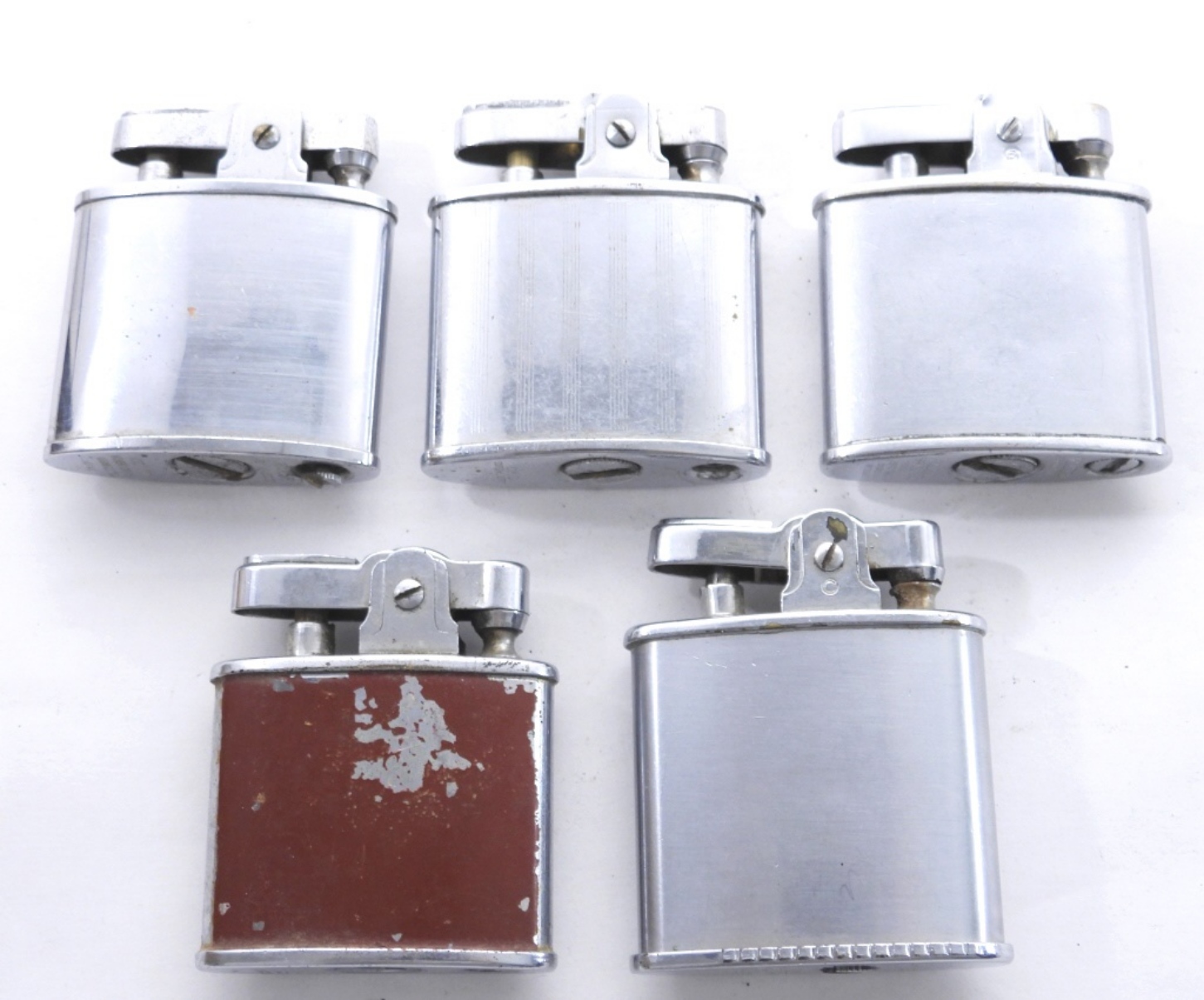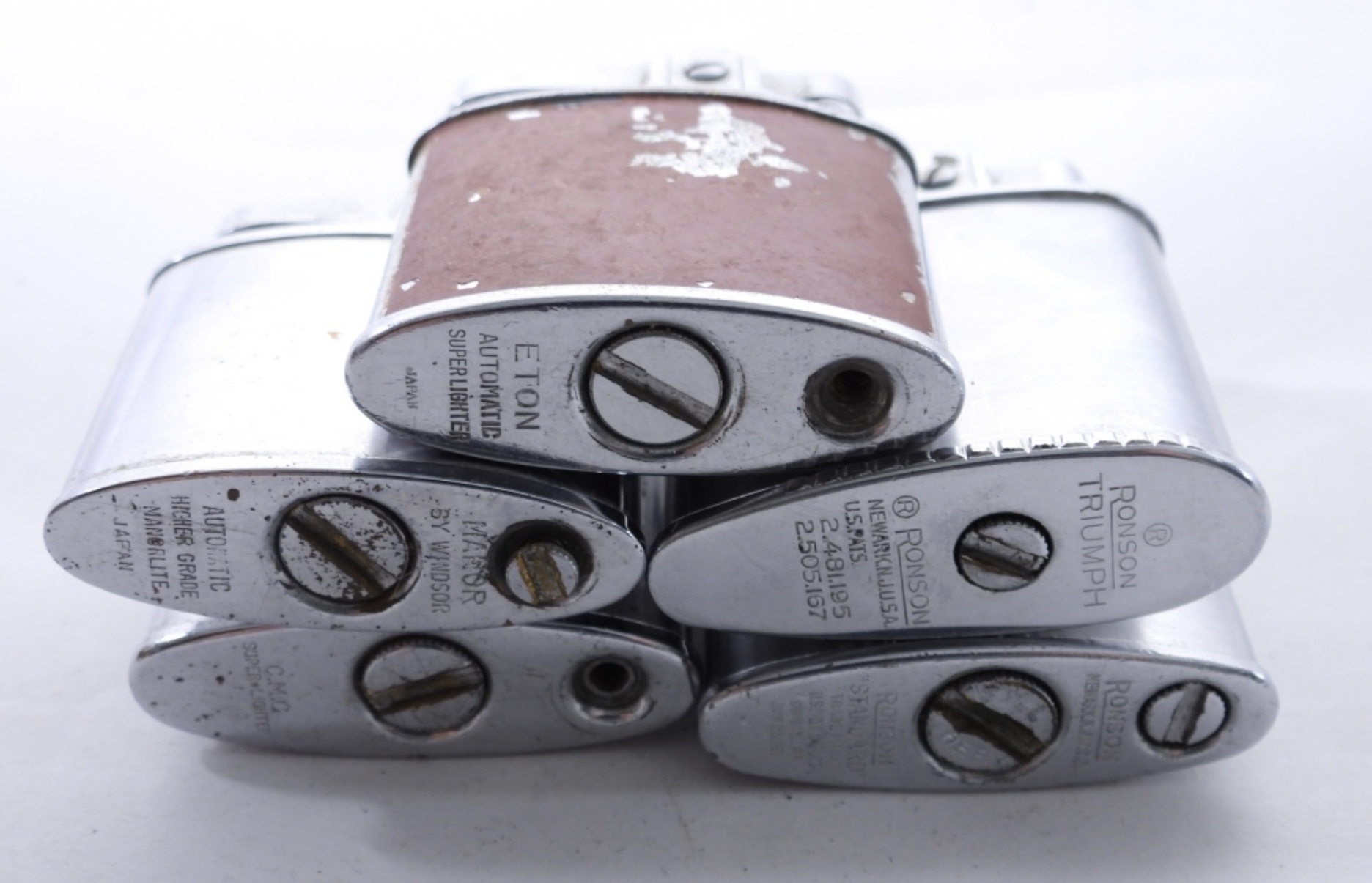 5- VINTAGE HANDLE HELD LIGHTERS- BRANDS ARE- ETON, MANOR, RONSON TRIUMPH- HAS THE NAME BEN ON THE FRONT, RONSON, C.M.C – BRANDS ARE UNSEARCHED AND UNVERIFIED. FIRED. IN GOOD CONDITION. THEY DO SHOW SOME WEAR, PREOWNED.