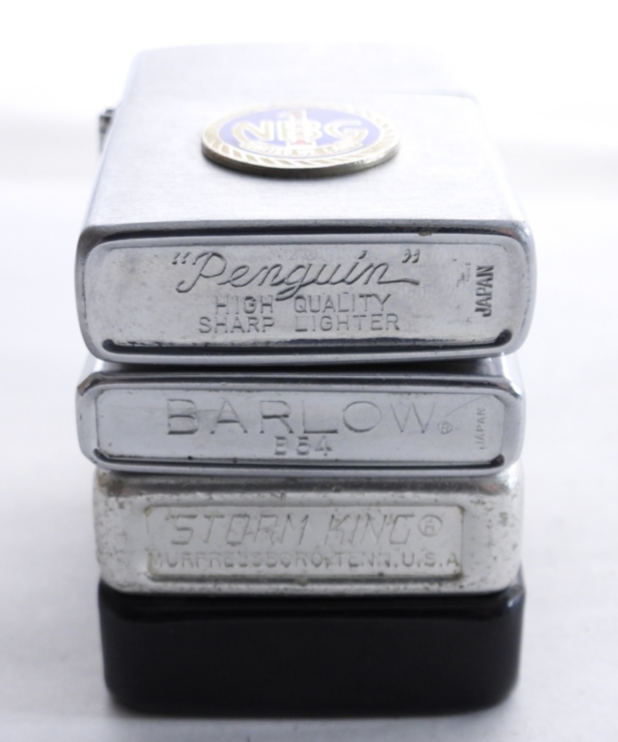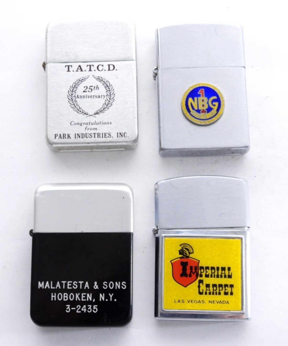 4- ADVERTISING LIGHTERS- IMPERIAL CARPET (FIRED)- BARLOW. T.A.T.C.D. (FIRED)- STORM KING. MALATESTA & SONS HOBOKEN, N.Y. (FIRED), NBG (FIRED). ALL OF THESE SHOW WEAR, PREOWNED. UNSEARCHED & UNVERIFIED.