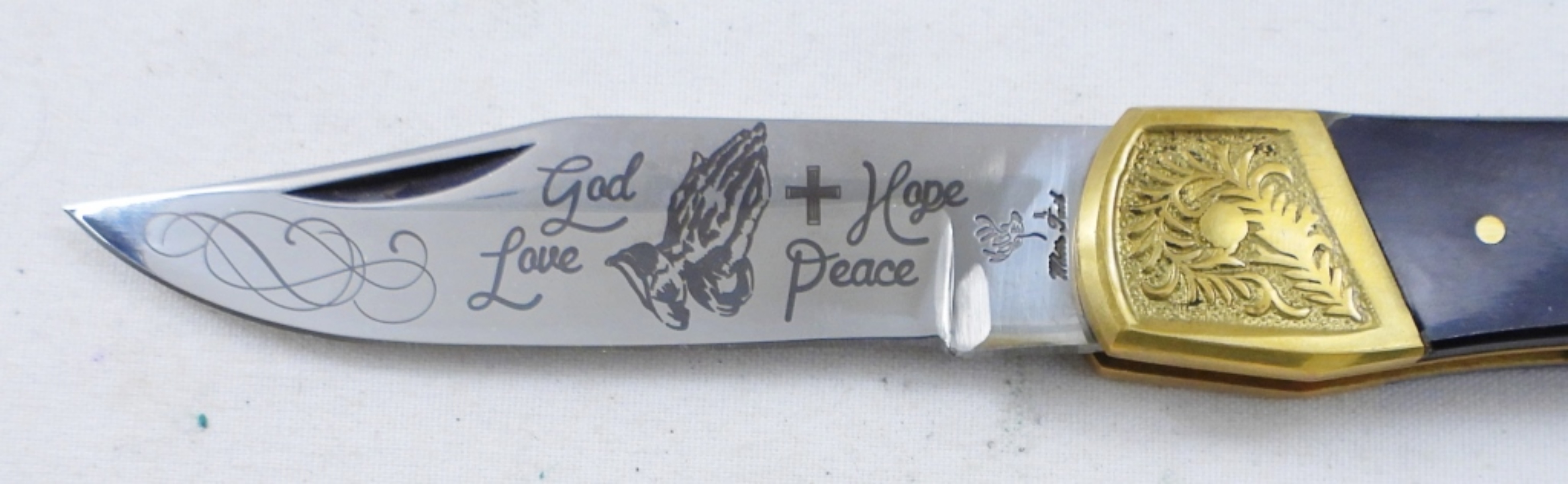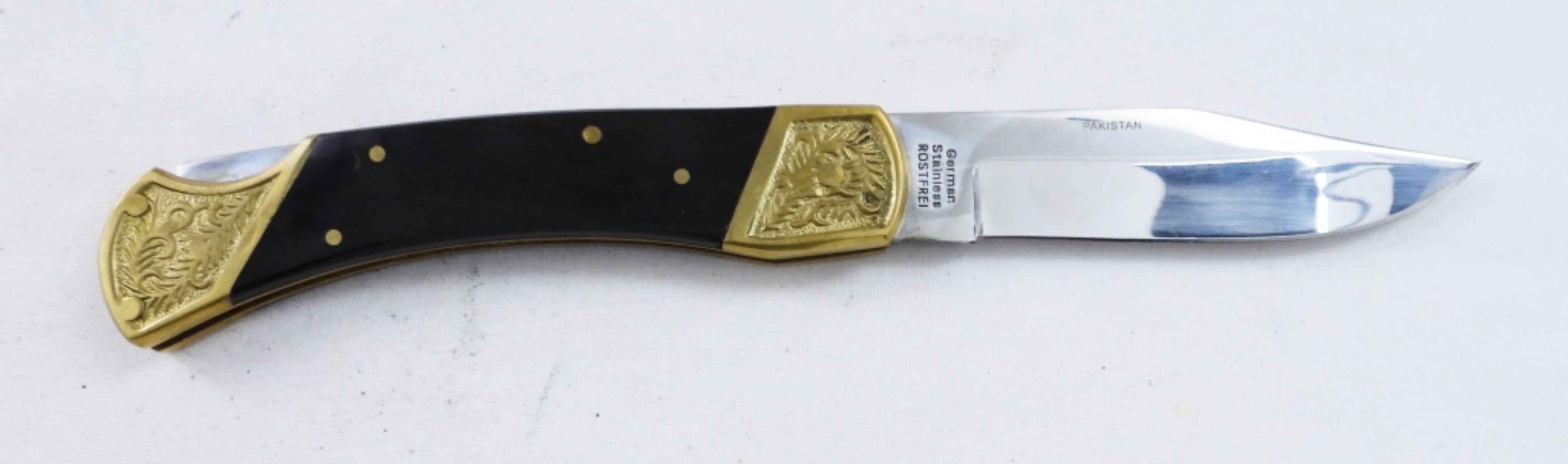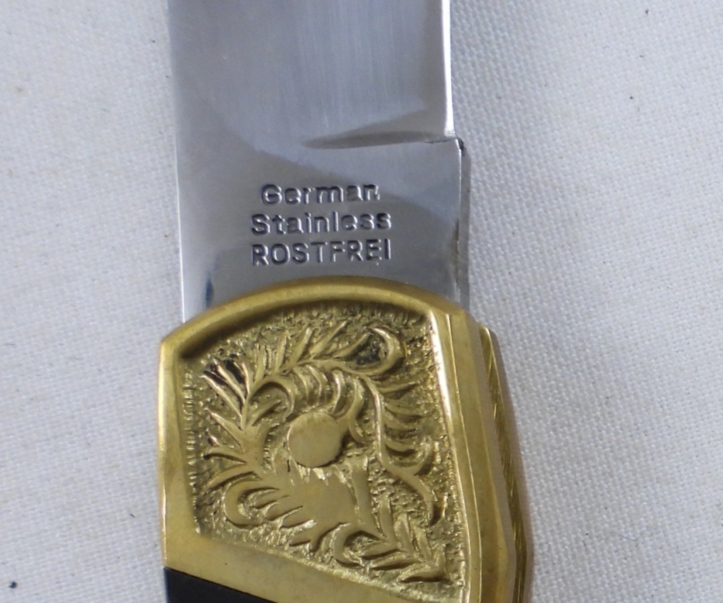 GERMAN STAINLESS FOLDING KNIFE WITH WORDING ON BLADE, GOLD AND BLACK HANDLE DETAILS