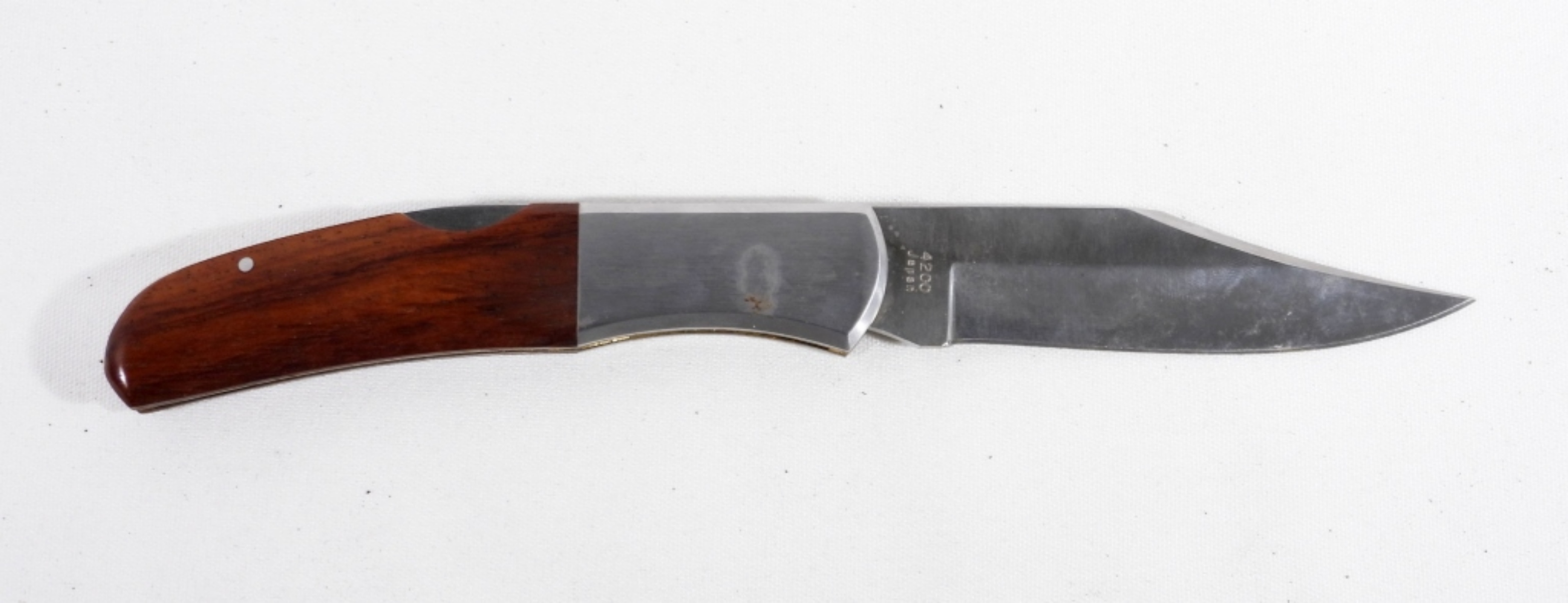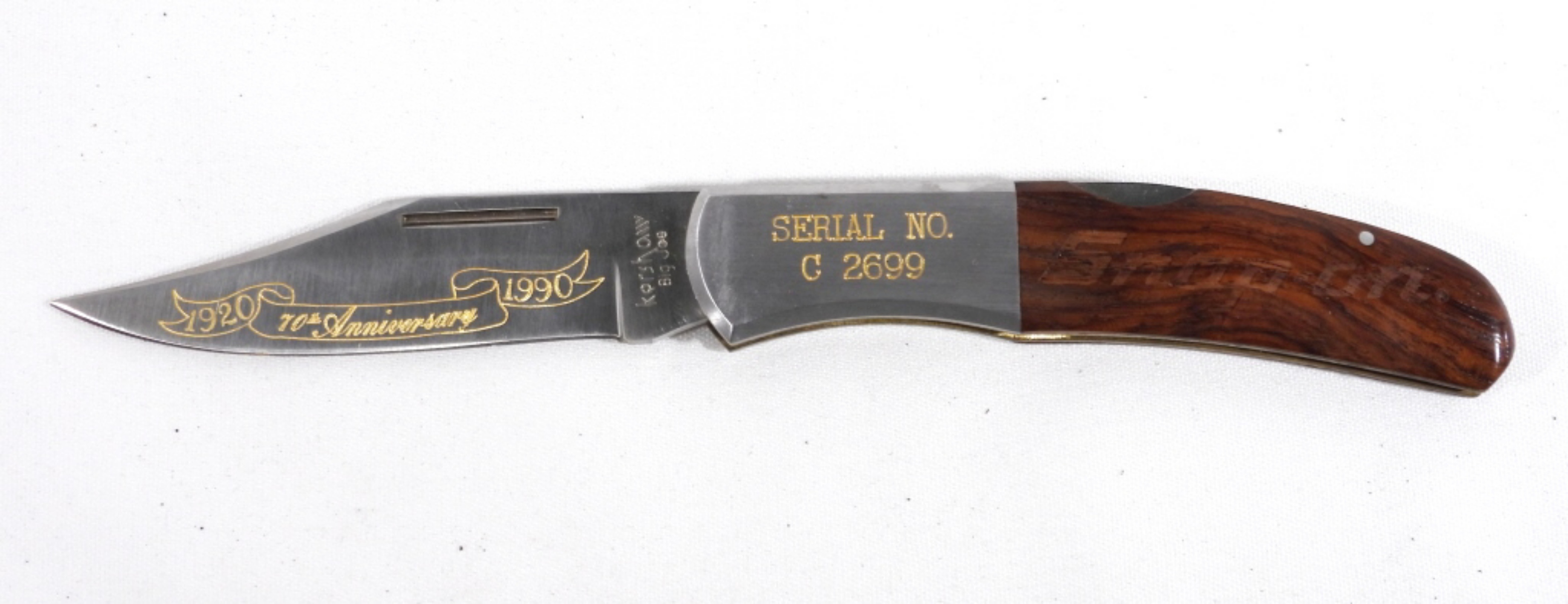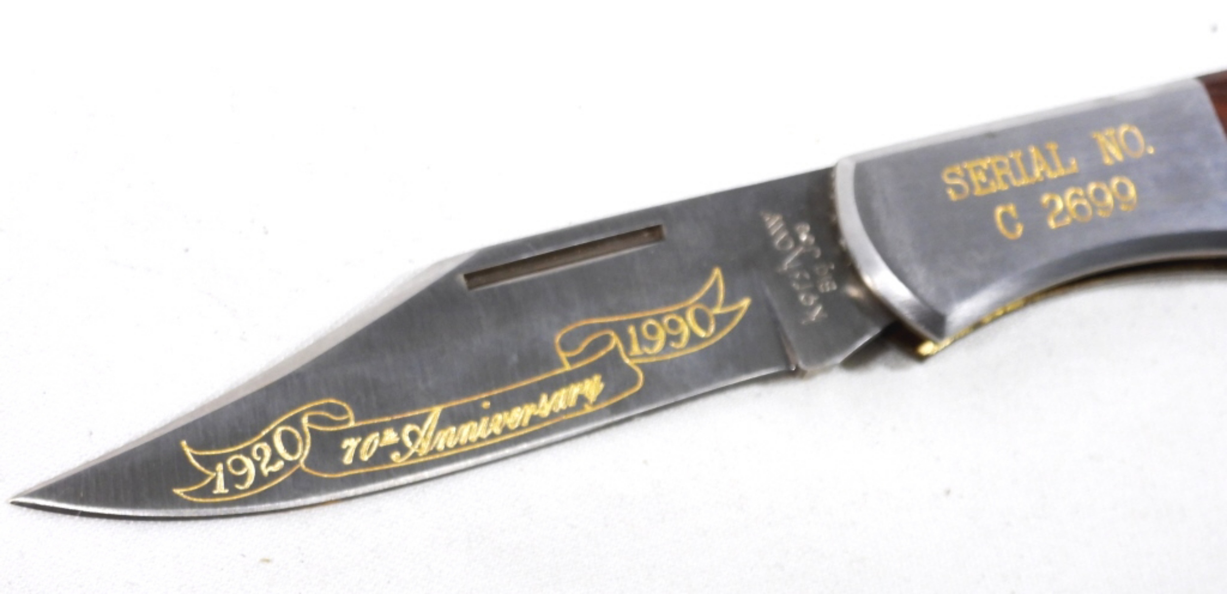 KERSHAW BIG JOE 4200 FOLDING KNIFE IN LEATHER SHEATH. 70TH ANNIVERSARY ENGRAVED ON BLADE. IN GREAT CONDITION.