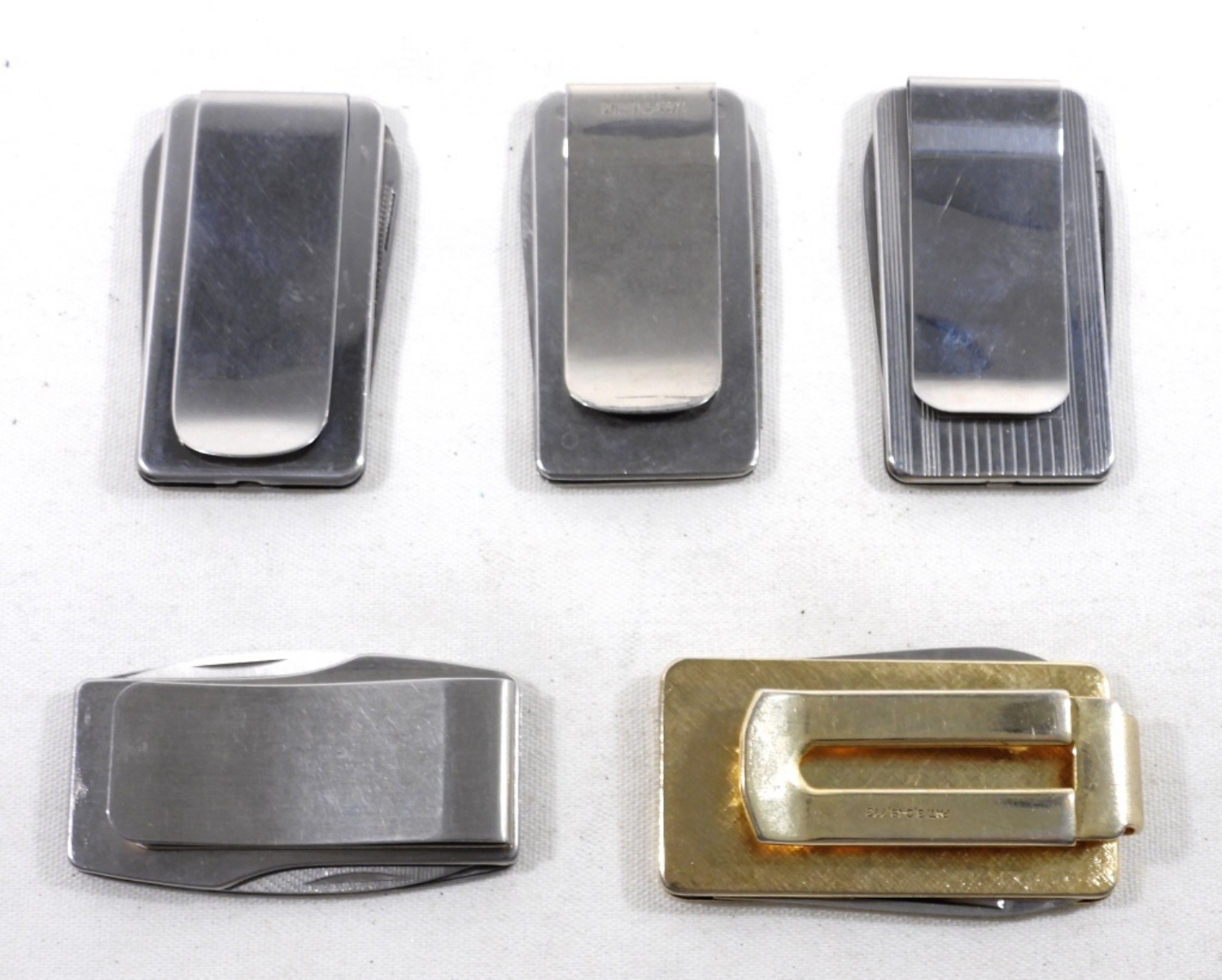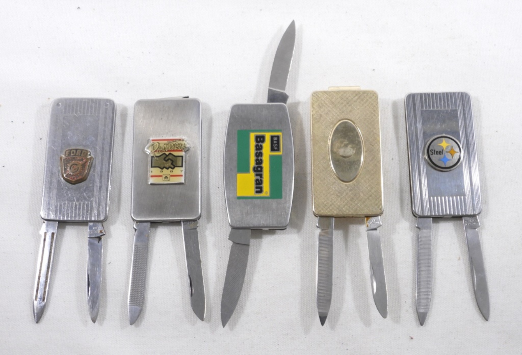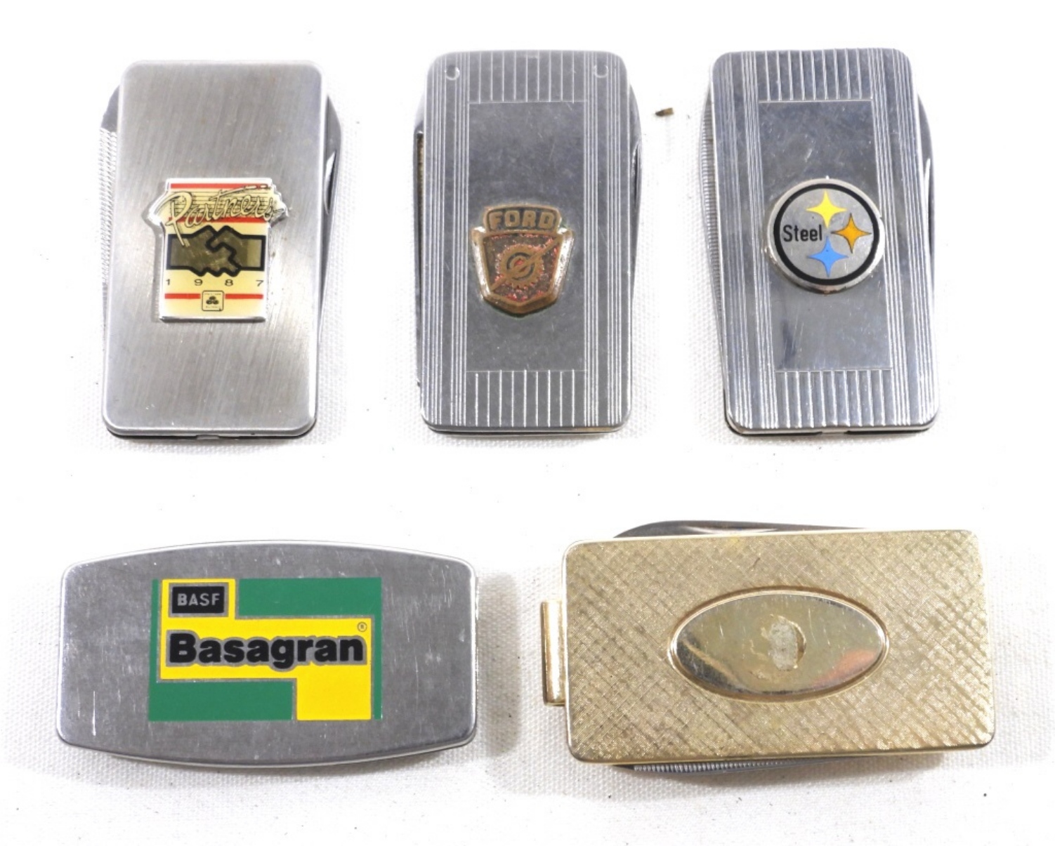 5 ASSORTED MONEY CLIP POCKET KNIFE LOT. ASSORTED DESIGNS ON FRONT, MIXED CONDITIONS.