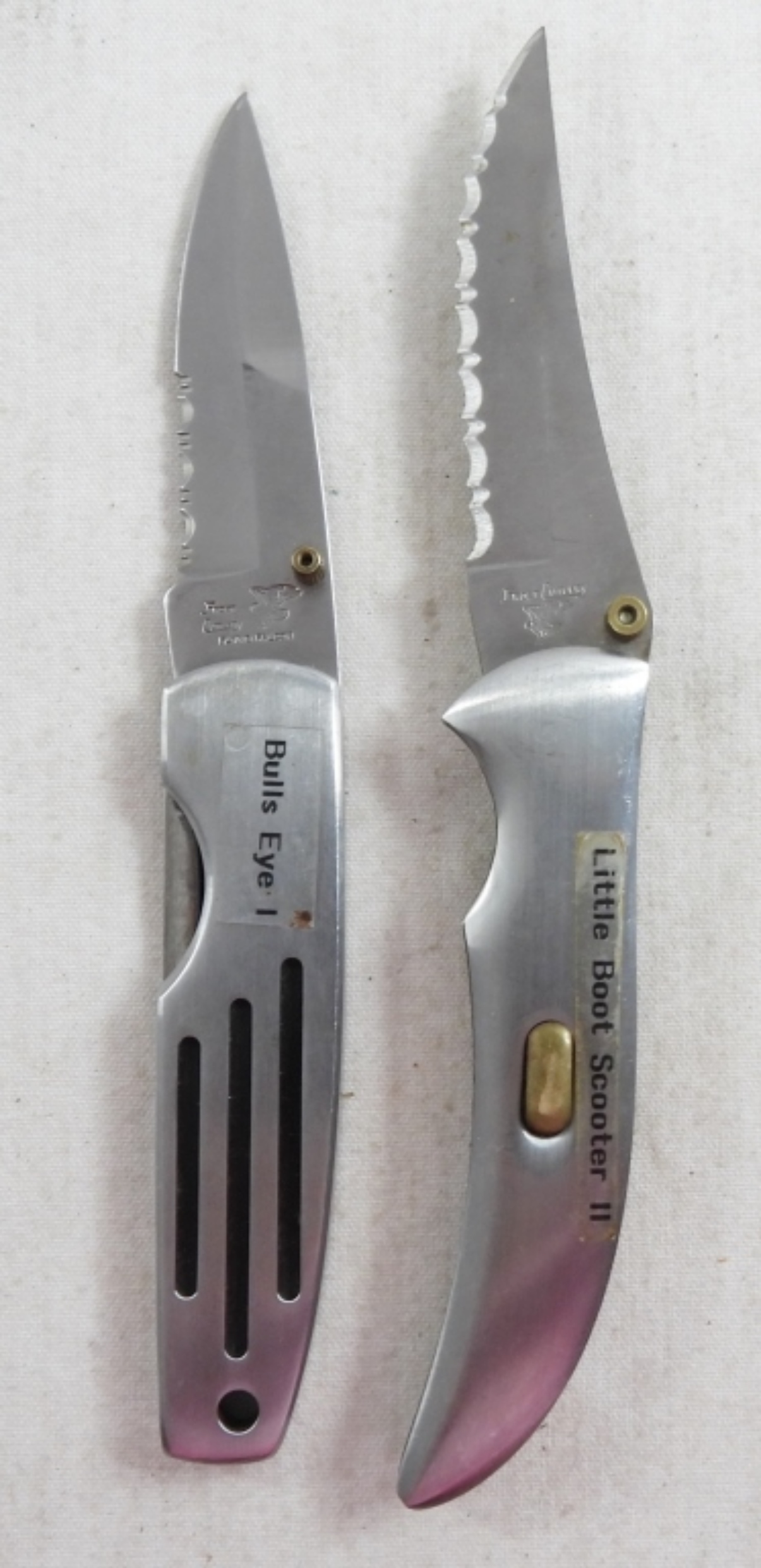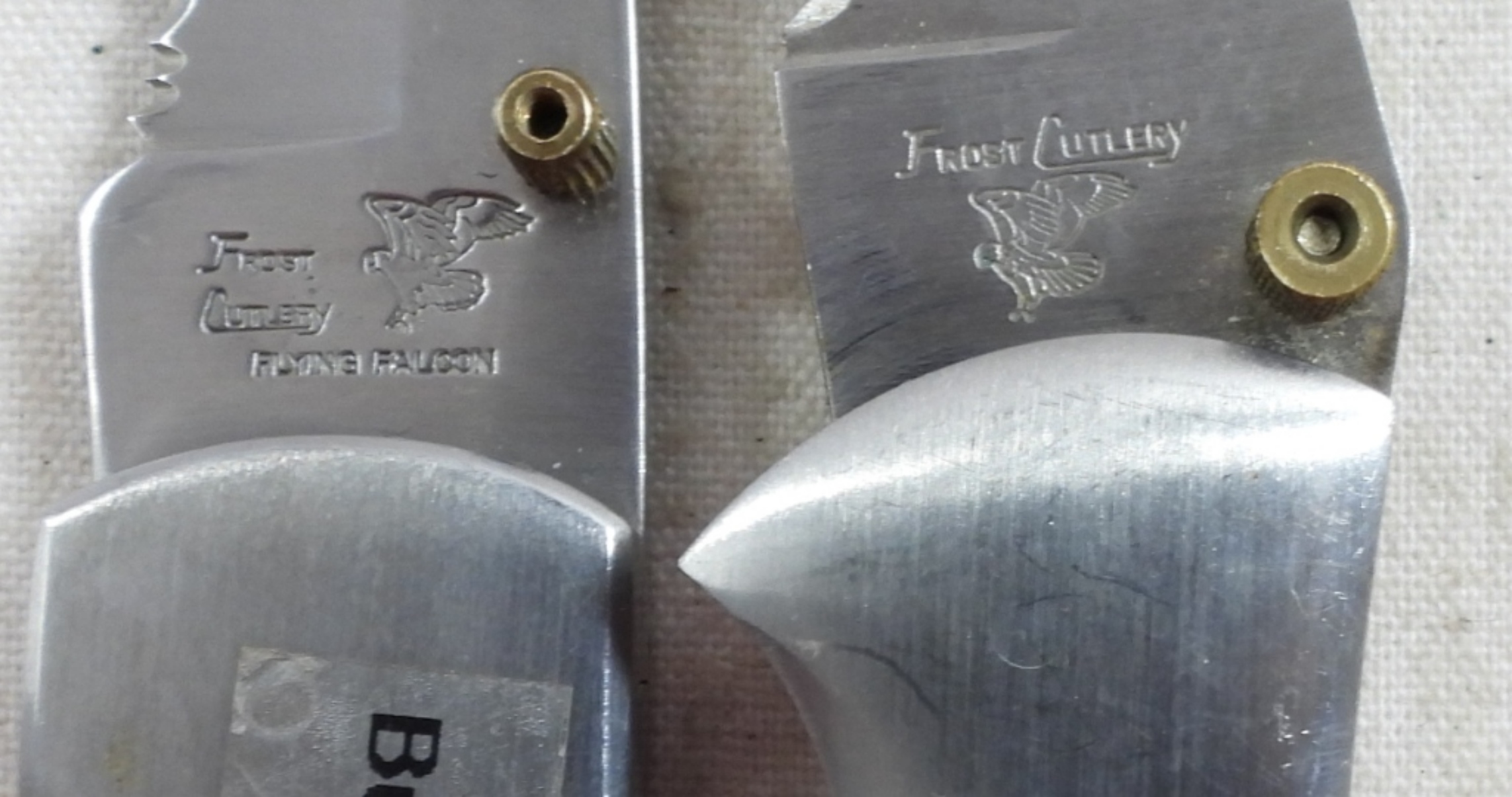 (2) FROST CUTLERY SINGLE BLADE KNIVES, (1) 3.5 ” LOCK BACK KNIFE, & A 3″ FLYONG FALCON SIDE LOCK KNIFE