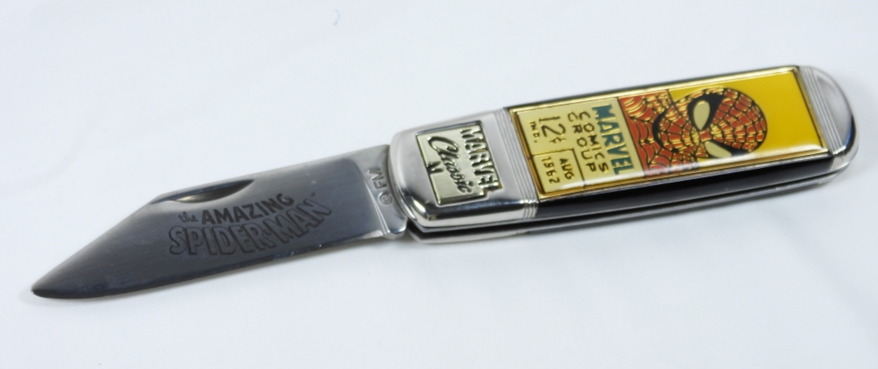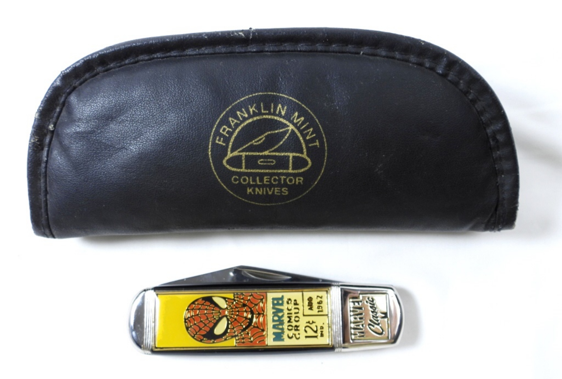 FRANKLIN MINT COLLECTORS KNIFE: MARVEL. KNIFE IN GREAT CONDITION. IN FRANKLIN MINT COLLECTORS CASE. MARVEL THE AMAZING SPIDERMAN IMAGERY ON FRONT AND ON BLADE. FOLDING LOCKBACK KNIFE.