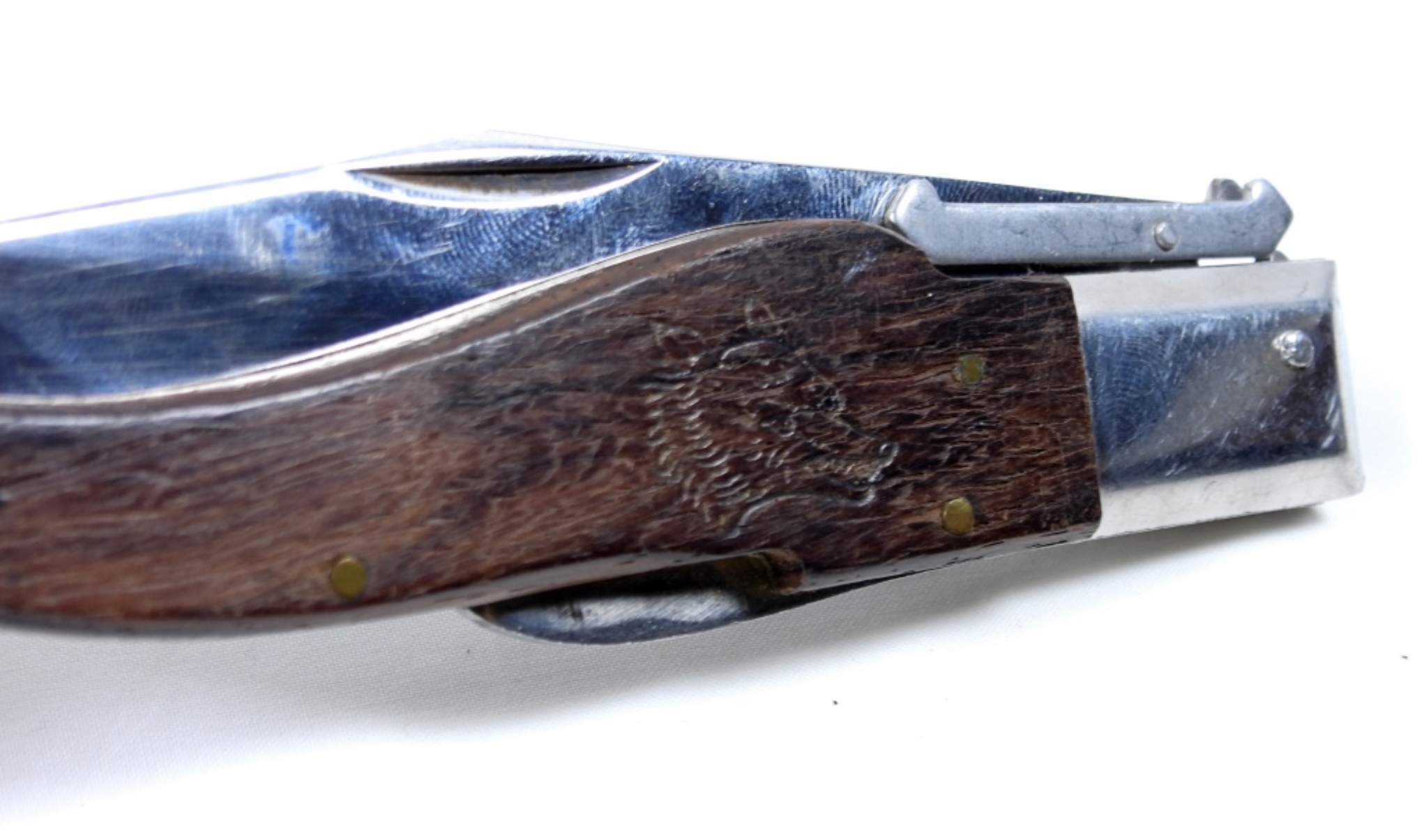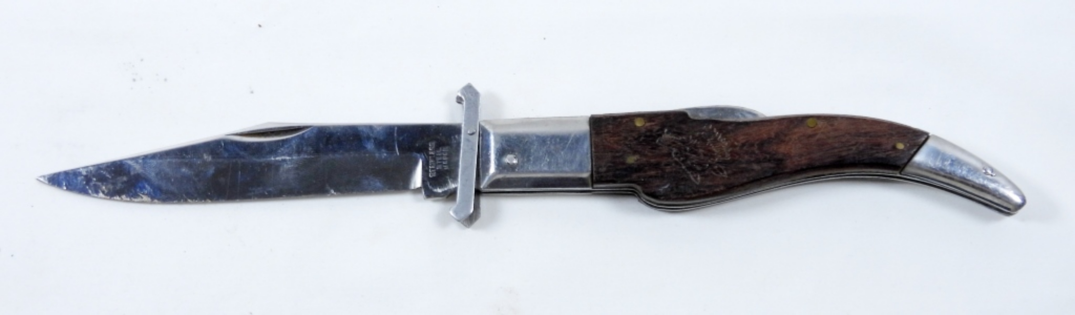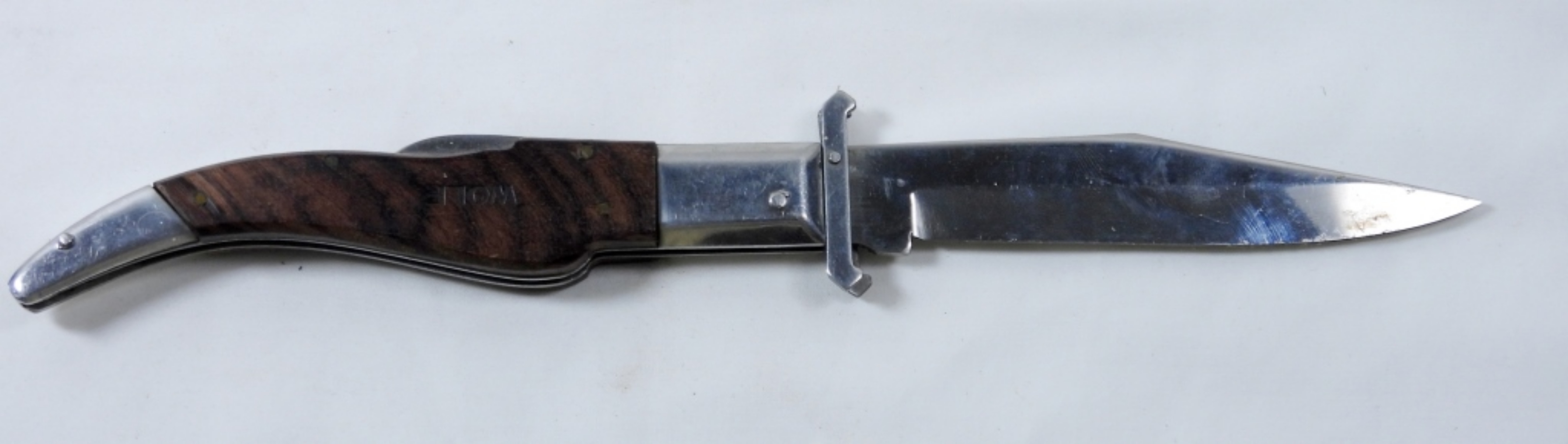WOLF BROWN WOODEN HANDLE LOCKBACK FOLDING KNIFE IN BLACK CANVAS SHEATH.