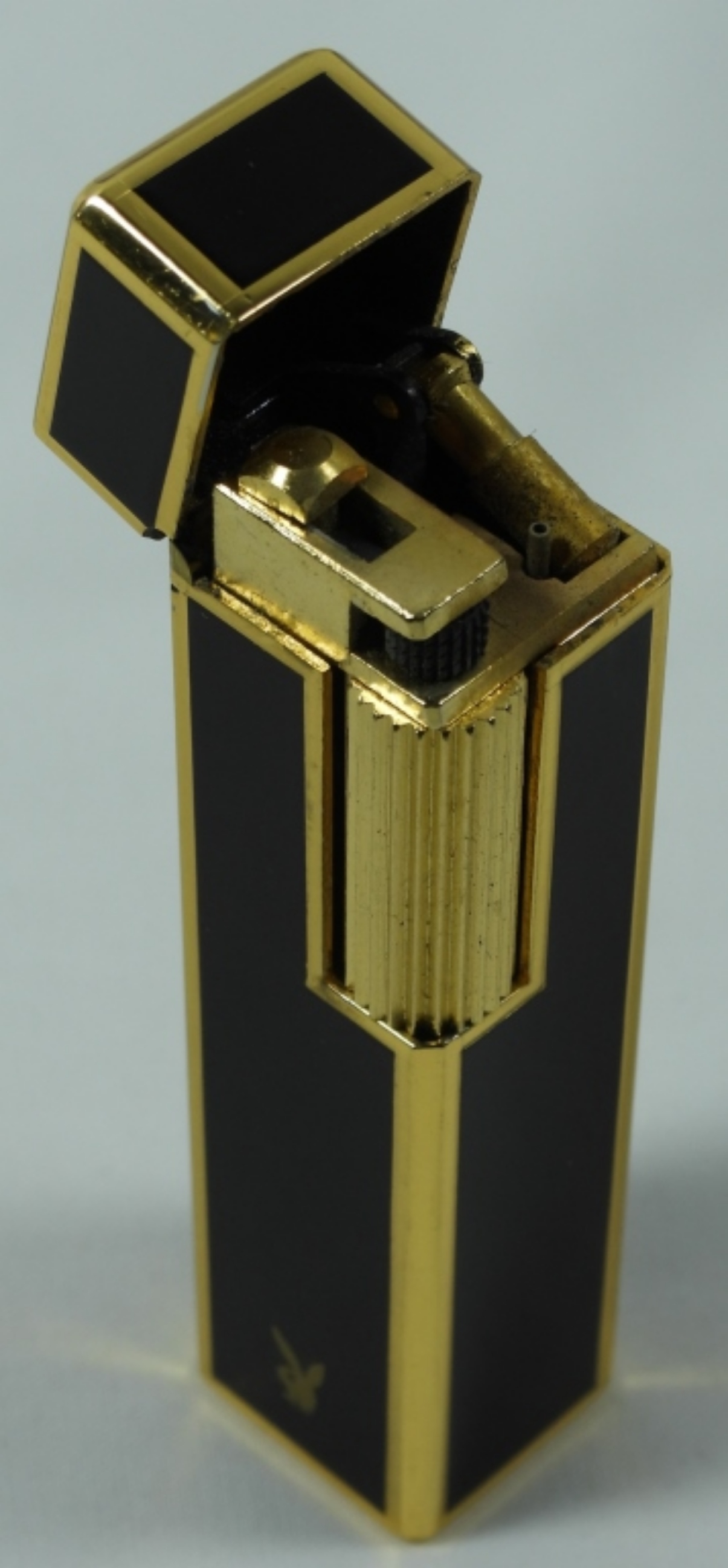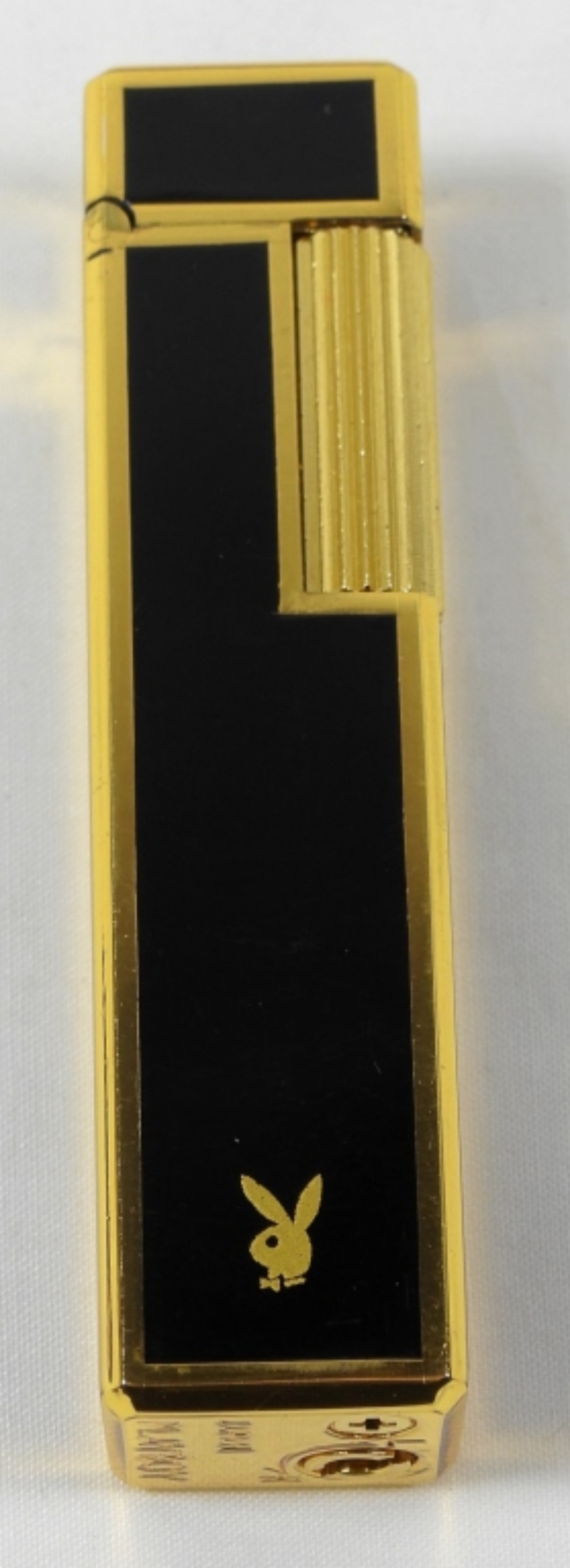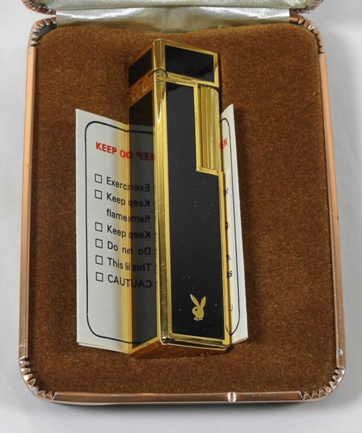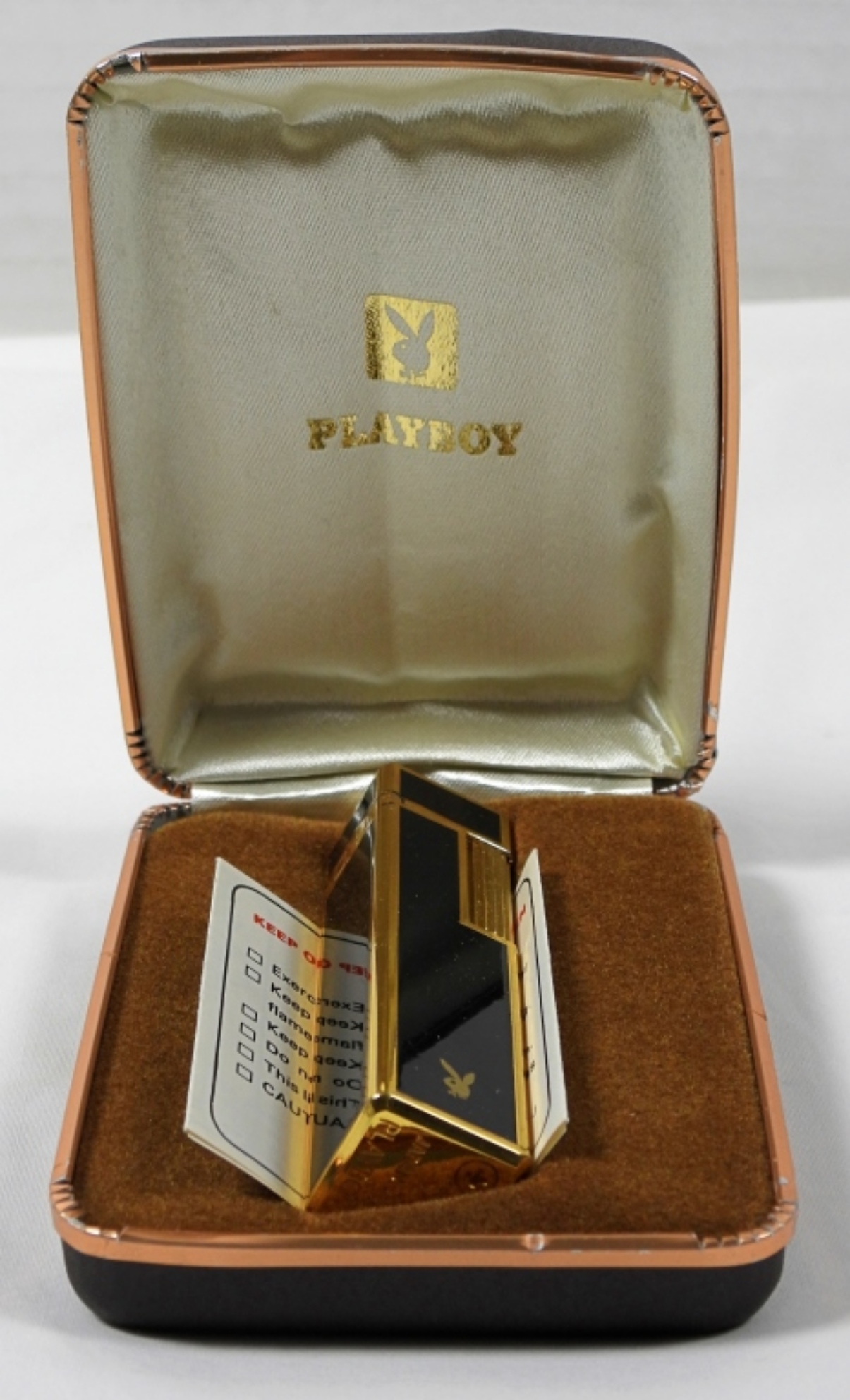 VINTAGE PLAYBOY BUTANE LIGHTER GREAT CONDITION IN CASE (CASE SLIGHTLY DAMAGED), MADE IN JAPAN. BLACK AND GOLD TONES