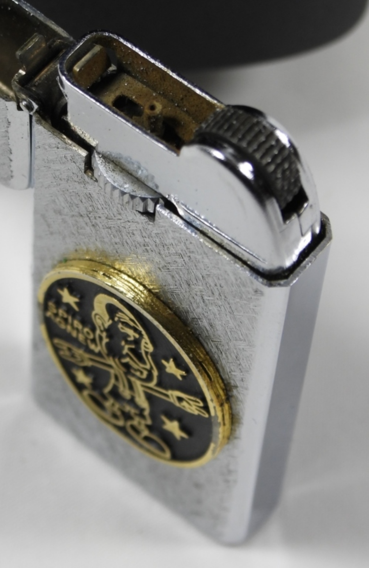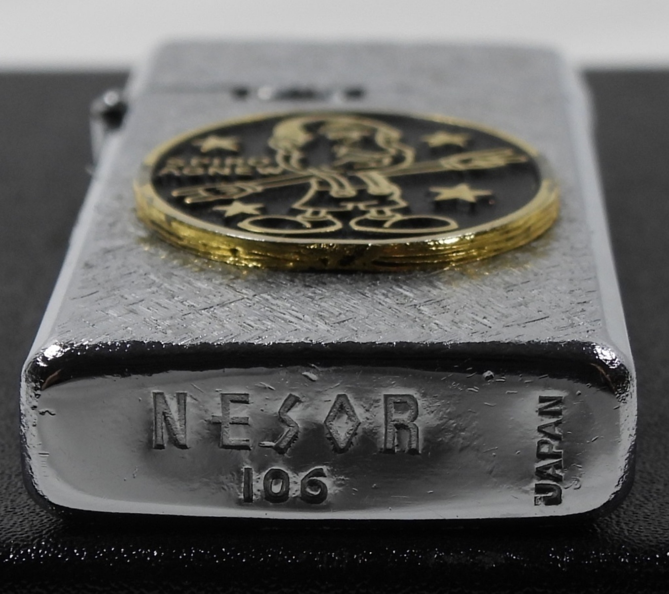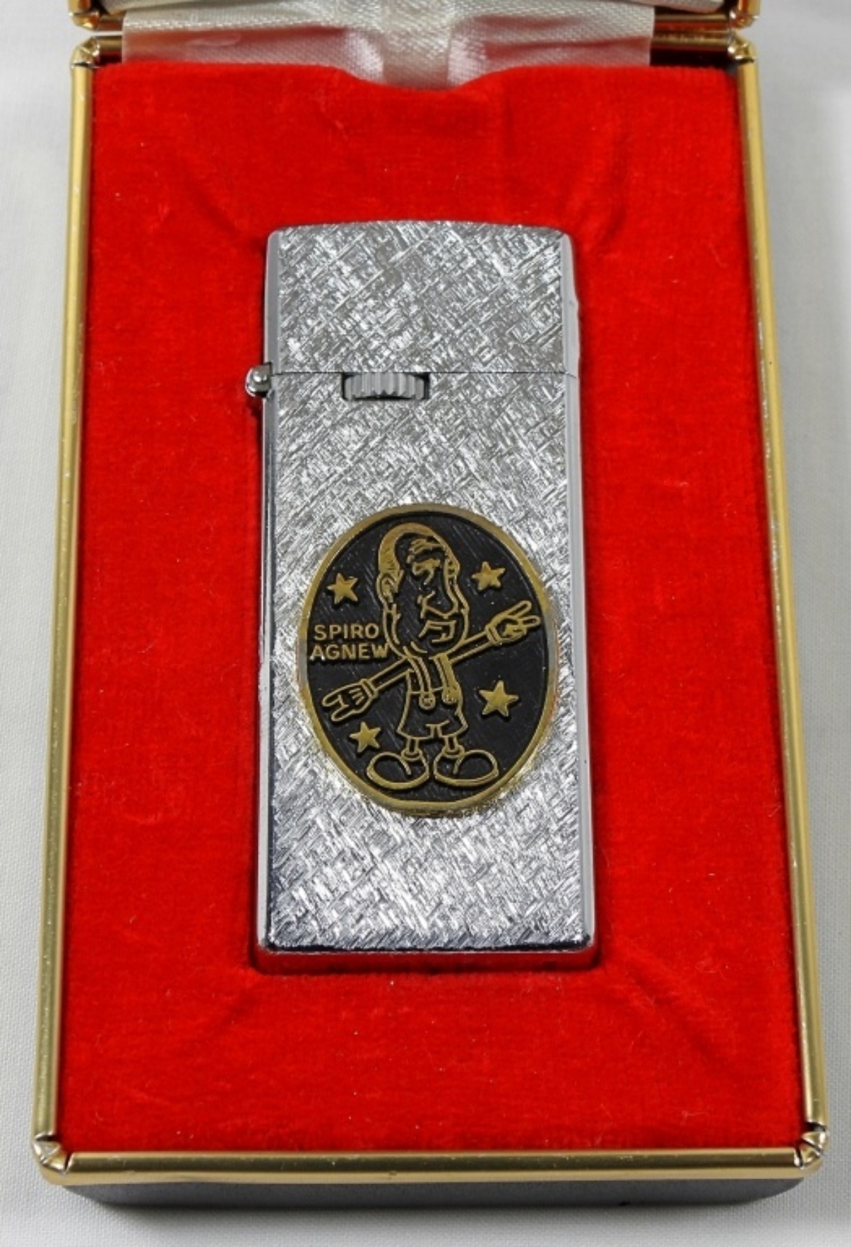 VINTAGE NESOR 106 LIGHTER IN CASE. SPIRO AGNEW CARICATURE ON FRONT