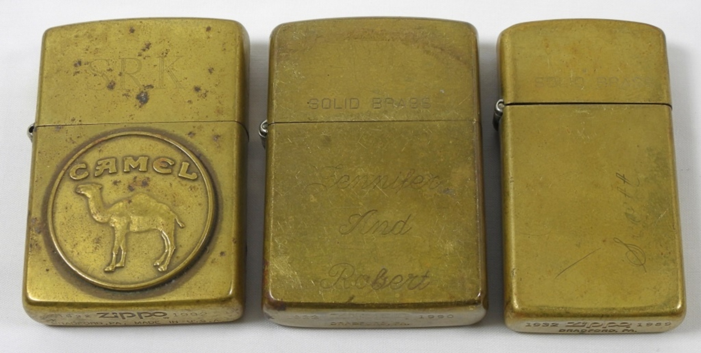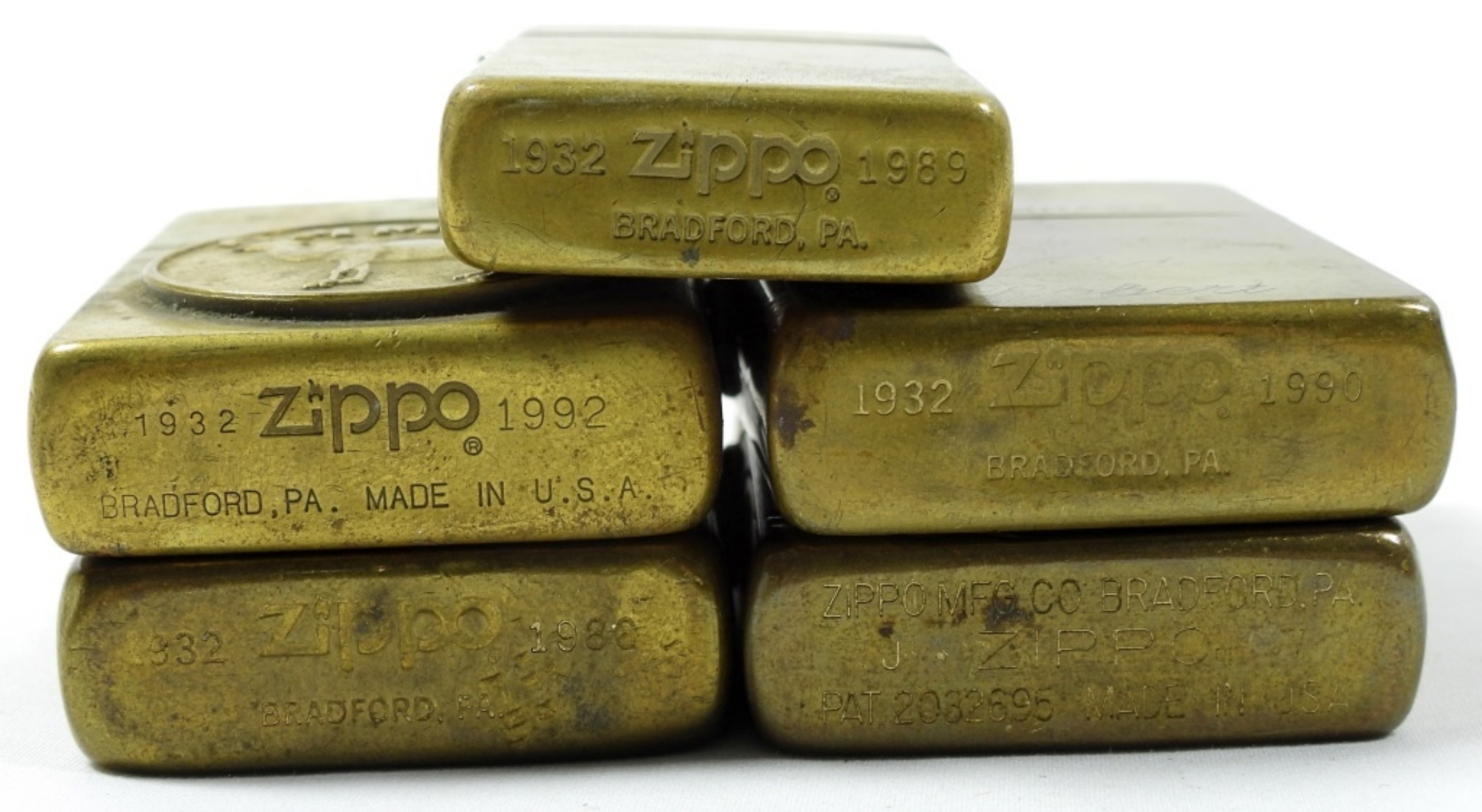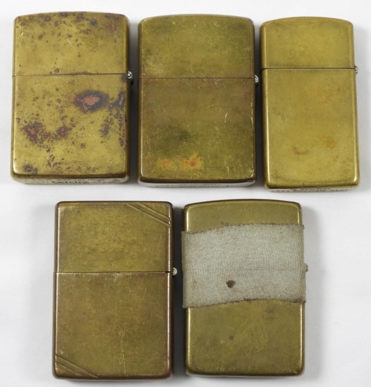 5 ASSORTED YEARS BRASS ZIPPOS, MIXED CONDITIONS–ALL BEEN FIRED