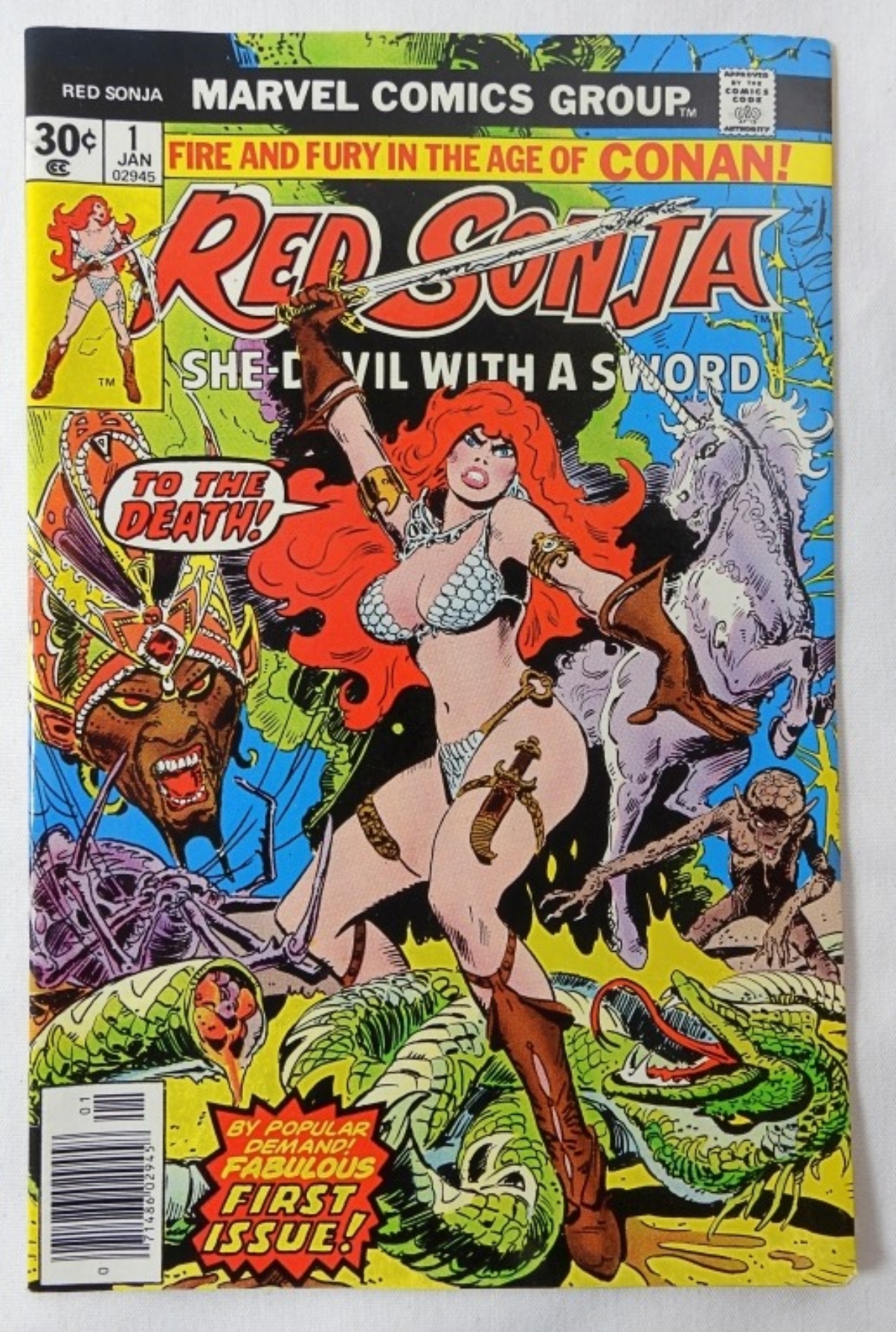 MARVEL COMICS- 1976- RED SONJA- NO. 1-IN GOOD CONDITION. THIS COMIC DOES SHOW SOME WEAR, PREOWNED.